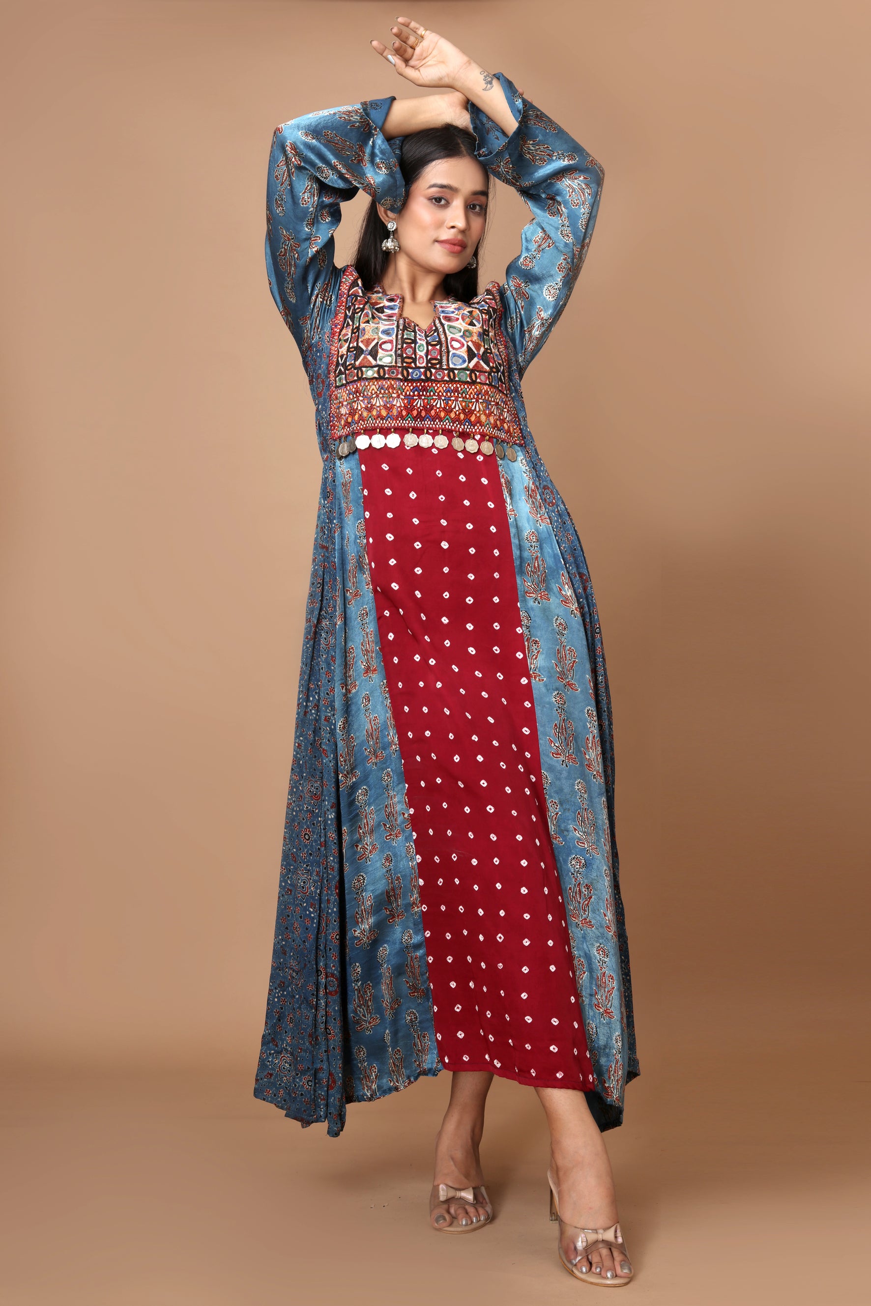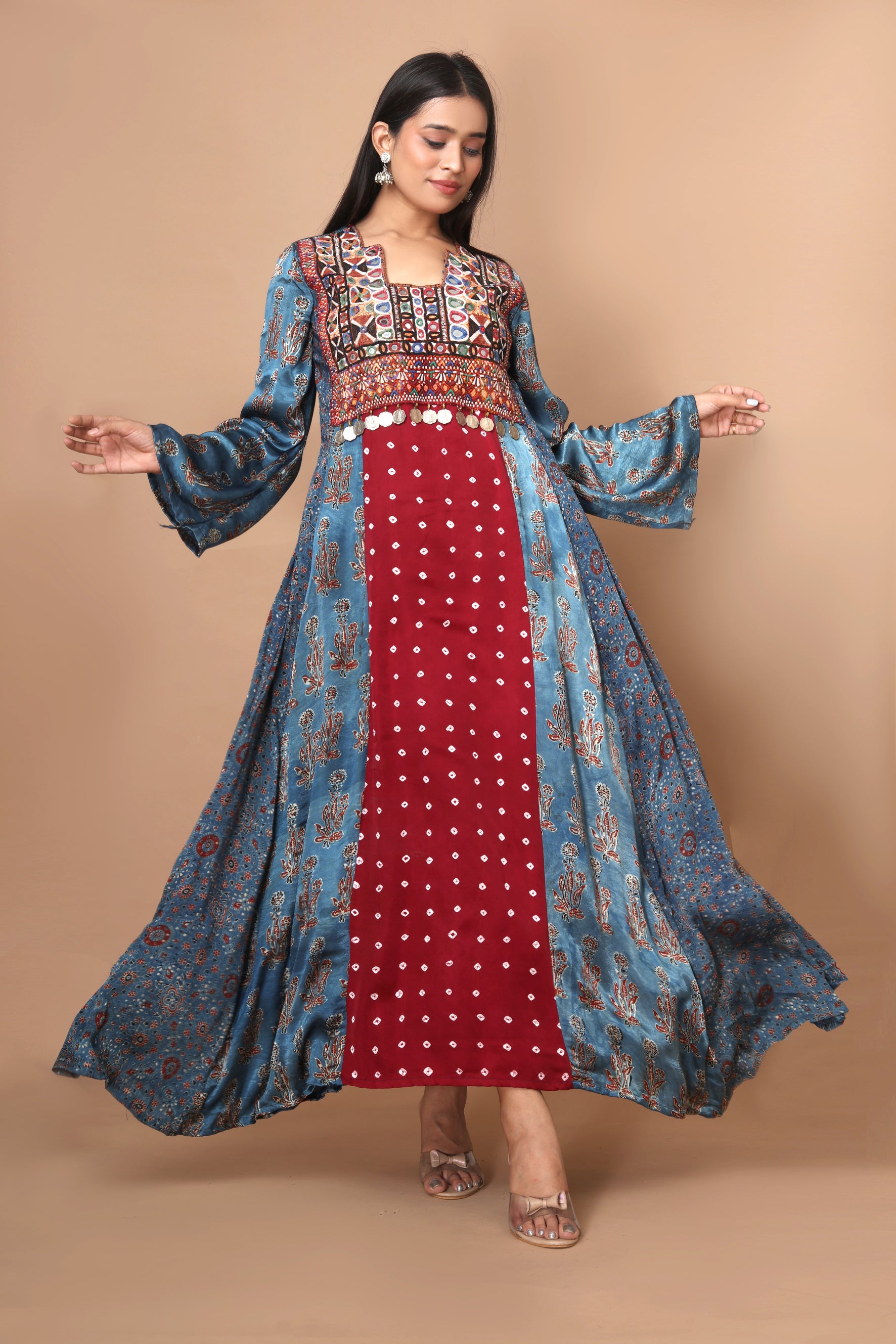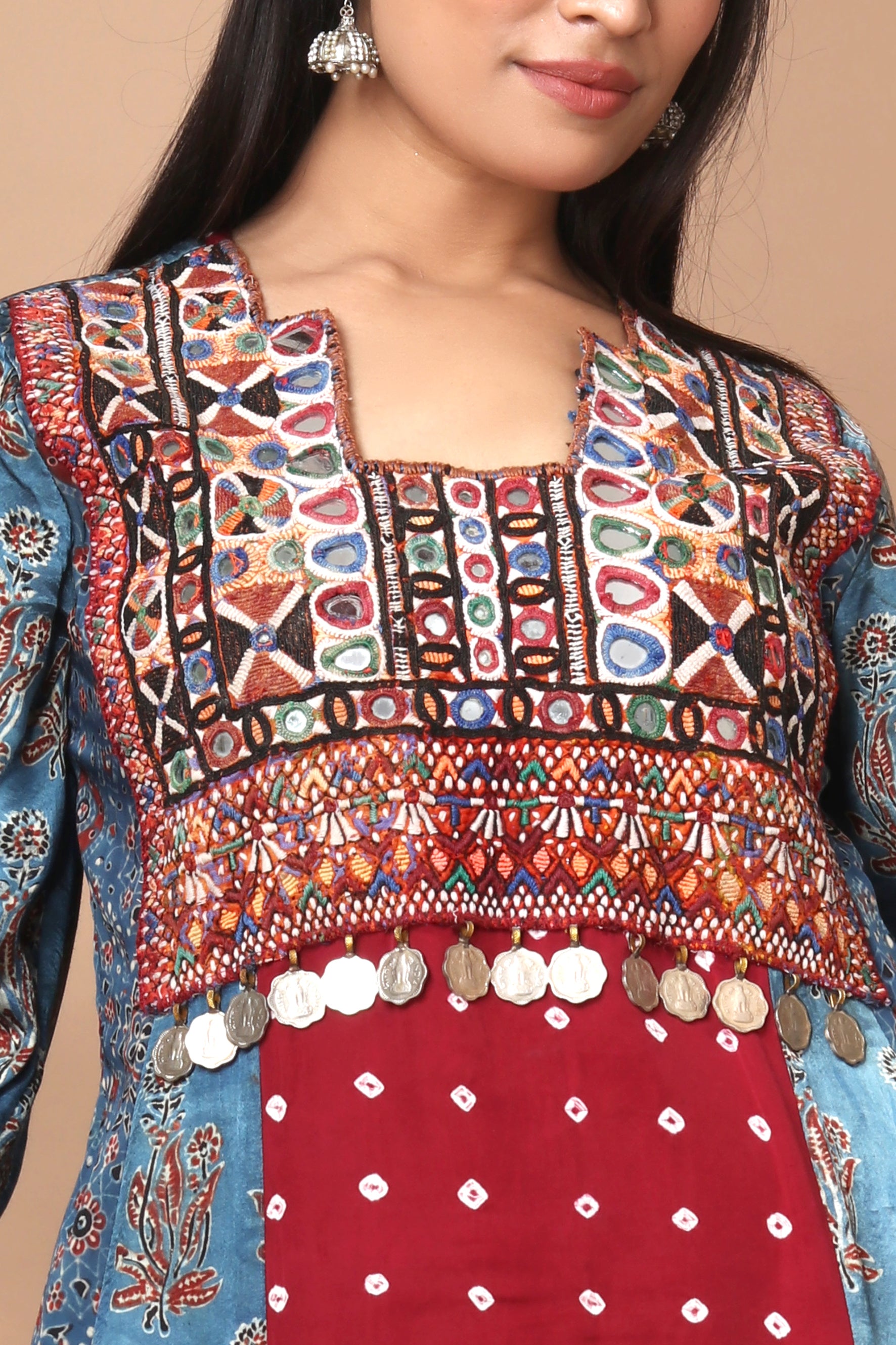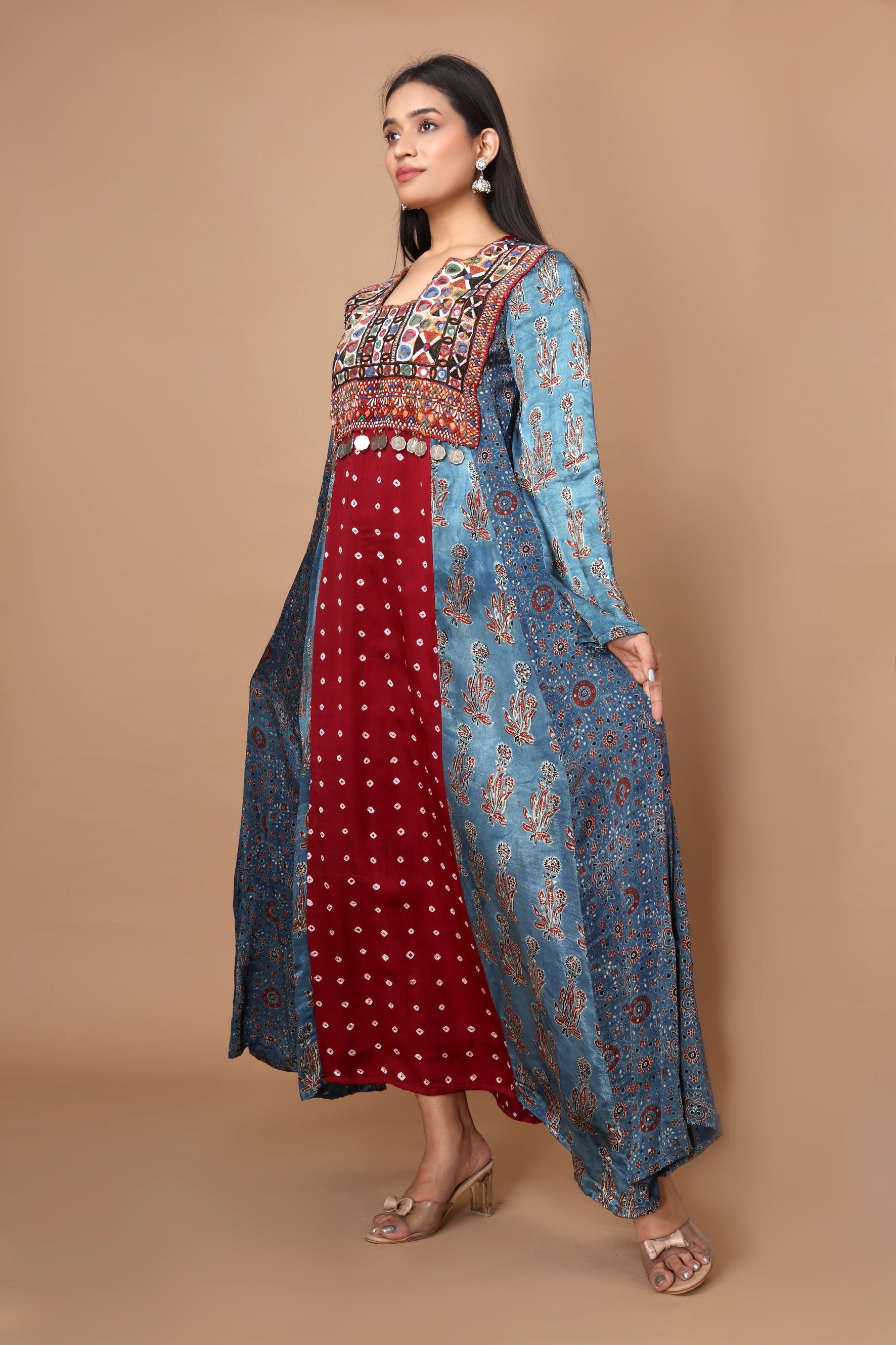 Crafted from luxurious modal silk, this dress showcases a fusion of hand block printed Ajrakh, hand-tied Bandhani, and intricate vintage Kutchi patchwork adorned with vintage coins.