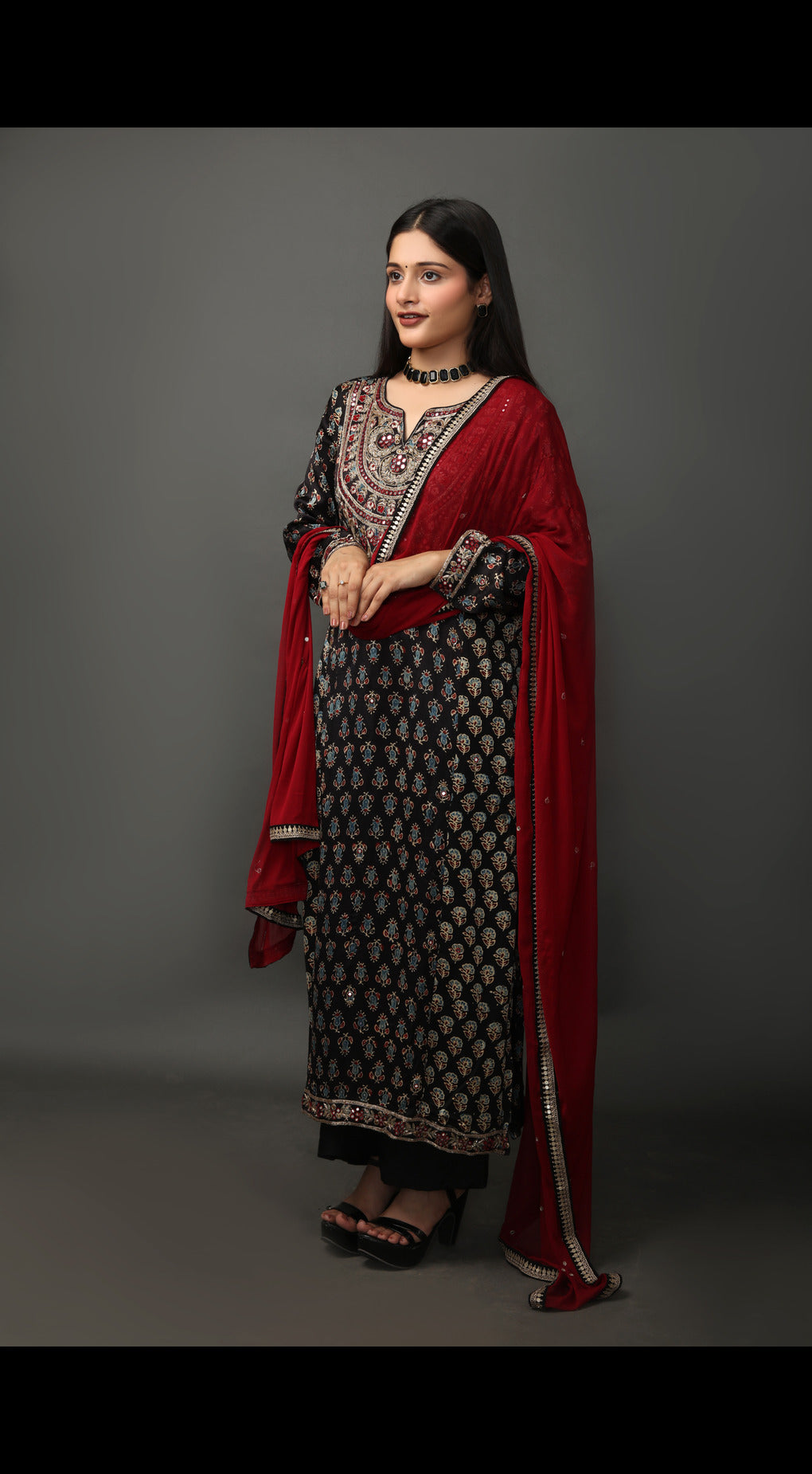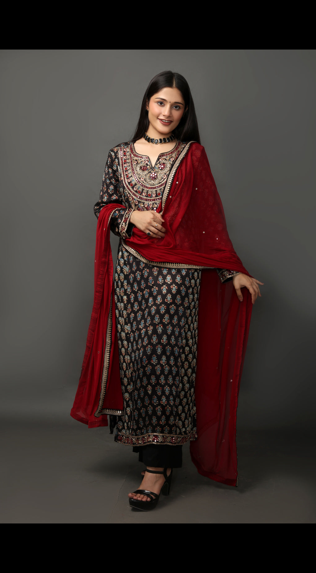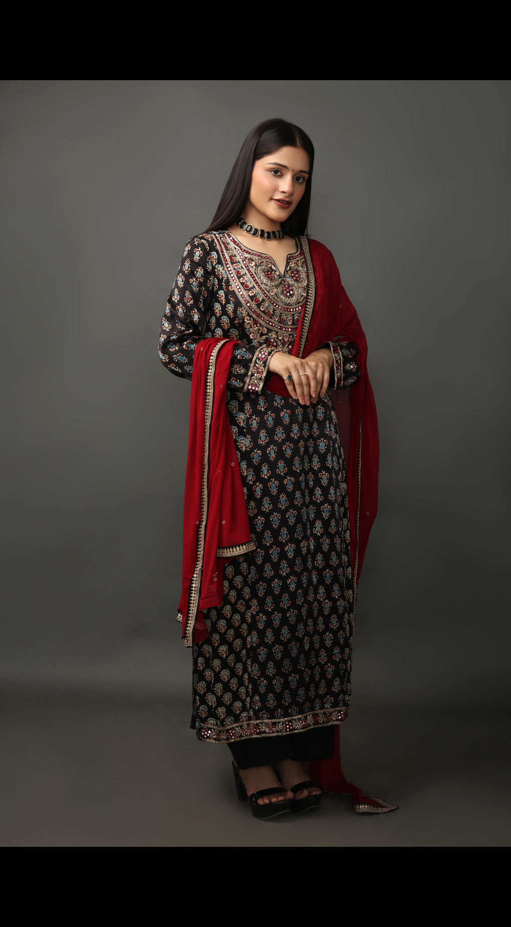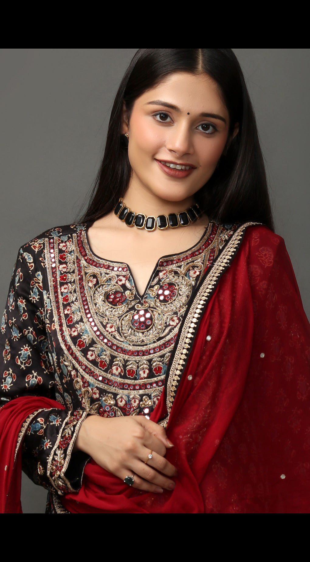 Ajrakh Print Hand Embroidered Suit Set with Dupatta