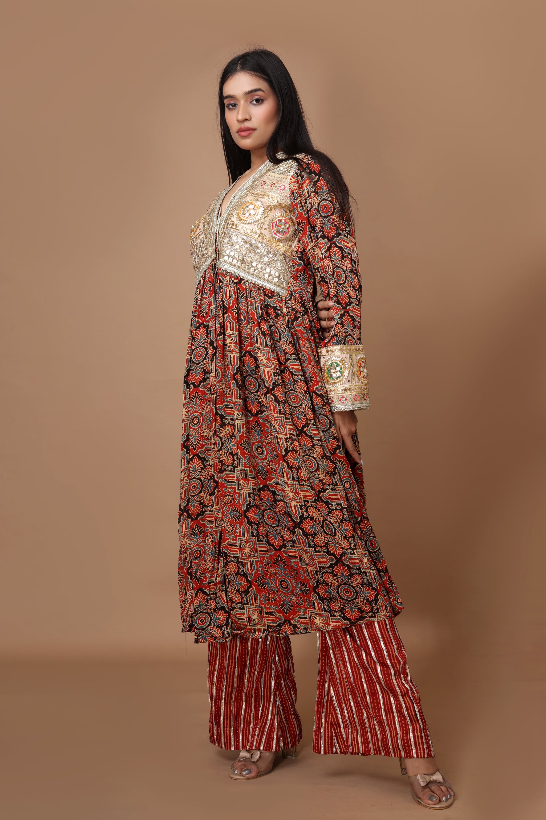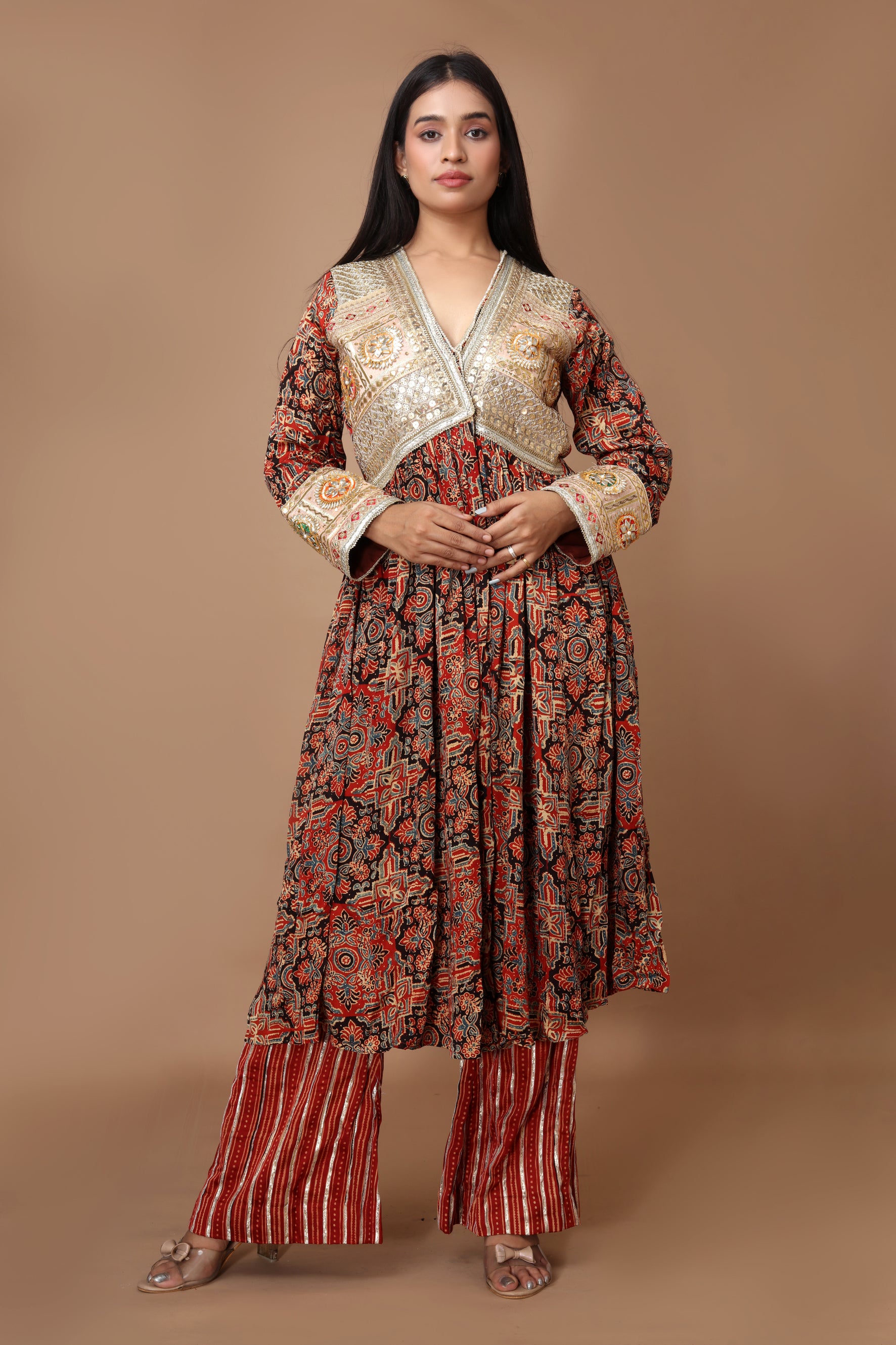 Earthy Red Ajrakh Jacket Set with Hand Embroidered Gota Patti.