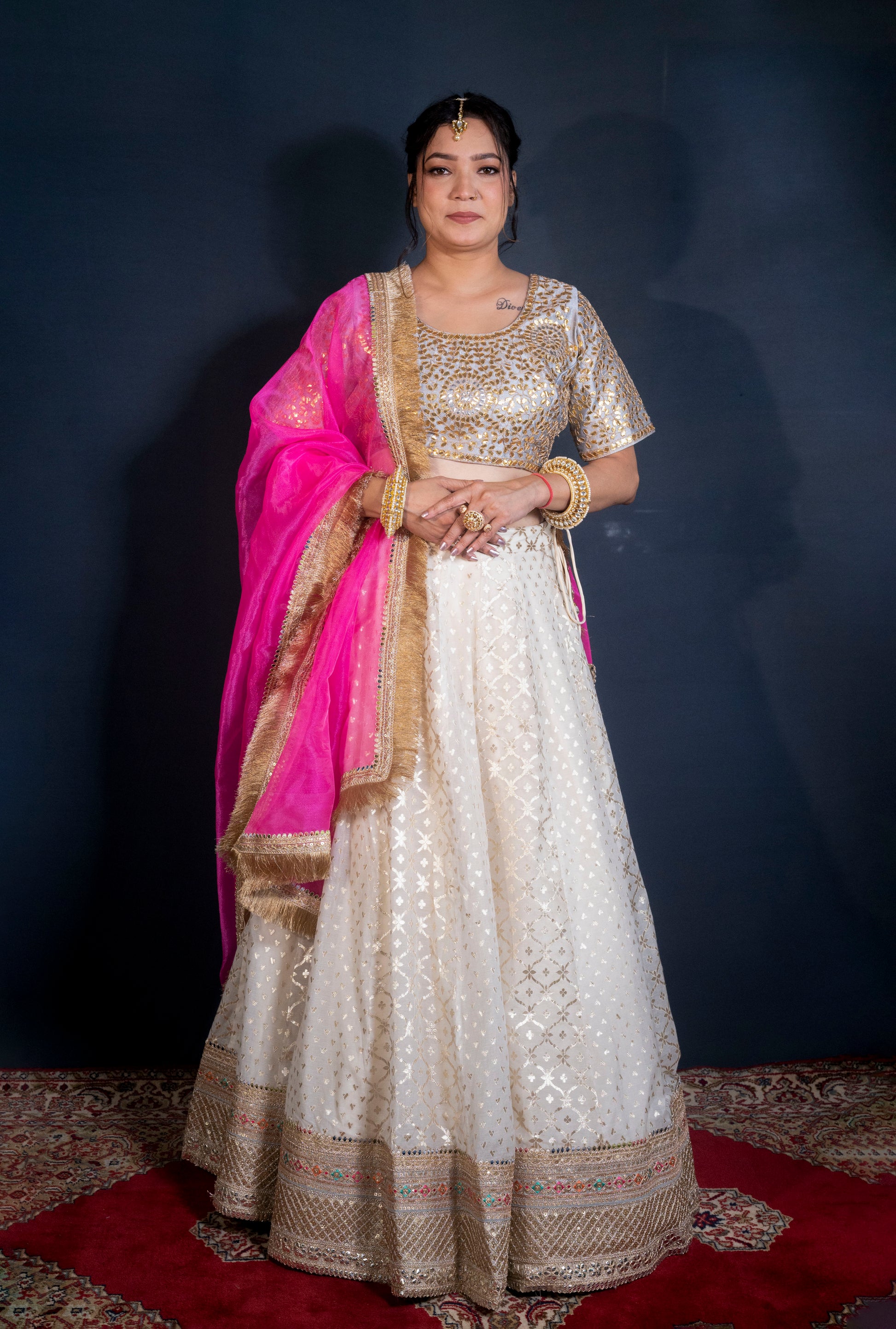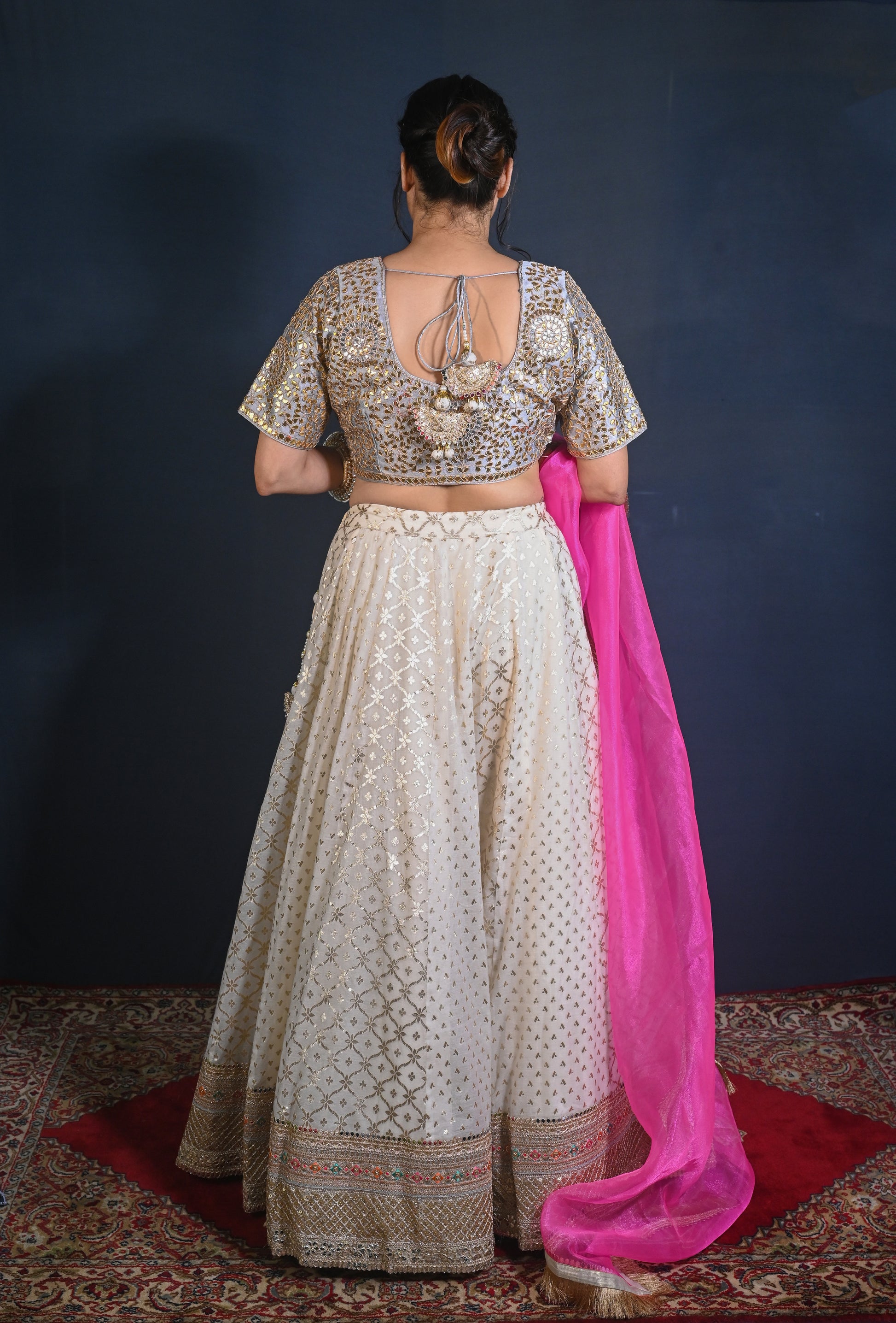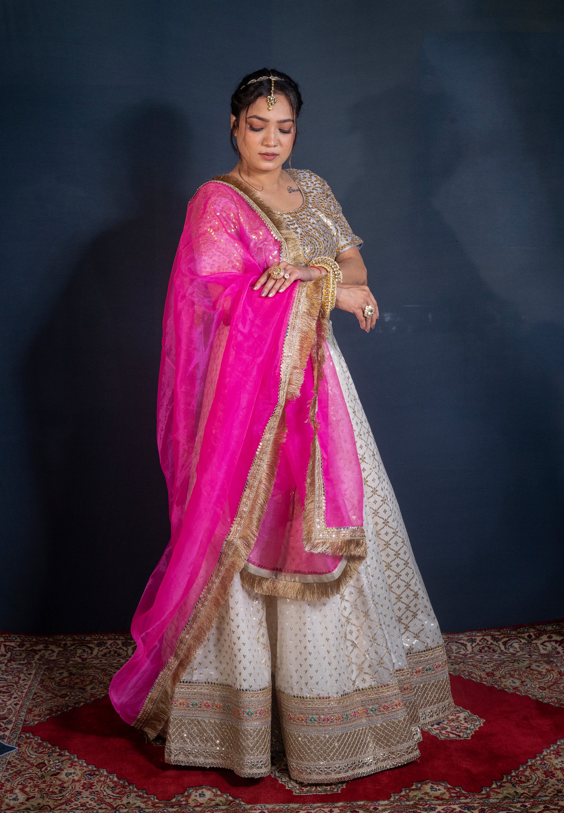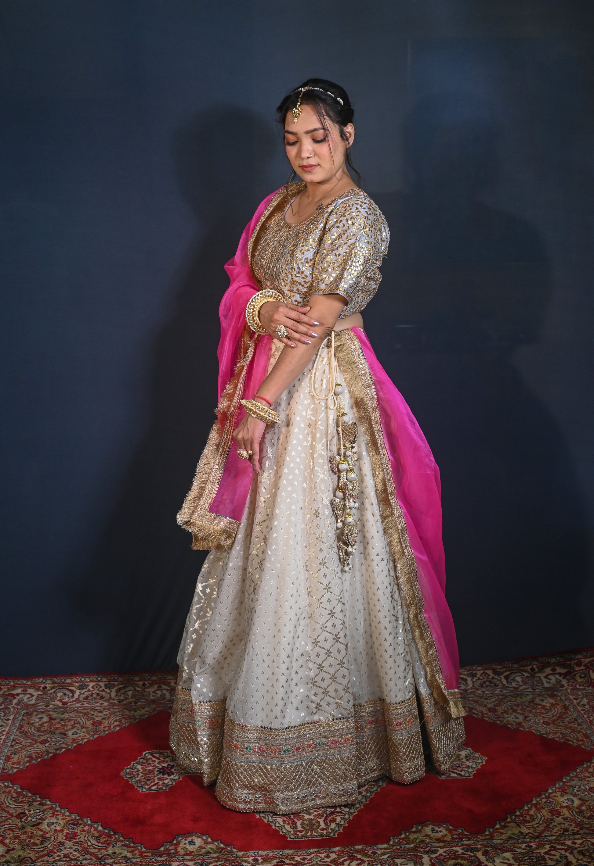 Banarasi Chanderi Lehenga with hand embroidered Gotapatti blouse and Fuchsia organza dupatta