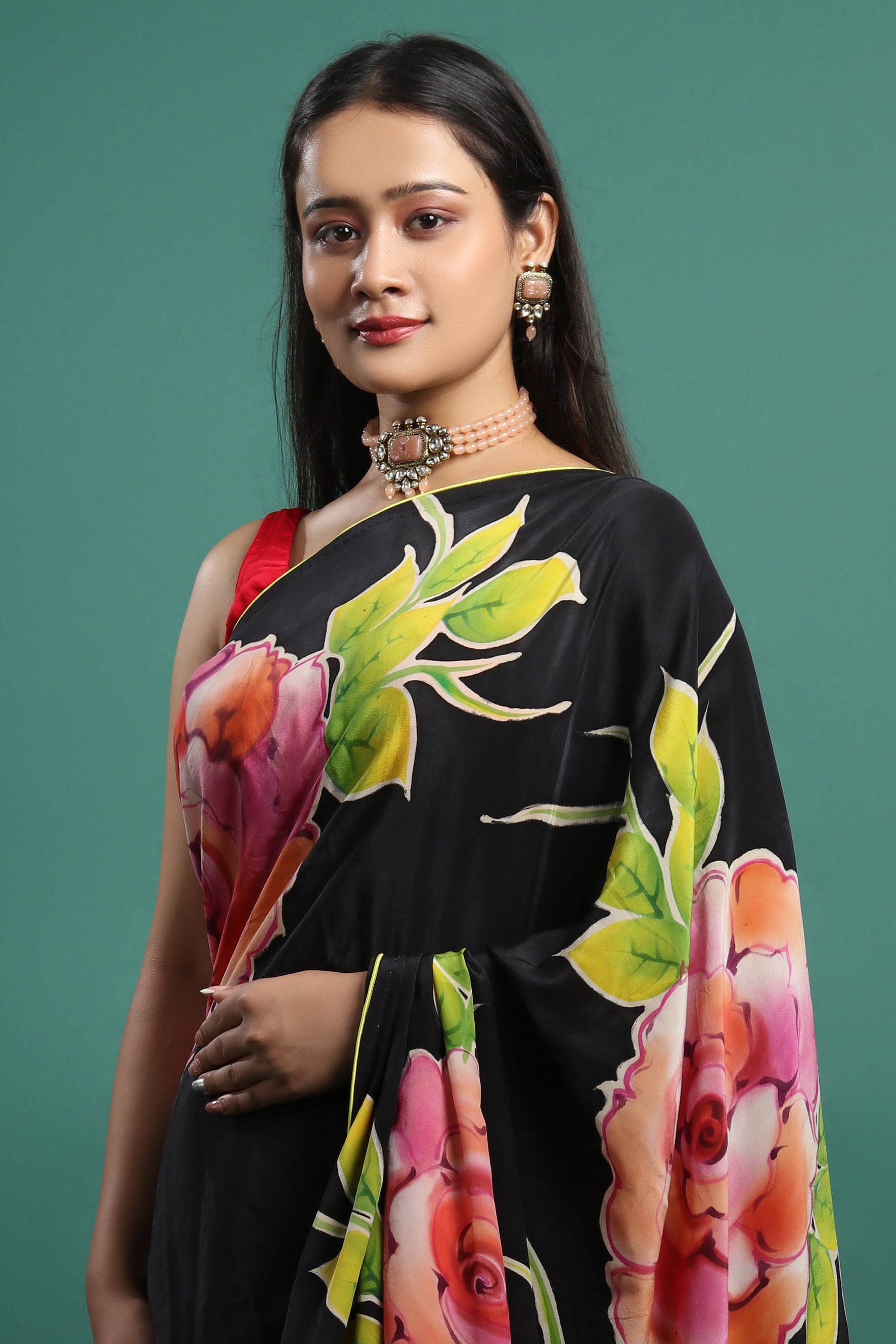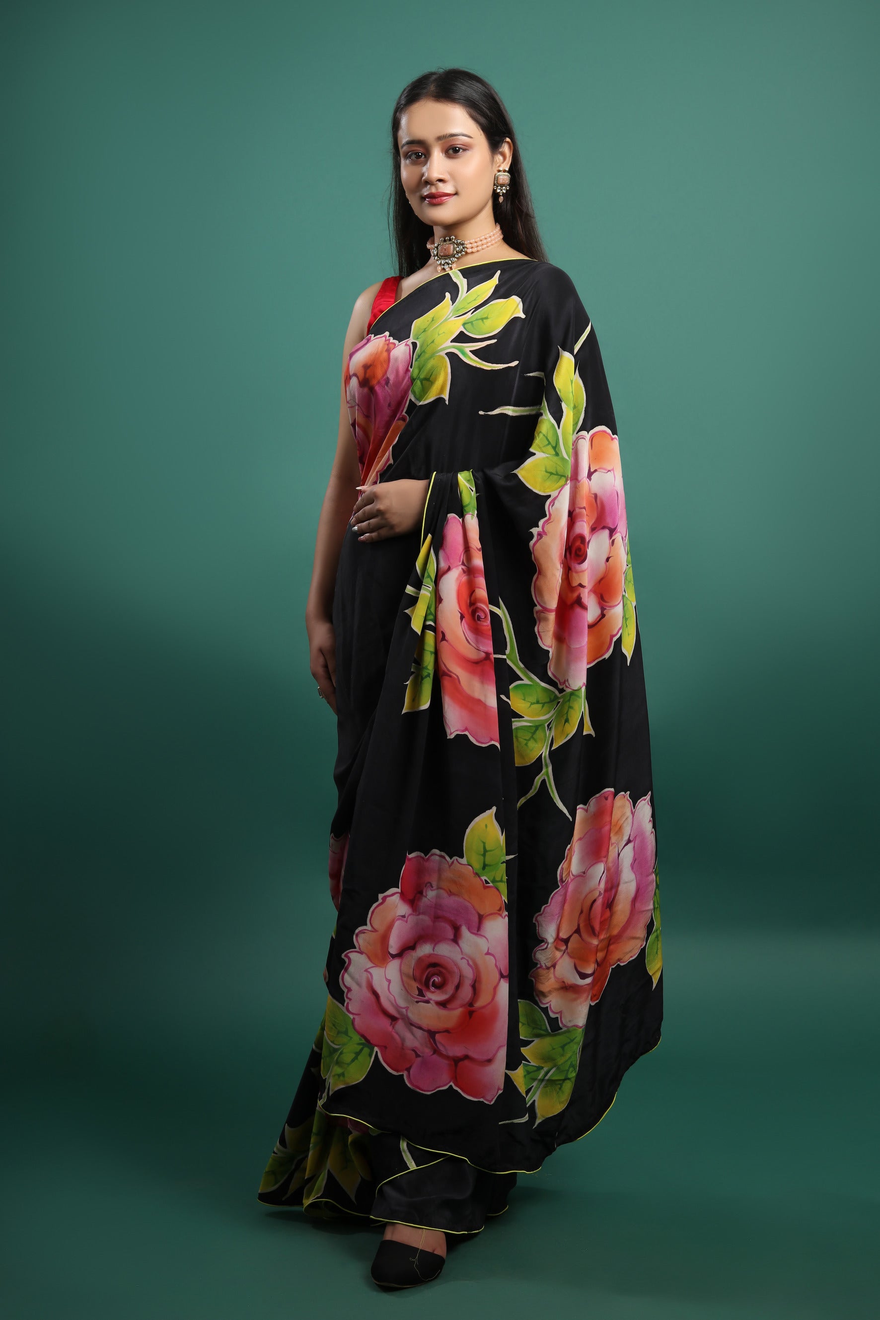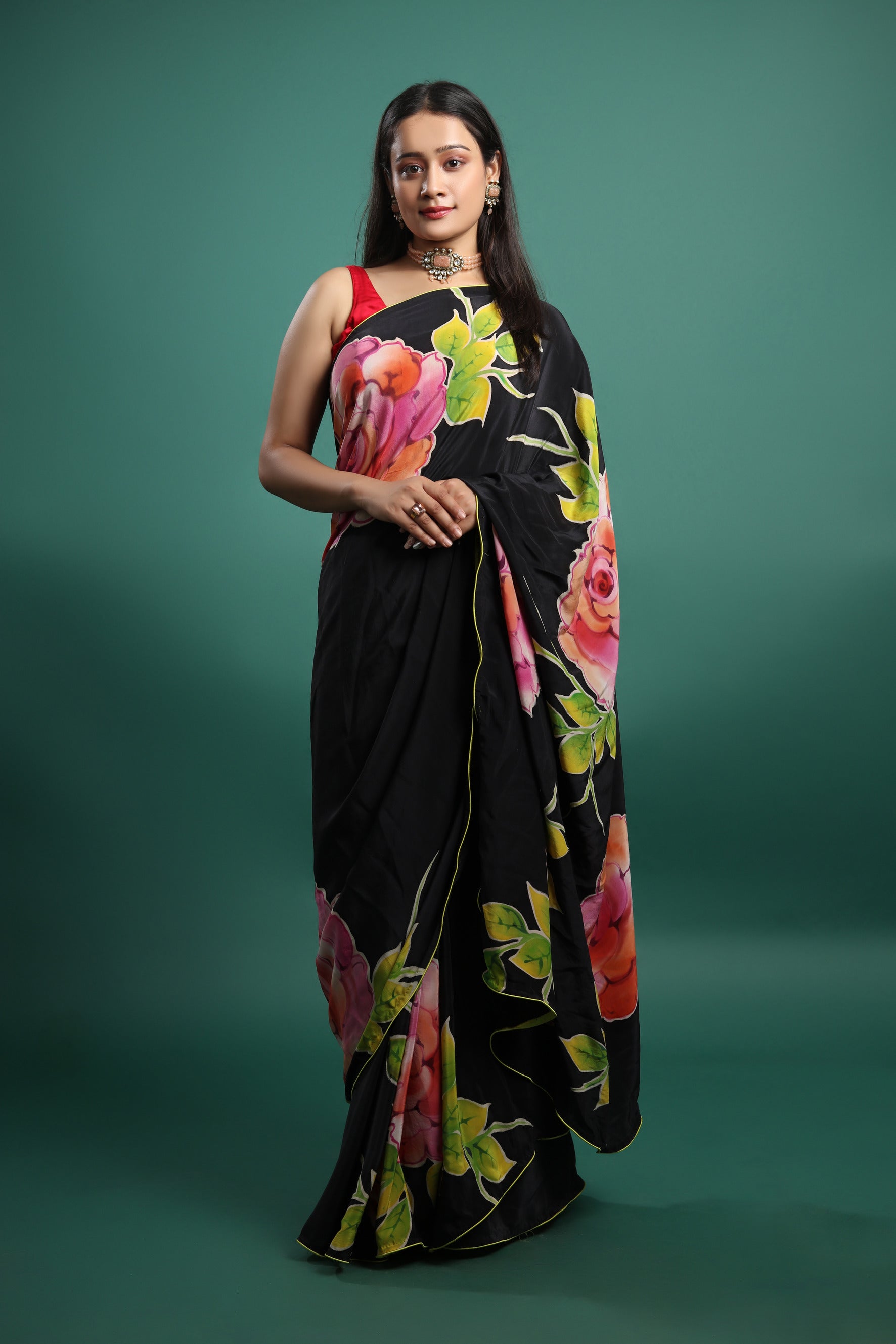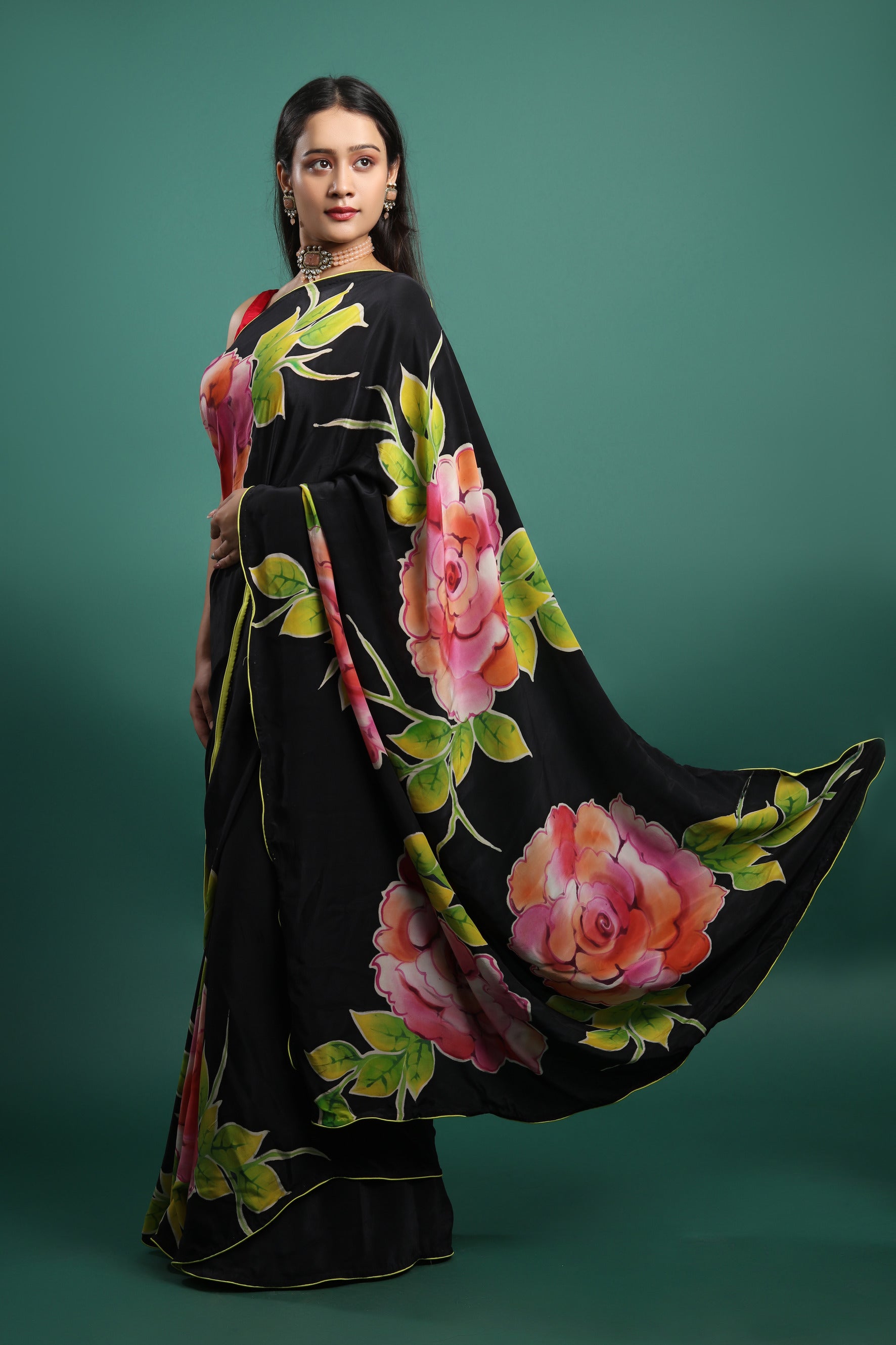 This saree showcases a stunning hand-painted floral design using French silk dyes on pure silk satin. The vivid colors and luxurious texture make this saree a perfect choice for those who appreciate artistry in their wardrobe. The rich drape and softness of the silk satin enhance the beauty of the floral patterns, making it ideal for special occasions.