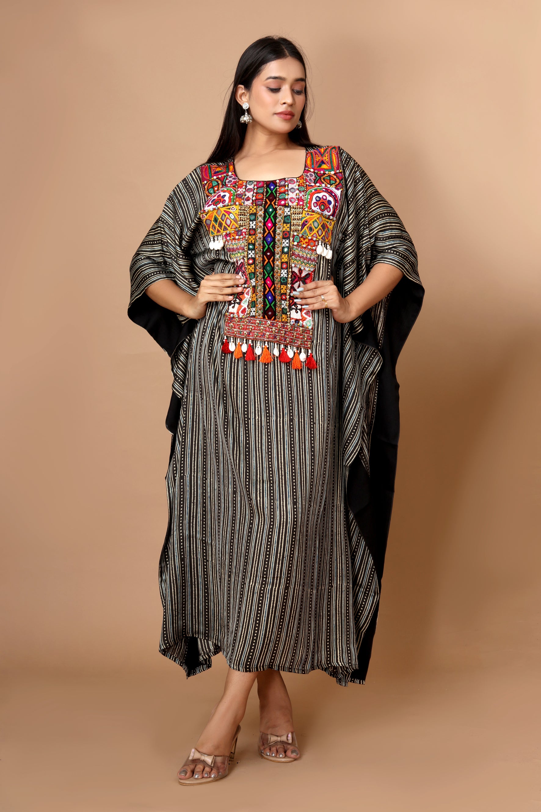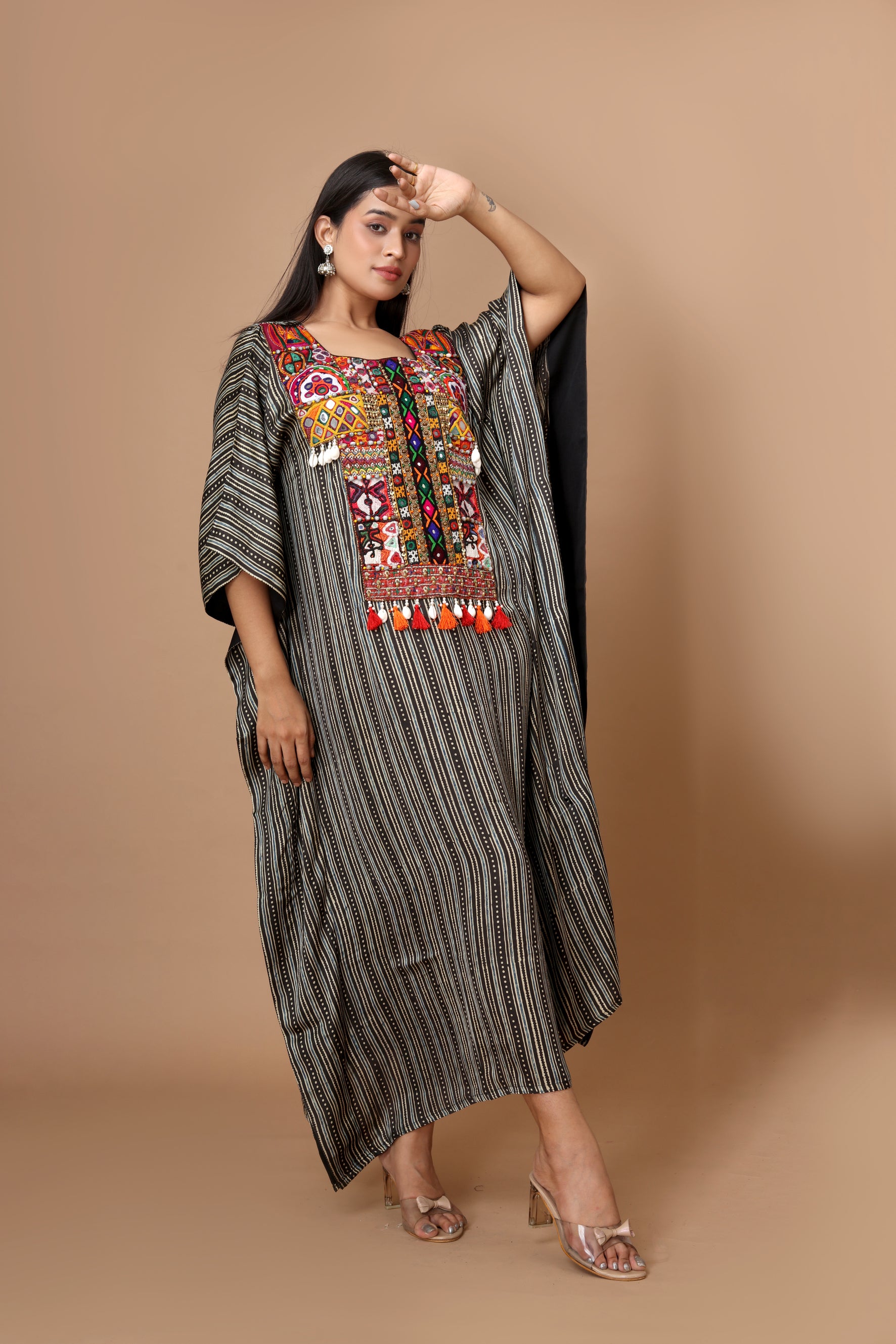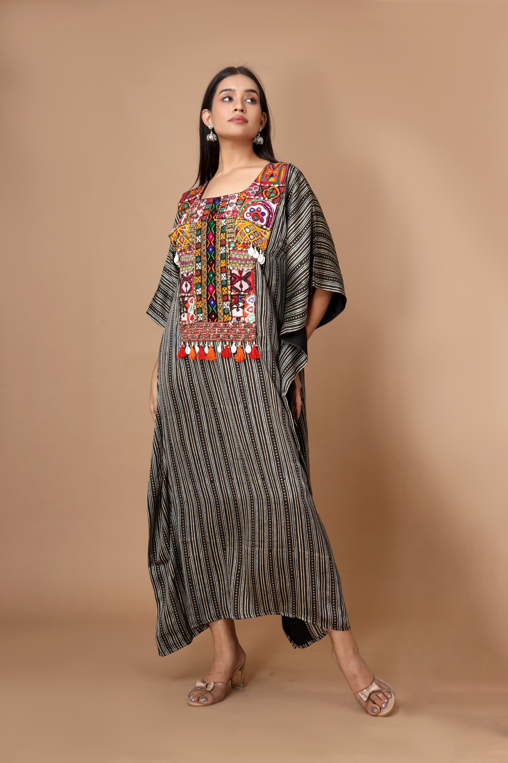 Modal Silk Kaftan with Hand Block Printed Ajrakh and Vintage Kutchi Patchwork