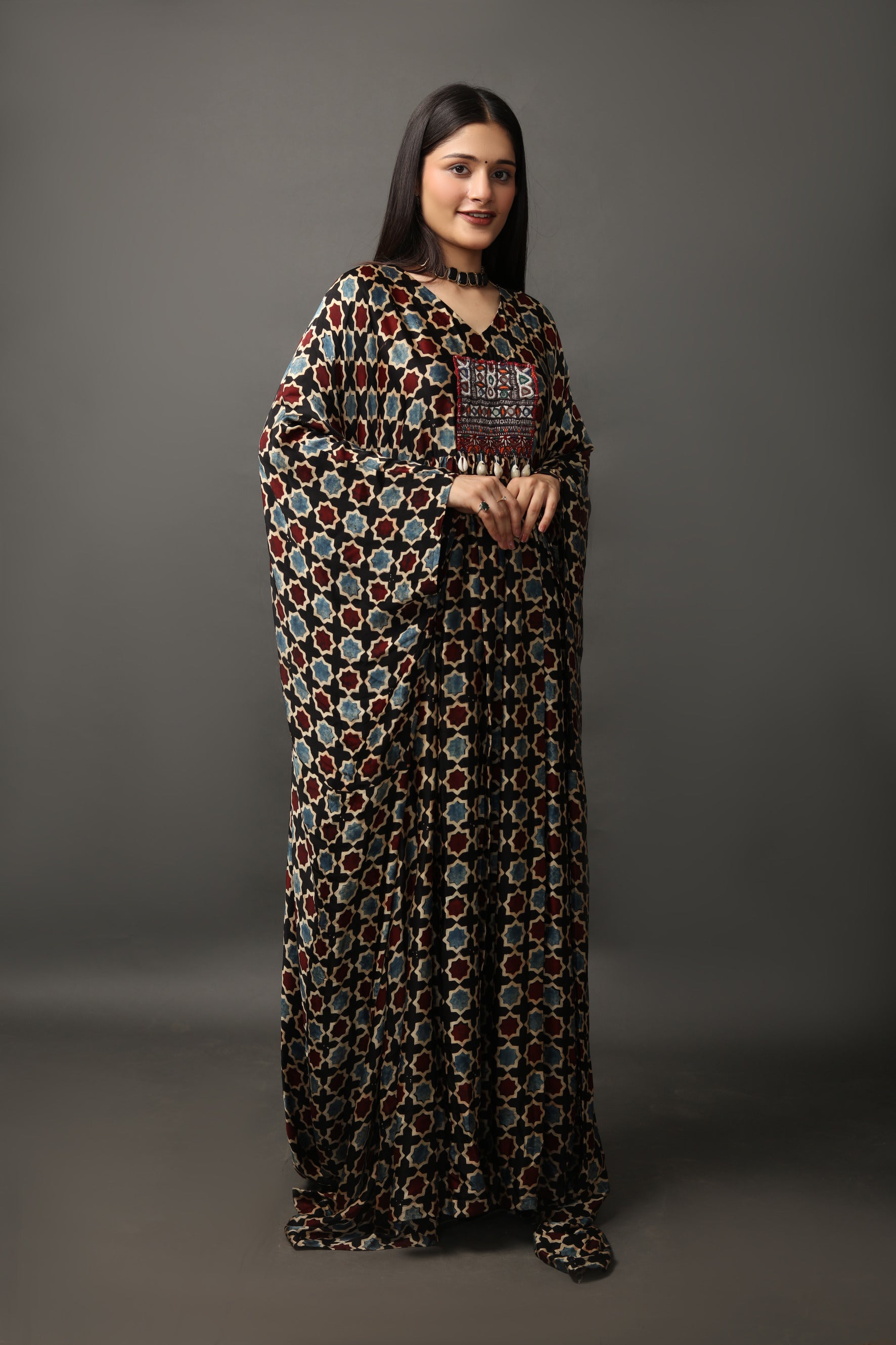 Ajrakh Printed Kaftan with Kutchi Embroidery