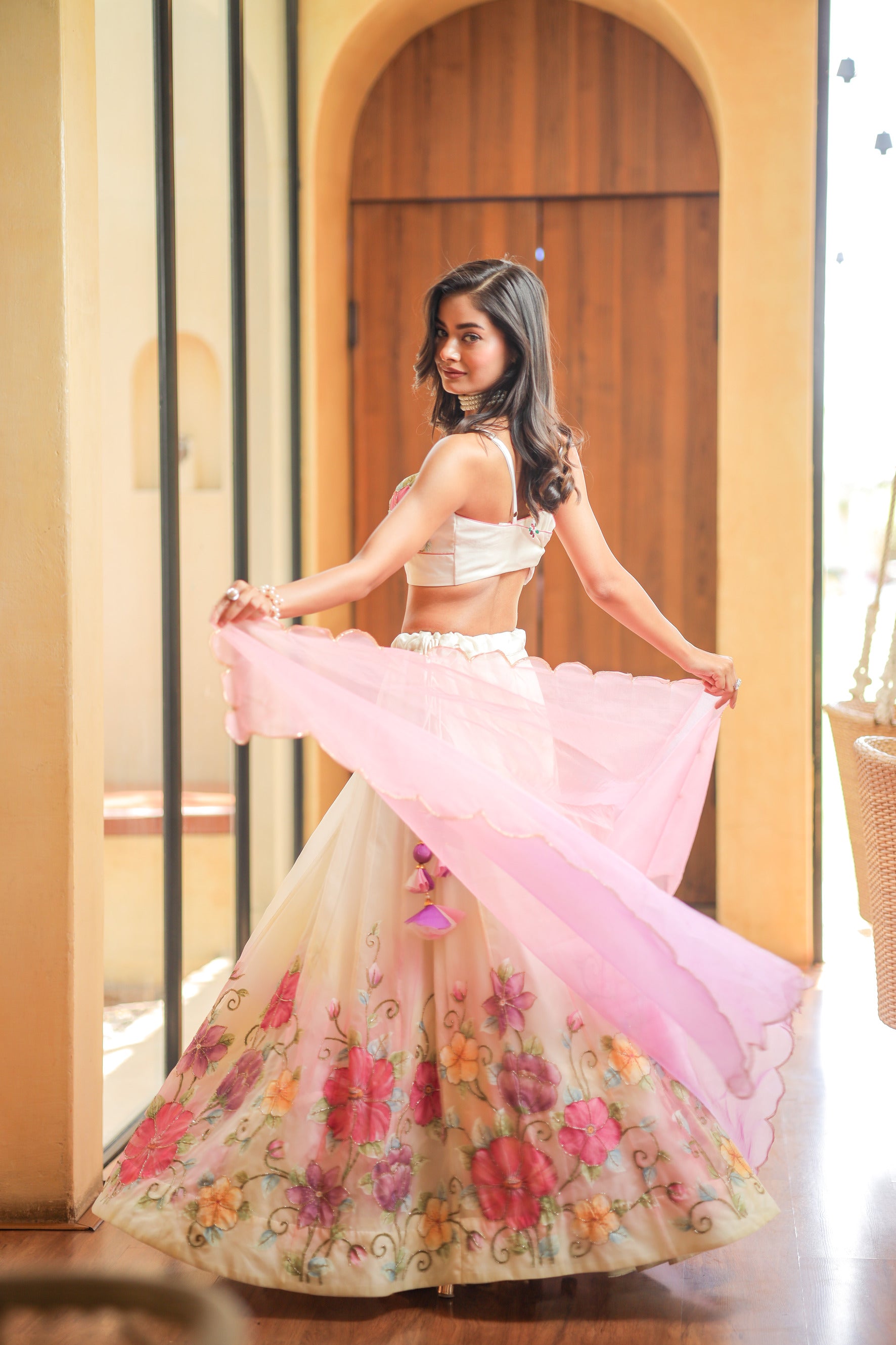 Hand-Painted and Embroidered Silk Organza Lehenga Set with Dupatta