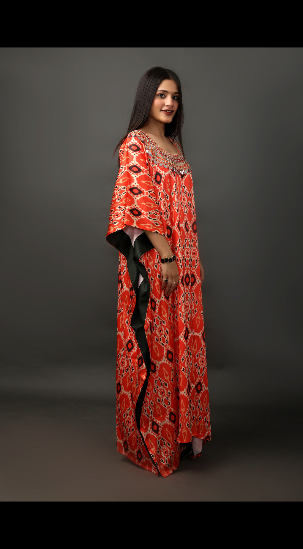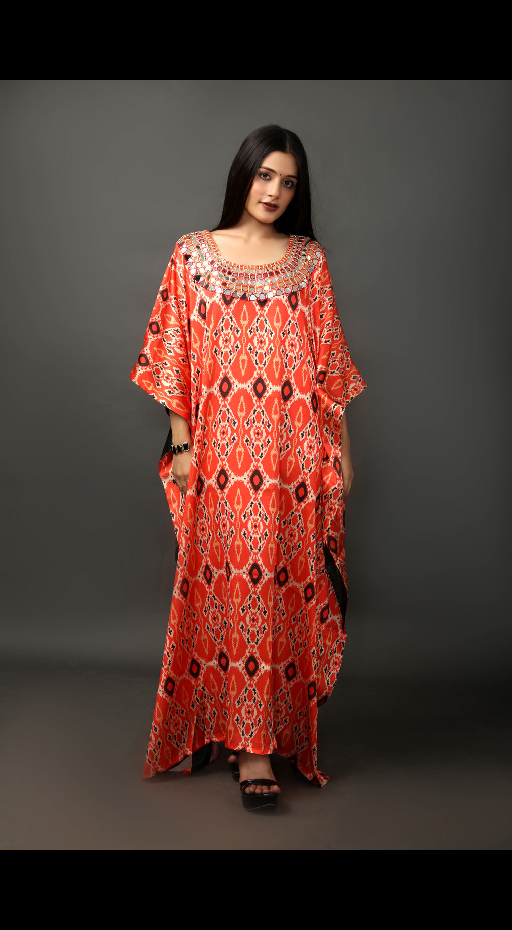 Stand out in this stunning kaftan featuring a bold digital print and intricate hand-embroidered detailing on the neckline. Crafted with flowing fabric for comfort and ease, this dress is perfect for any occasion where style meets relaxation. The vibrant print and handwork offer a unique touch, making it an ideal choice for casual outings, festive events, or resort wear.