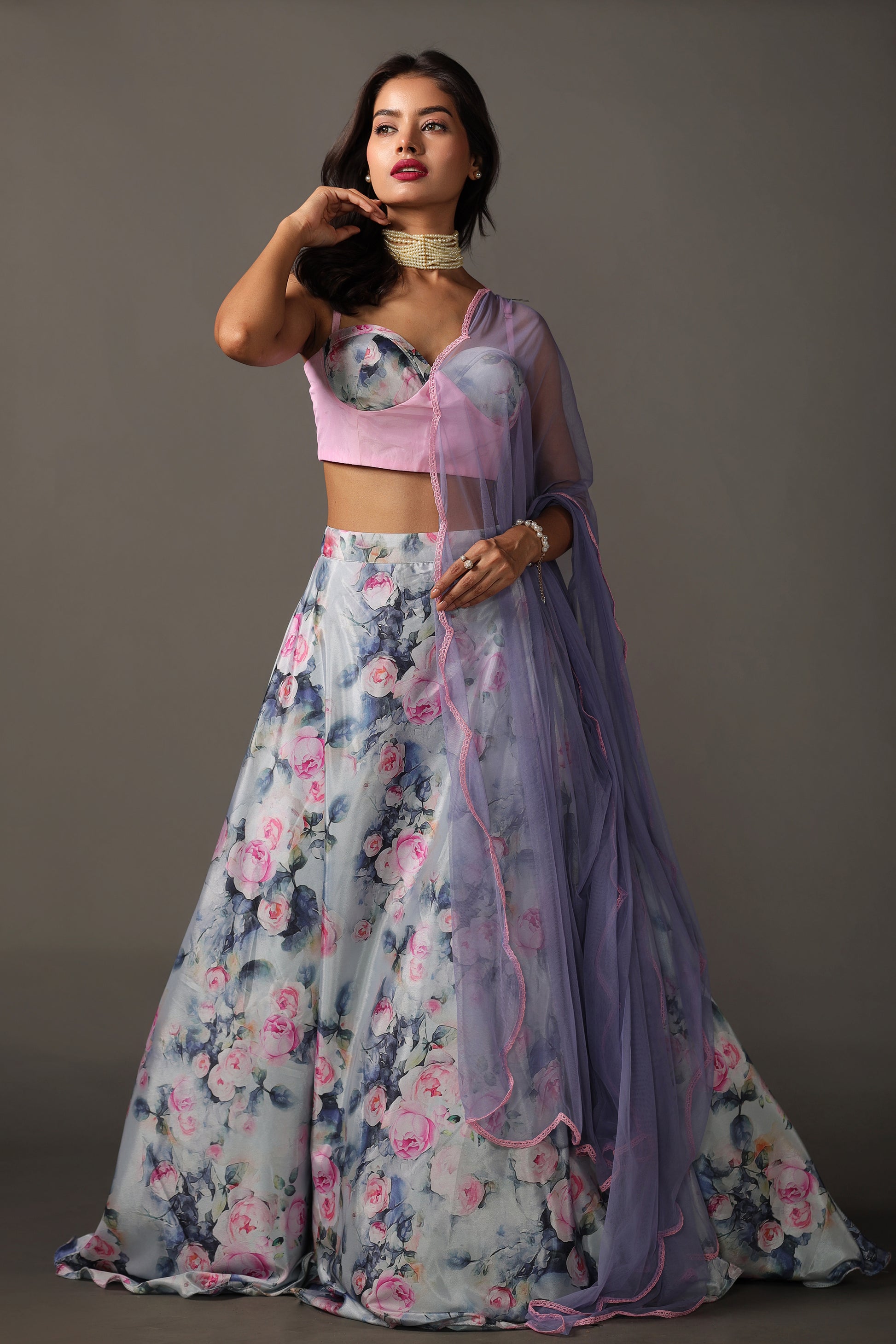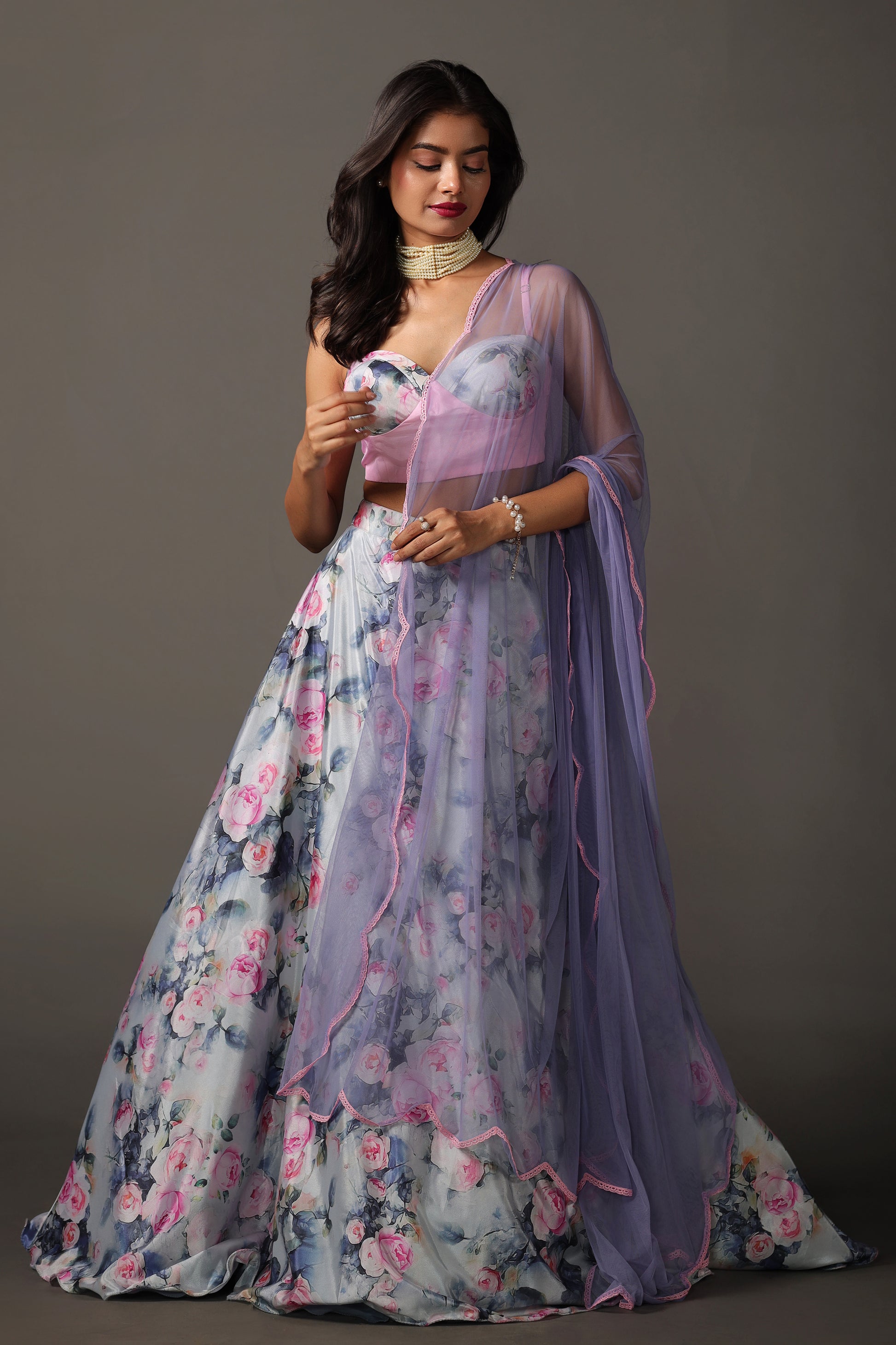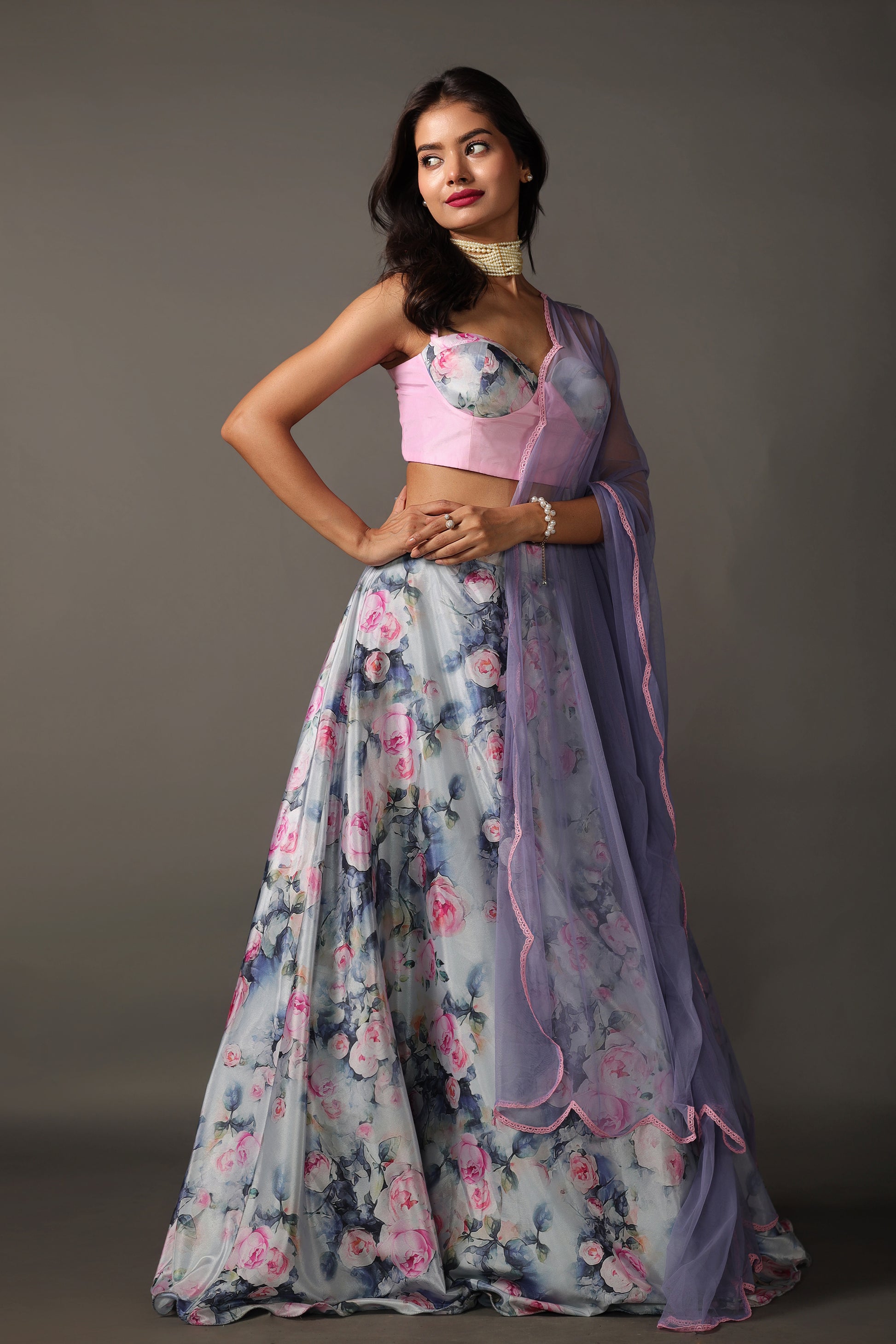 Step into elegance with our enchanting floral print lehenga choli, paired with a delicate lavender dupatta. The vibrant floral patterns on the lehenga exude charm and grace, perfect for festive occasions and celebrations. The choli features a flattering cut, while the sheer dupatta adds a touch of ethereal beauty. Crafted from premium fabric, this ensemble ensures comfort and style, making it a stunning addition to your ethnic wardrobe.