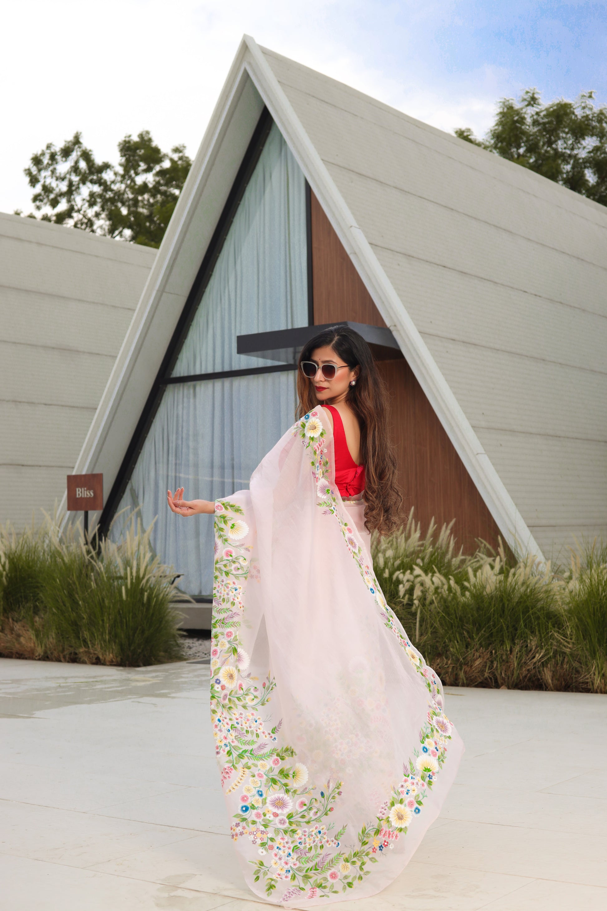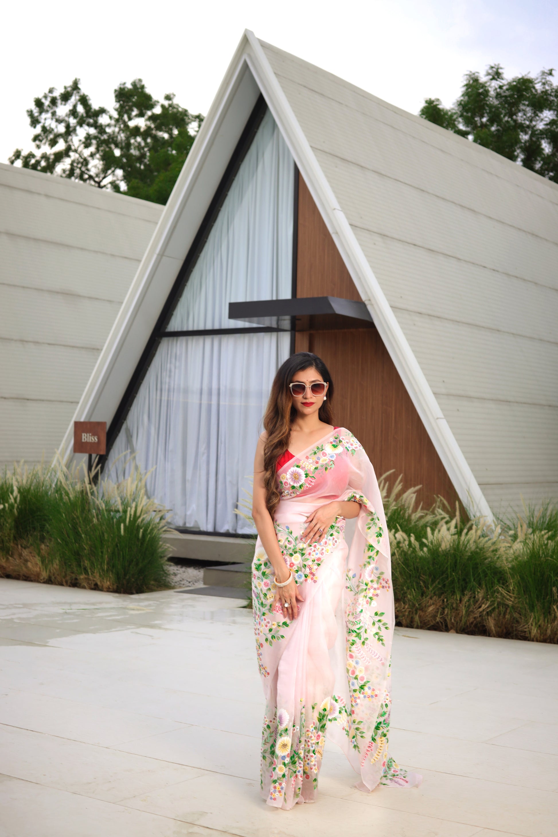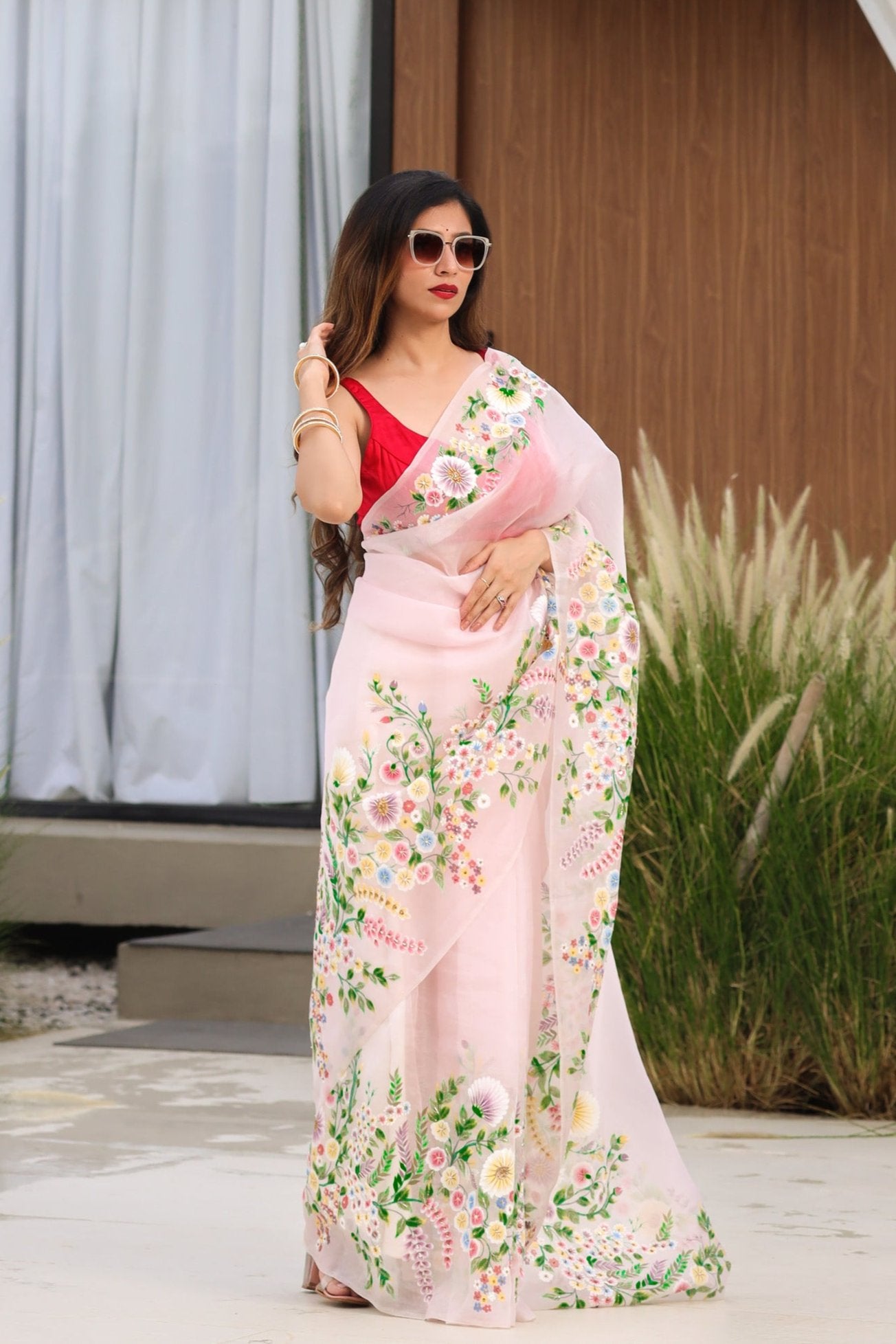 Elevate your style with this exquisite pure silk organza saree, meticulously hand-painted and hand-embroidered to perfection. The delicate fabric is adorned with intricate floral motifs, making it a piece of wearable art. The soft pink hue, combined with the vibrant colors of the detailed painting and embroidery, adds a touch of elegance and grace, perfect for weddings, festive occasions, or any special event where you want to stand out.