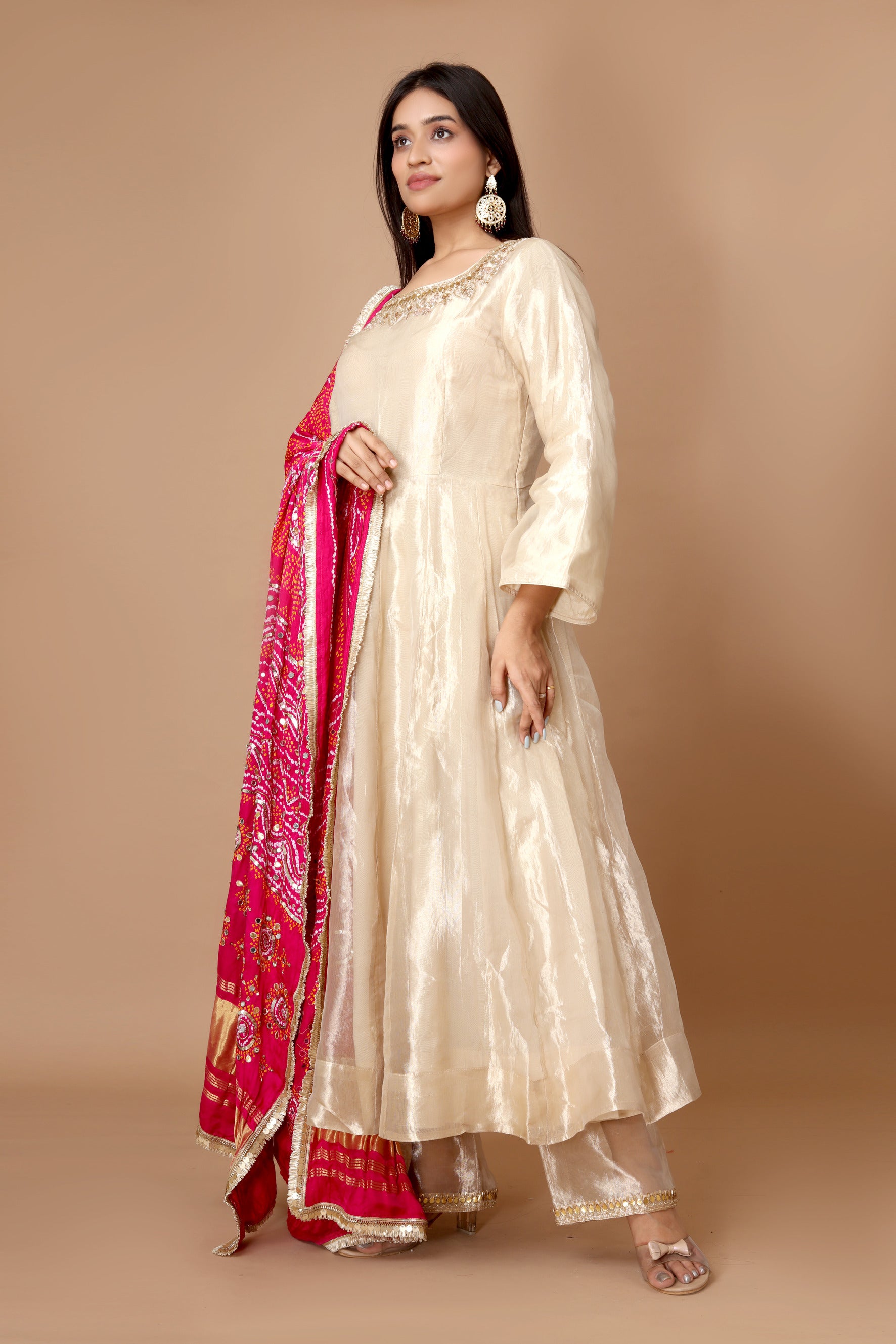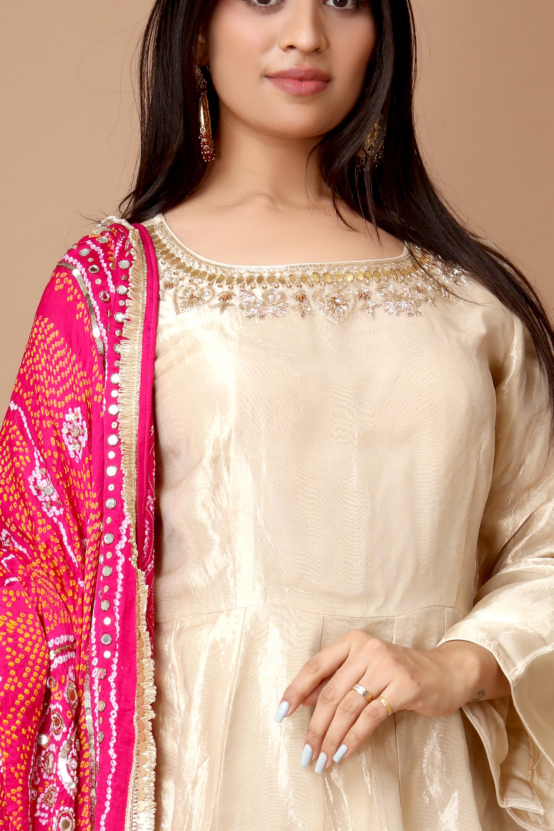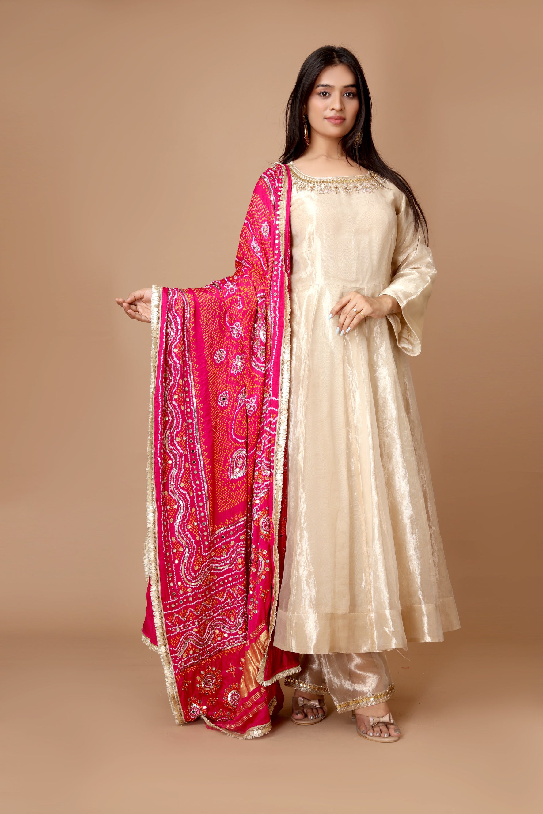 Gold Banarasi Silk Anarkali Set with Handwoven Embroidery & Fuchsia Pink Dupatta