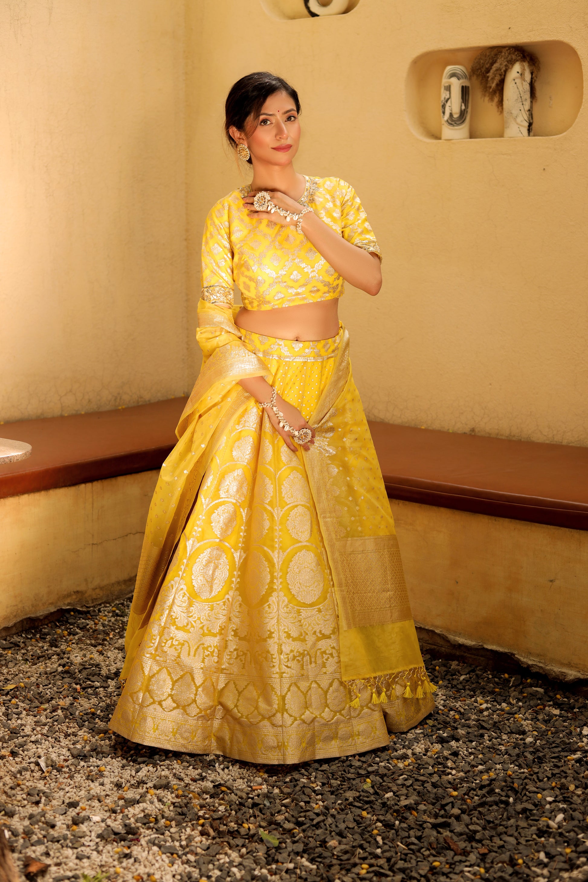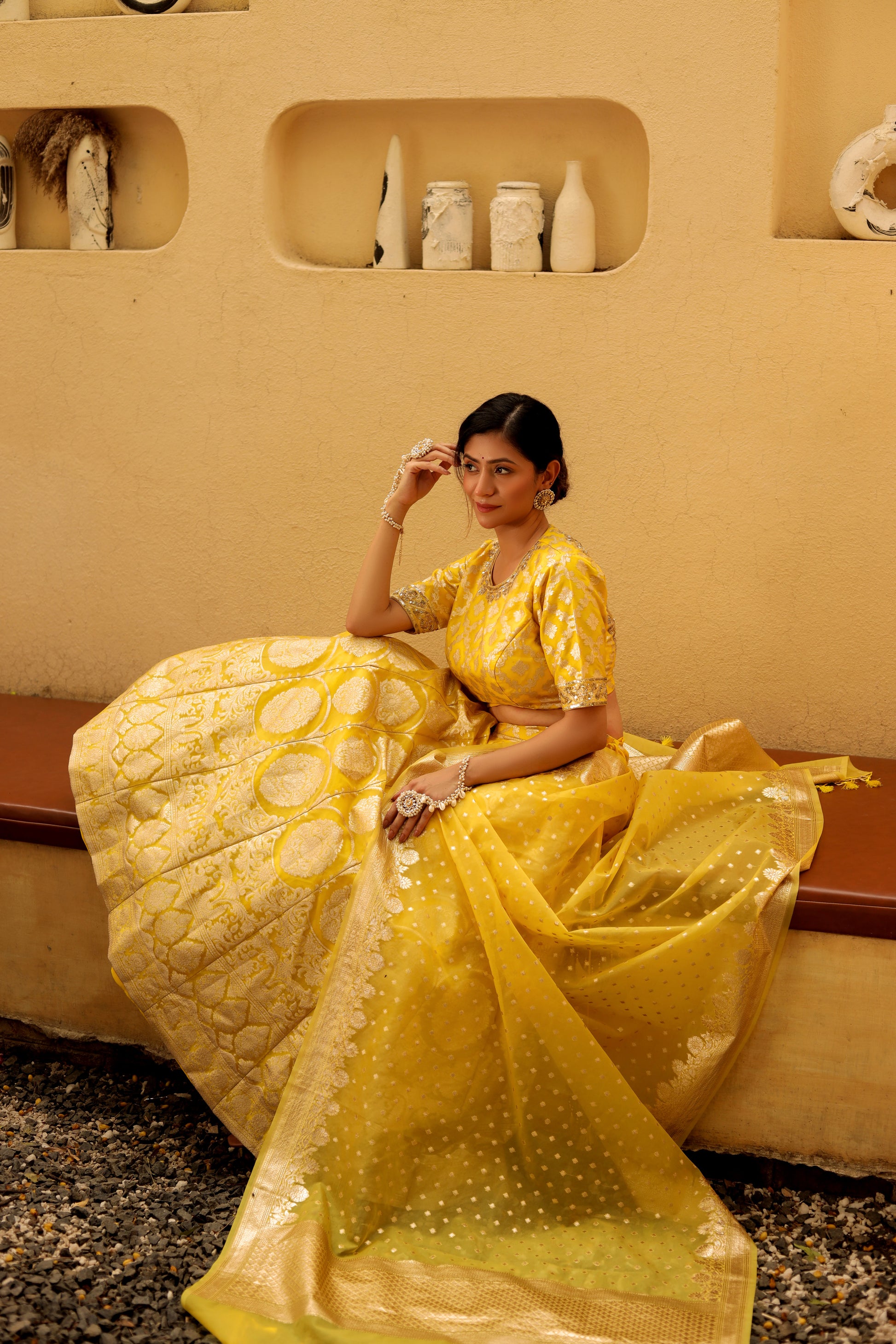 Turmeric Yellow Benarsi Organza Lehenga Set with Hand Embroidery