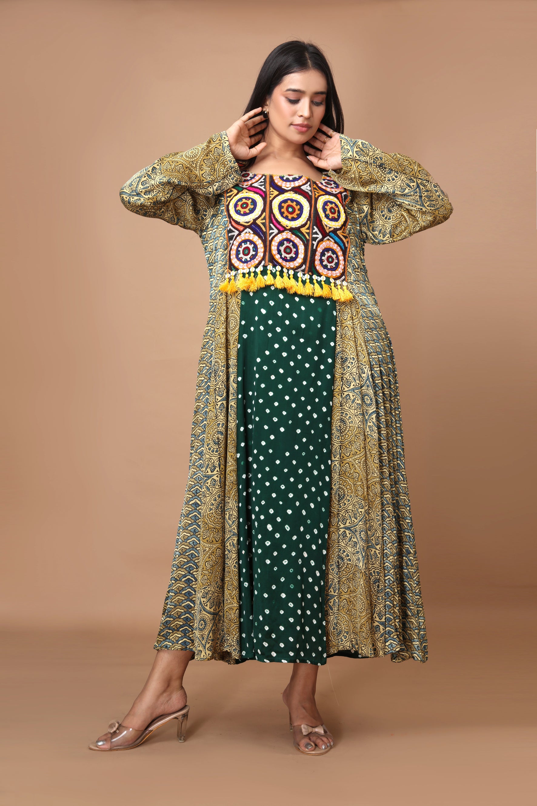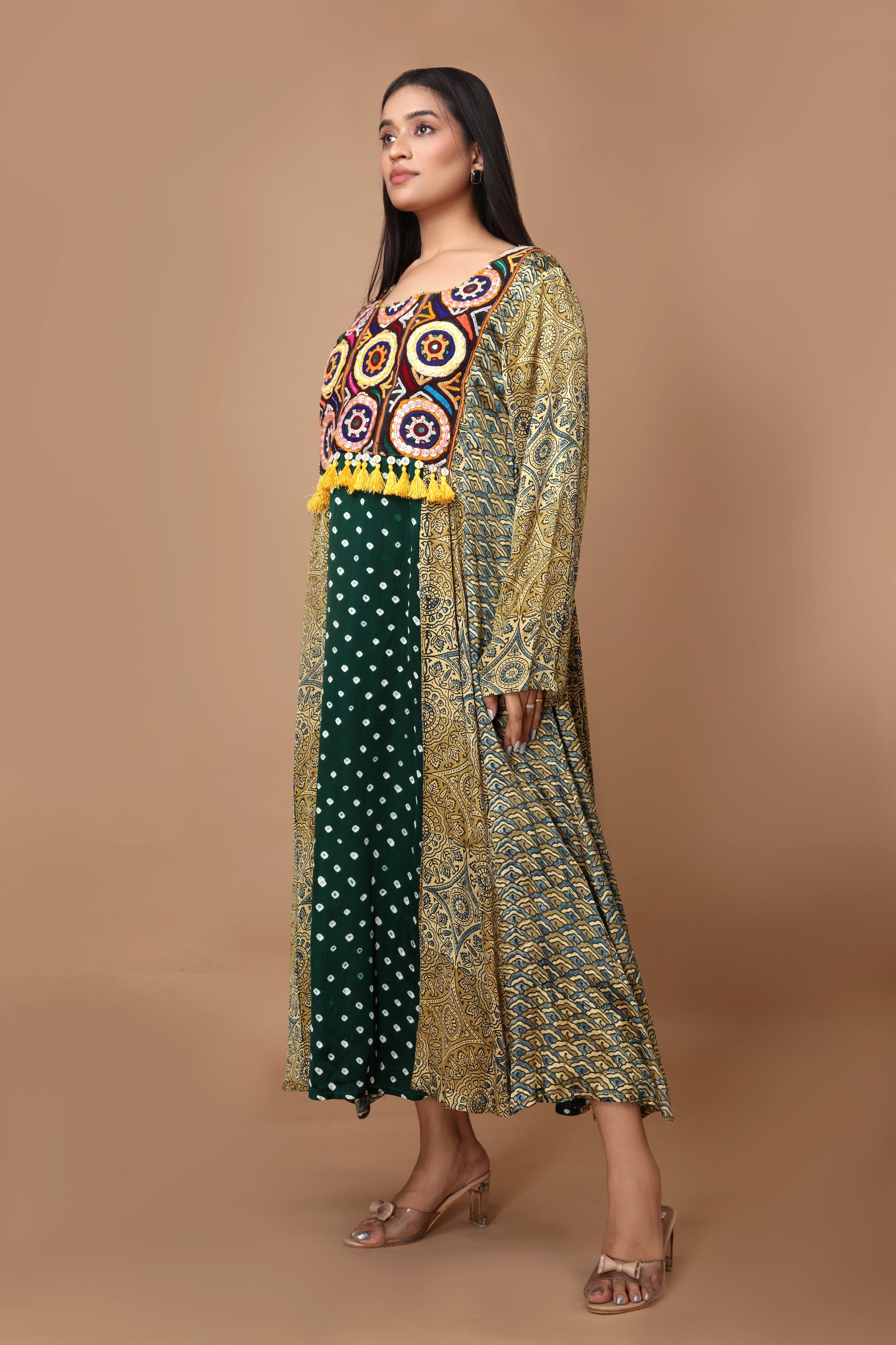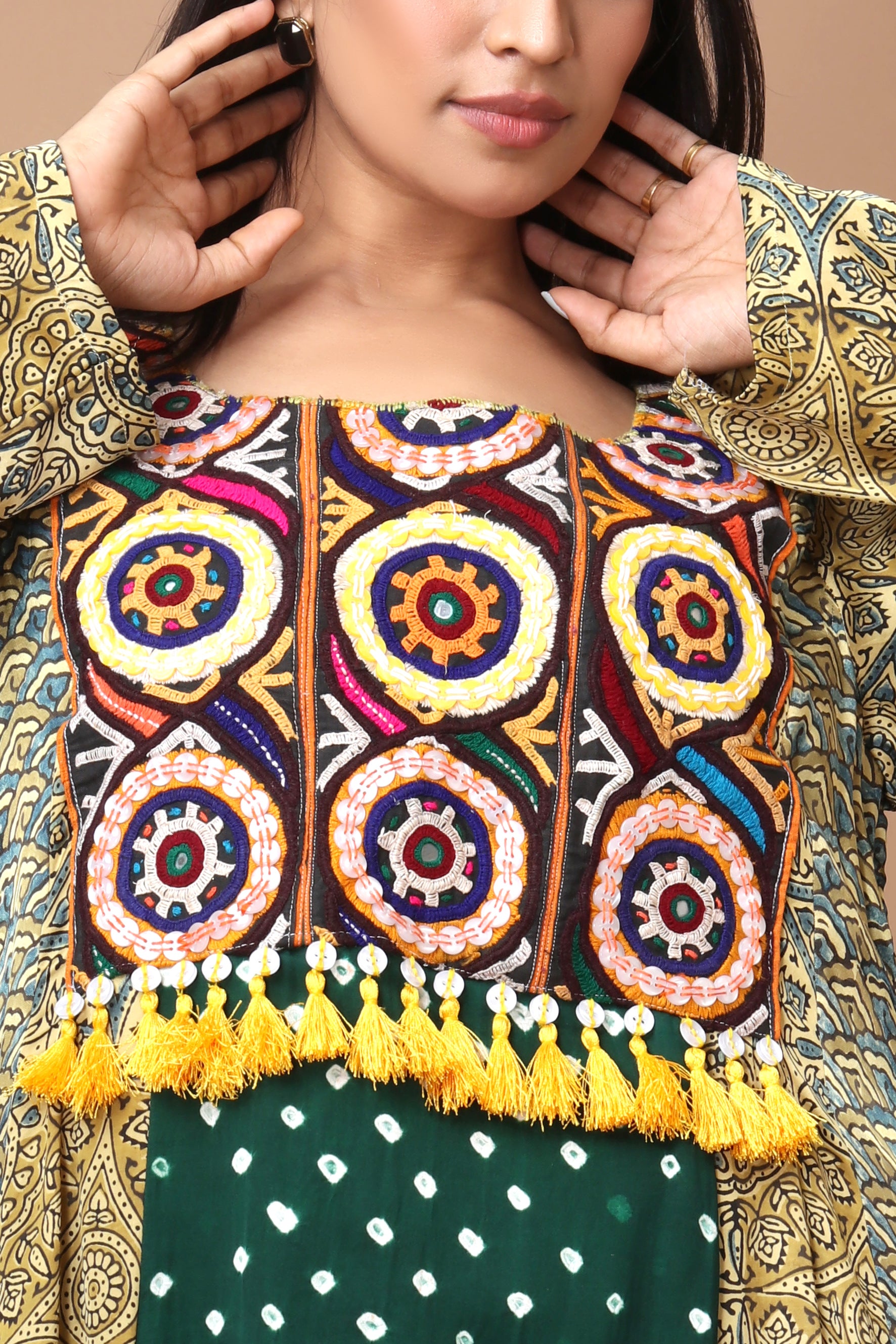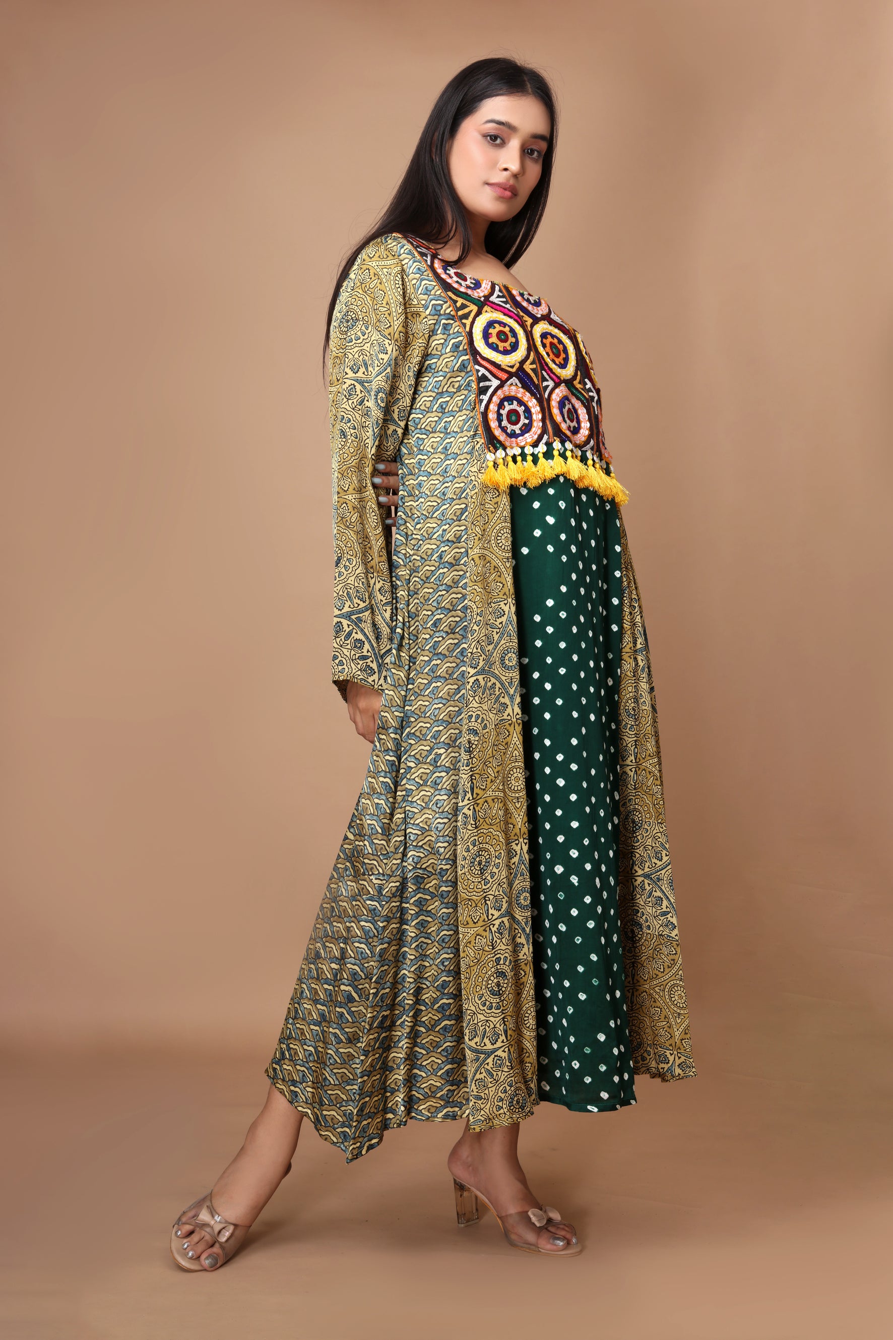 Green Modal Silk with Ajrakh, Bandhani & Kutchi Embroidery