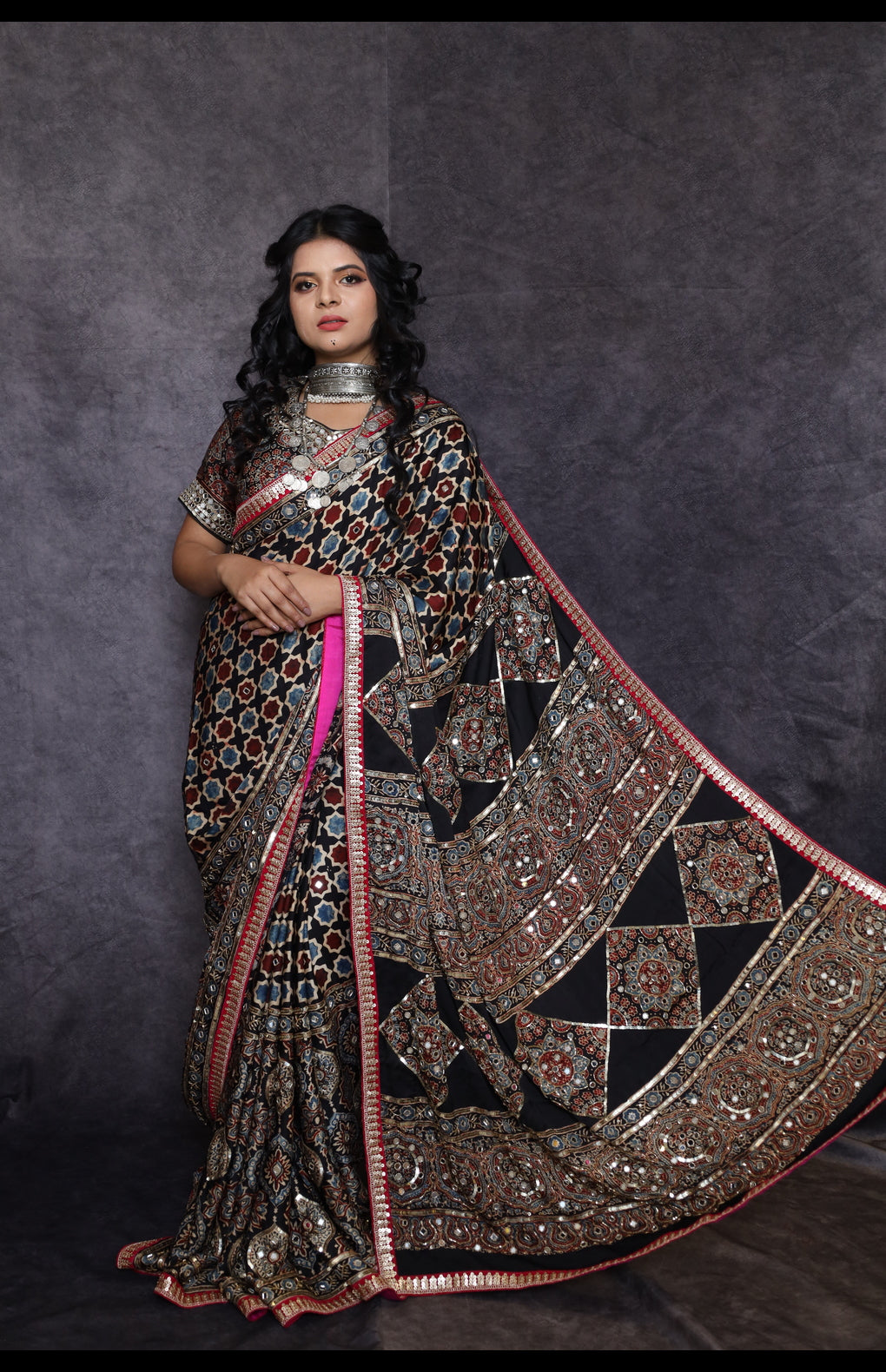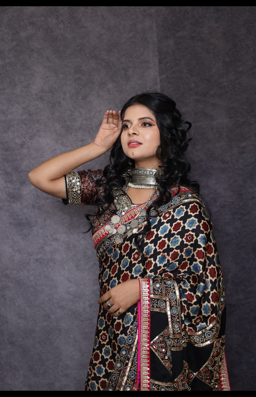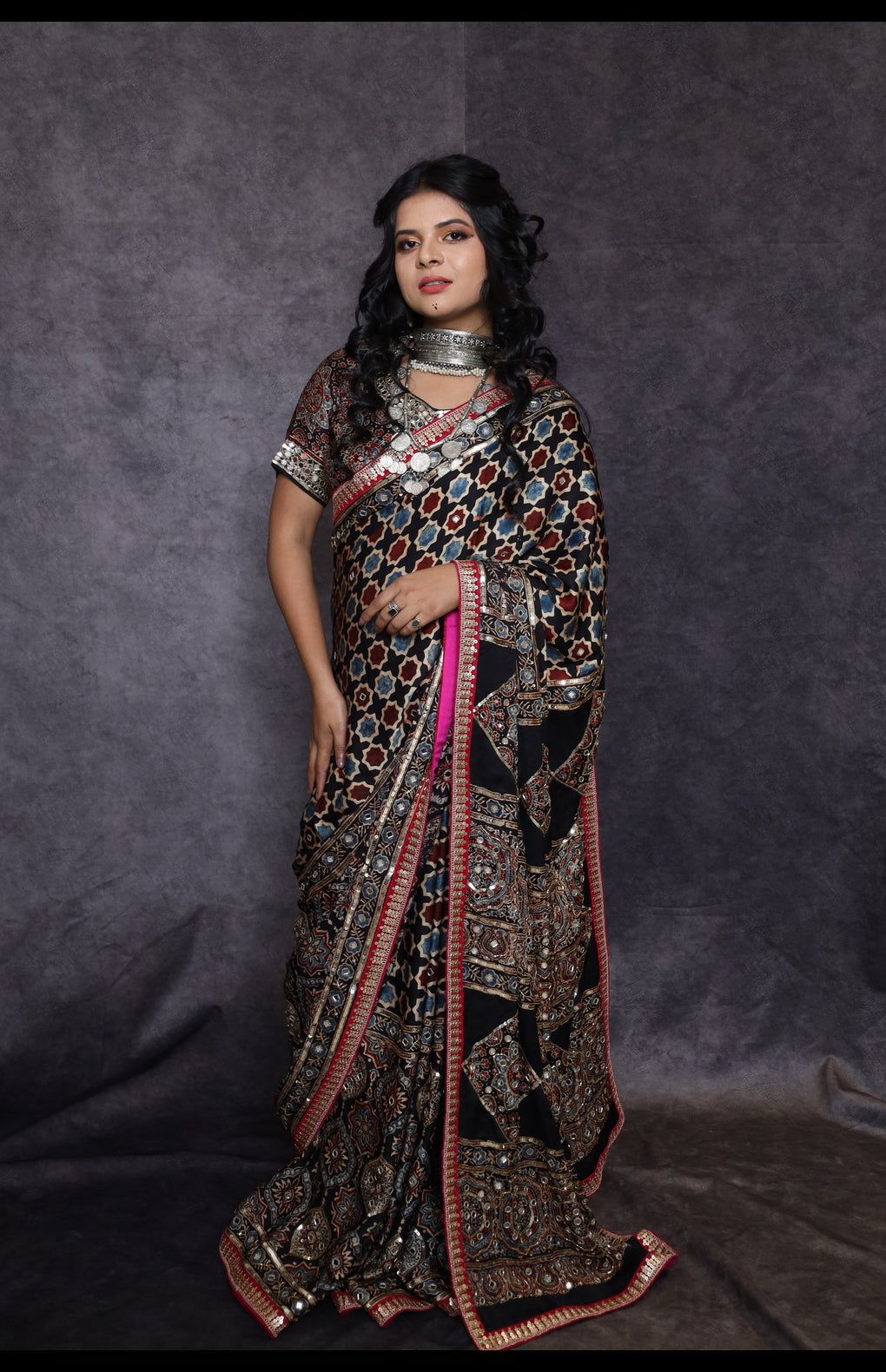 Hand Block Printed Ajrakh Saree with Embroidered Detailing