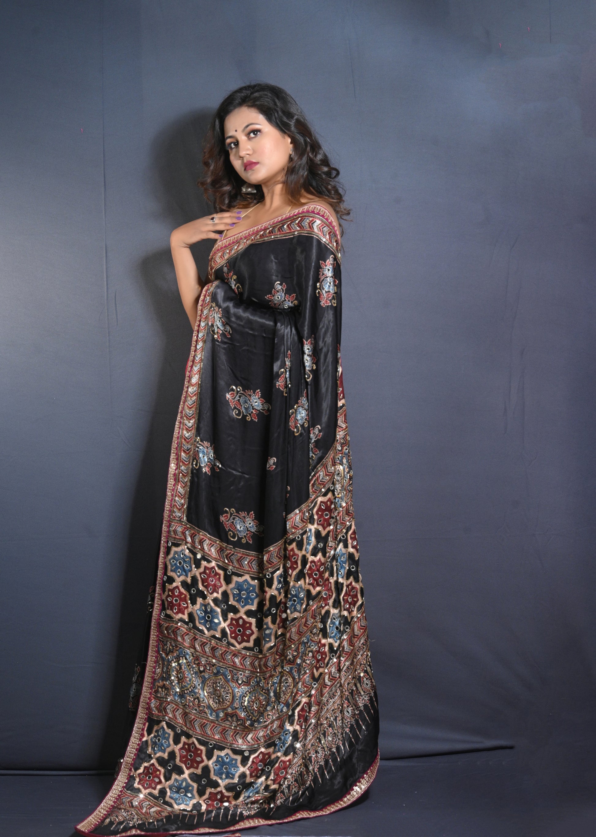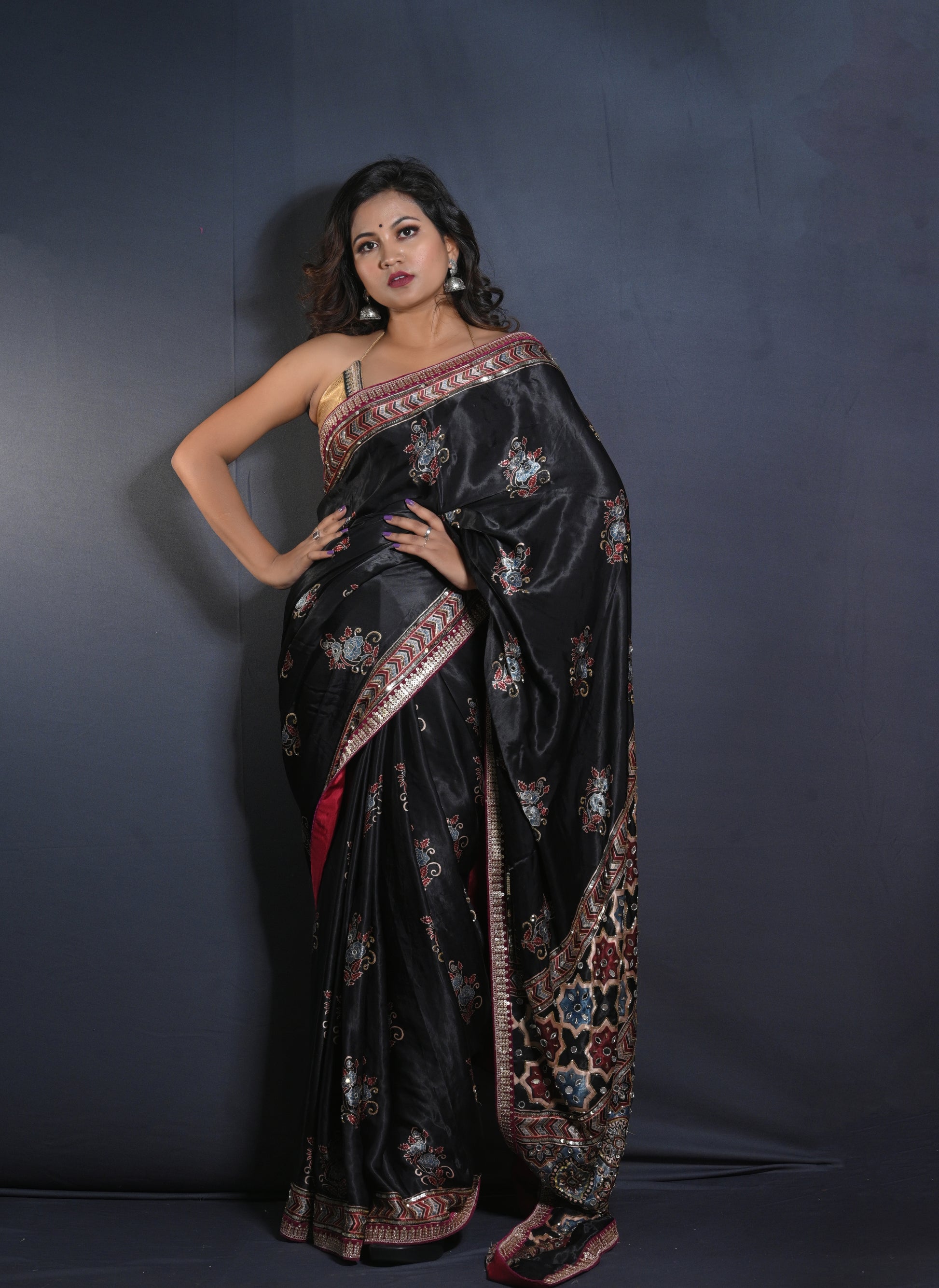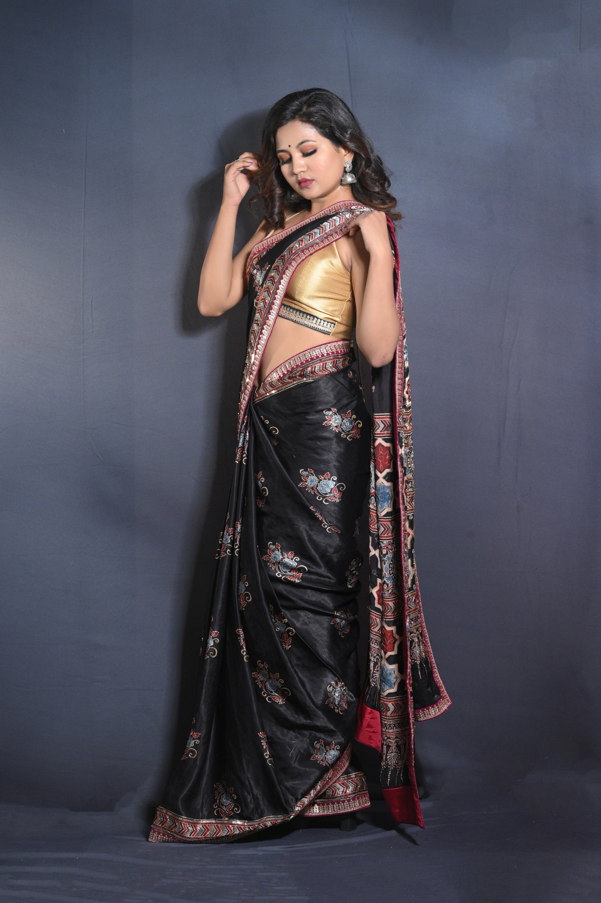 Crafted using the traditional Ajrakh hand block printing technique, this saree showcases intricate patterns in earthy tones on a black base. The hand embroidery adds texture and depth, while the embroidered border and back fencing complete the look. This piece highlights the rich craftsmanship of Ajrakh printing, making it suitable for cultural events or special gatherings.