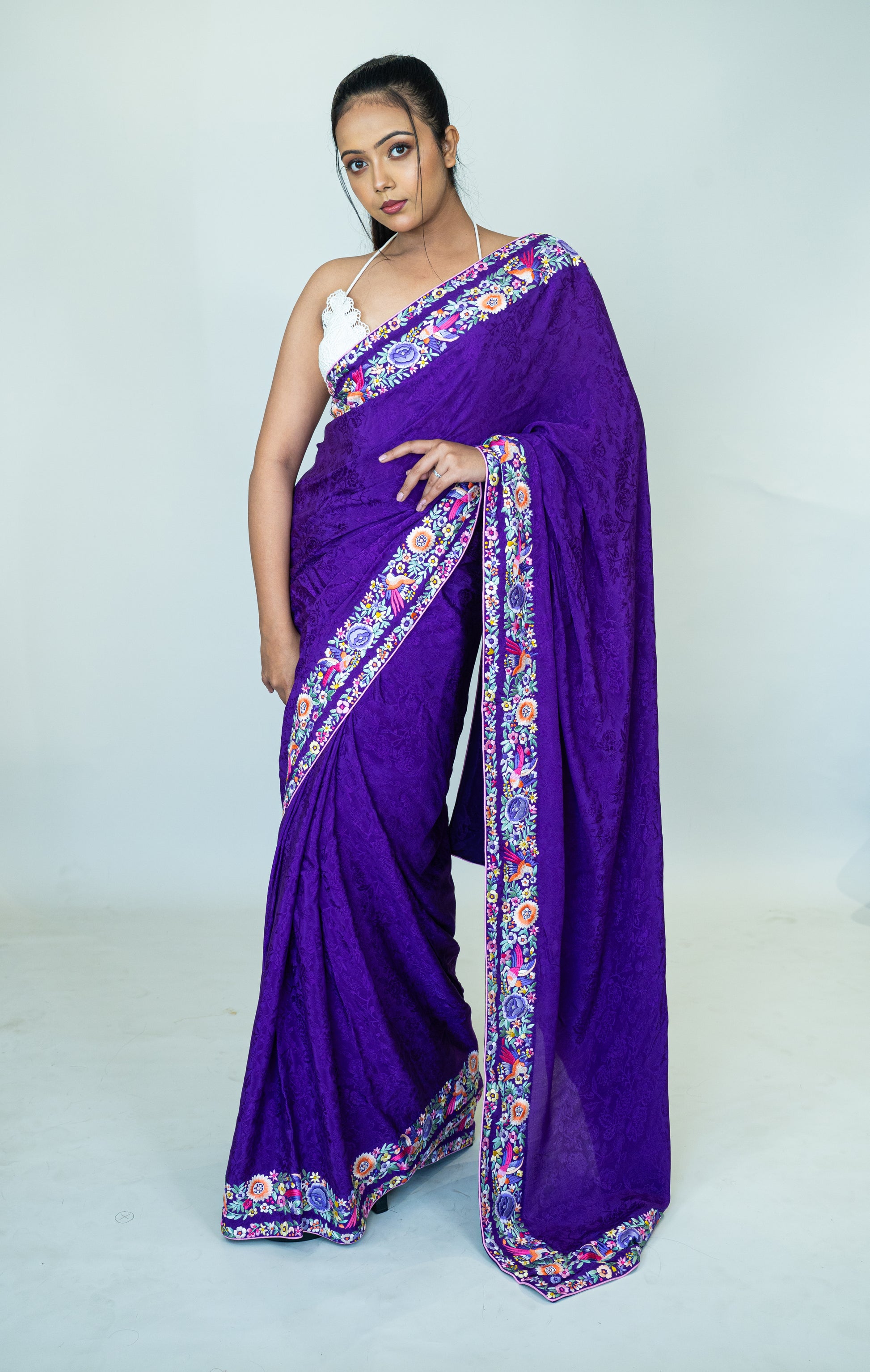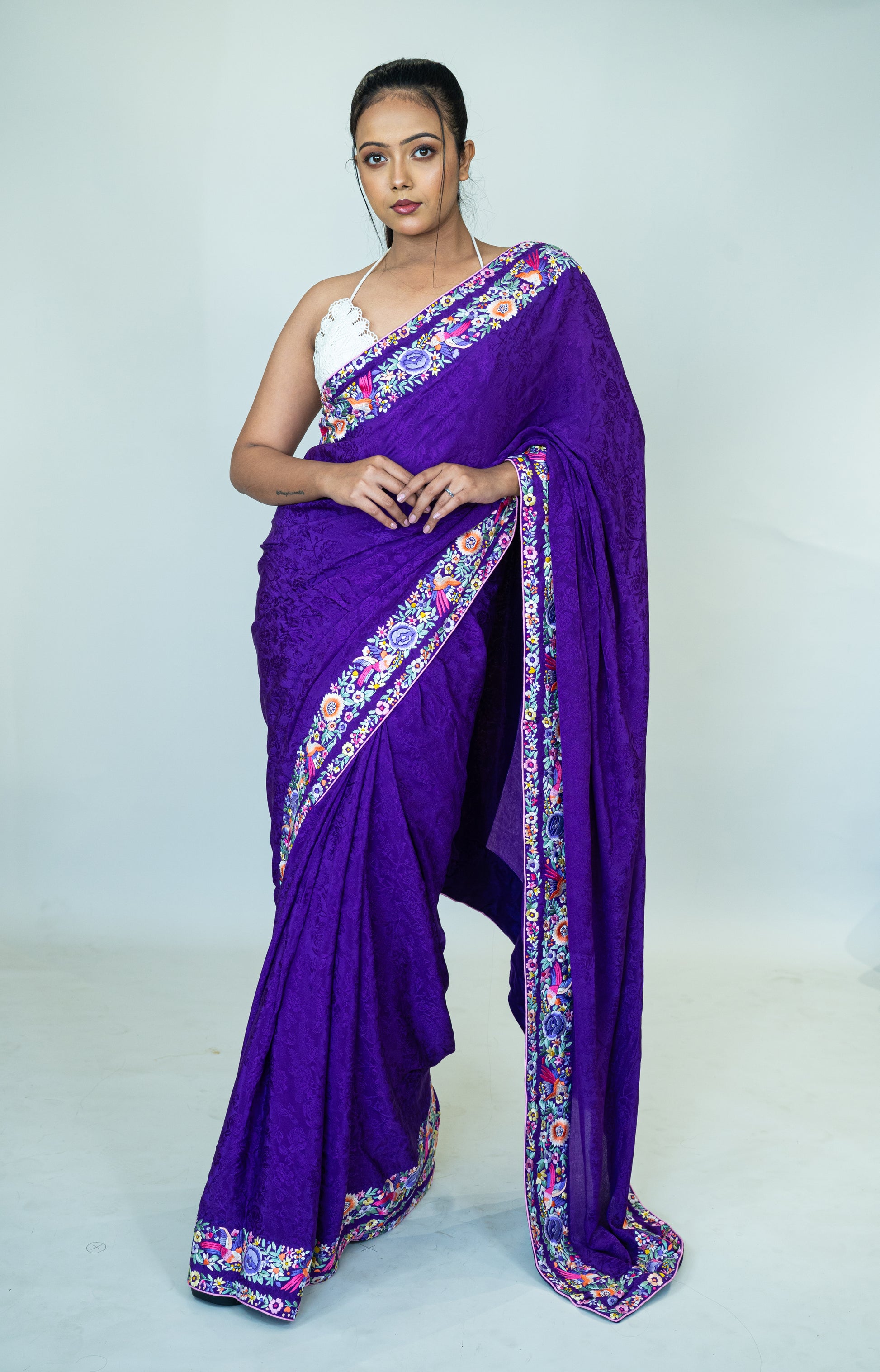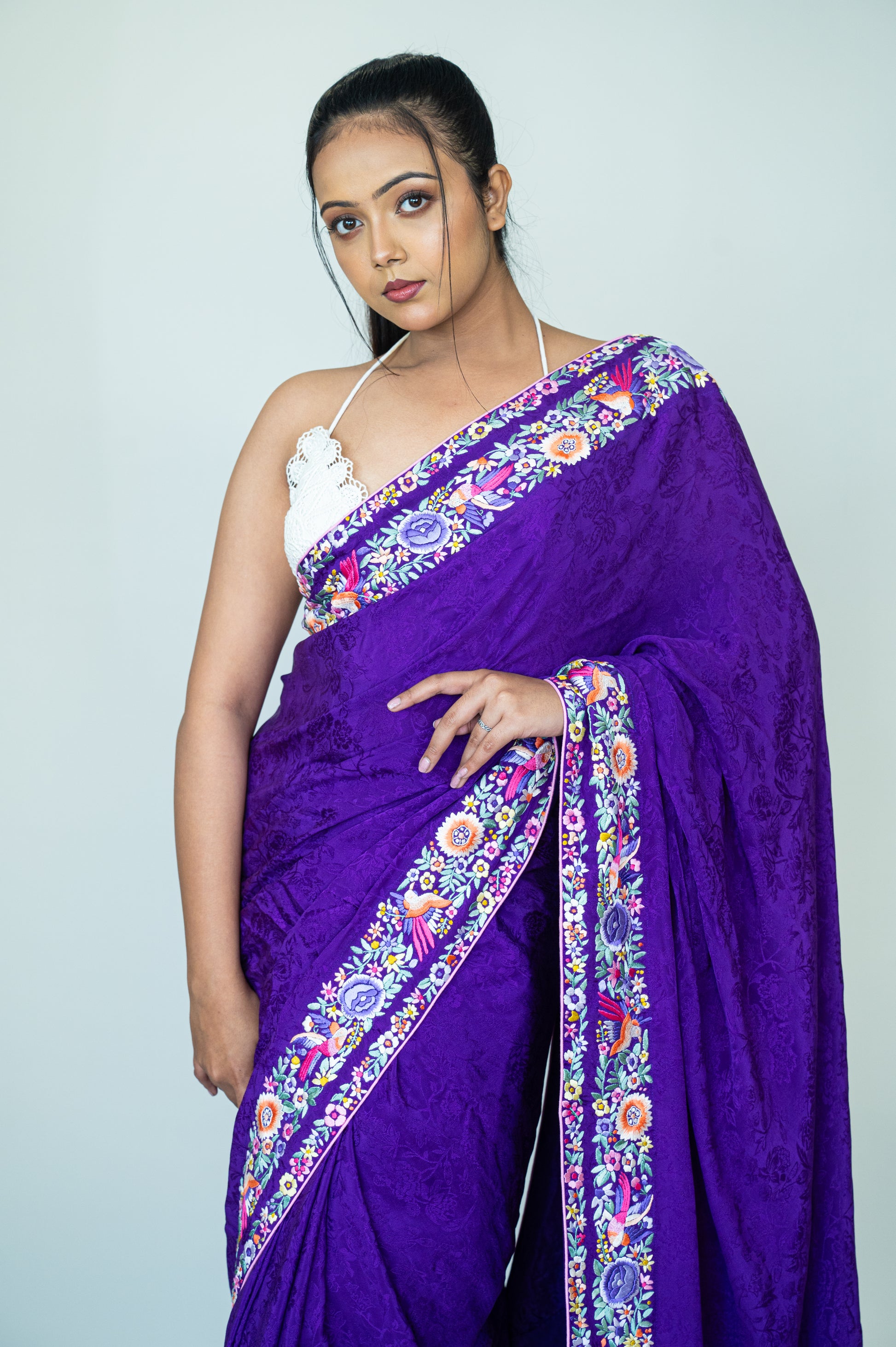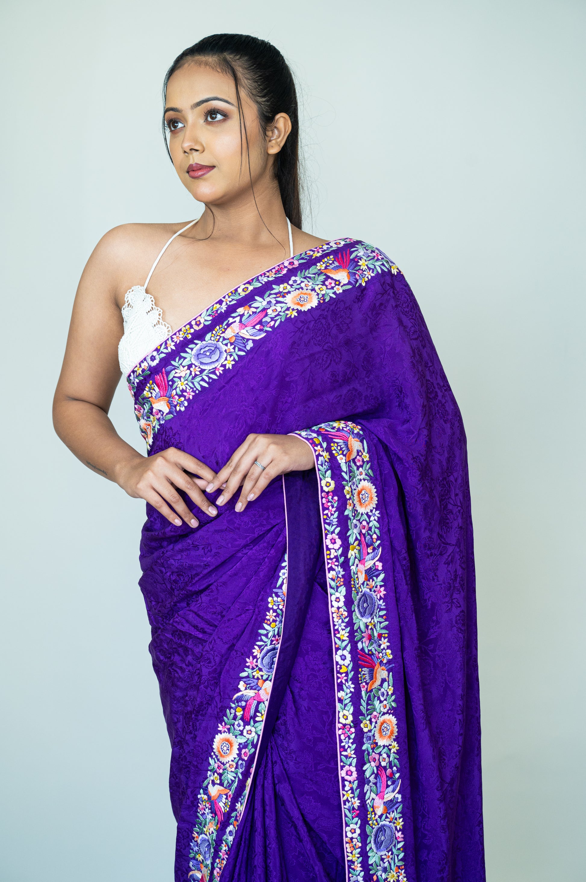 This stunning saree features traditional Parsi Gara hand embroidery, meticulously crafted on rich pure silk crepe jacquard fabric. The deep purple base provides a regal backdrop for the intricate floral designs that adorn the borders, creating a captivating contrast. The luxurious texture of silk crepe jacquard ensures both comfort and style, making this saree perfect for special occasions or festive gatherings. A timeless piece that celebrates traditional craftsmanship and modern elegance.