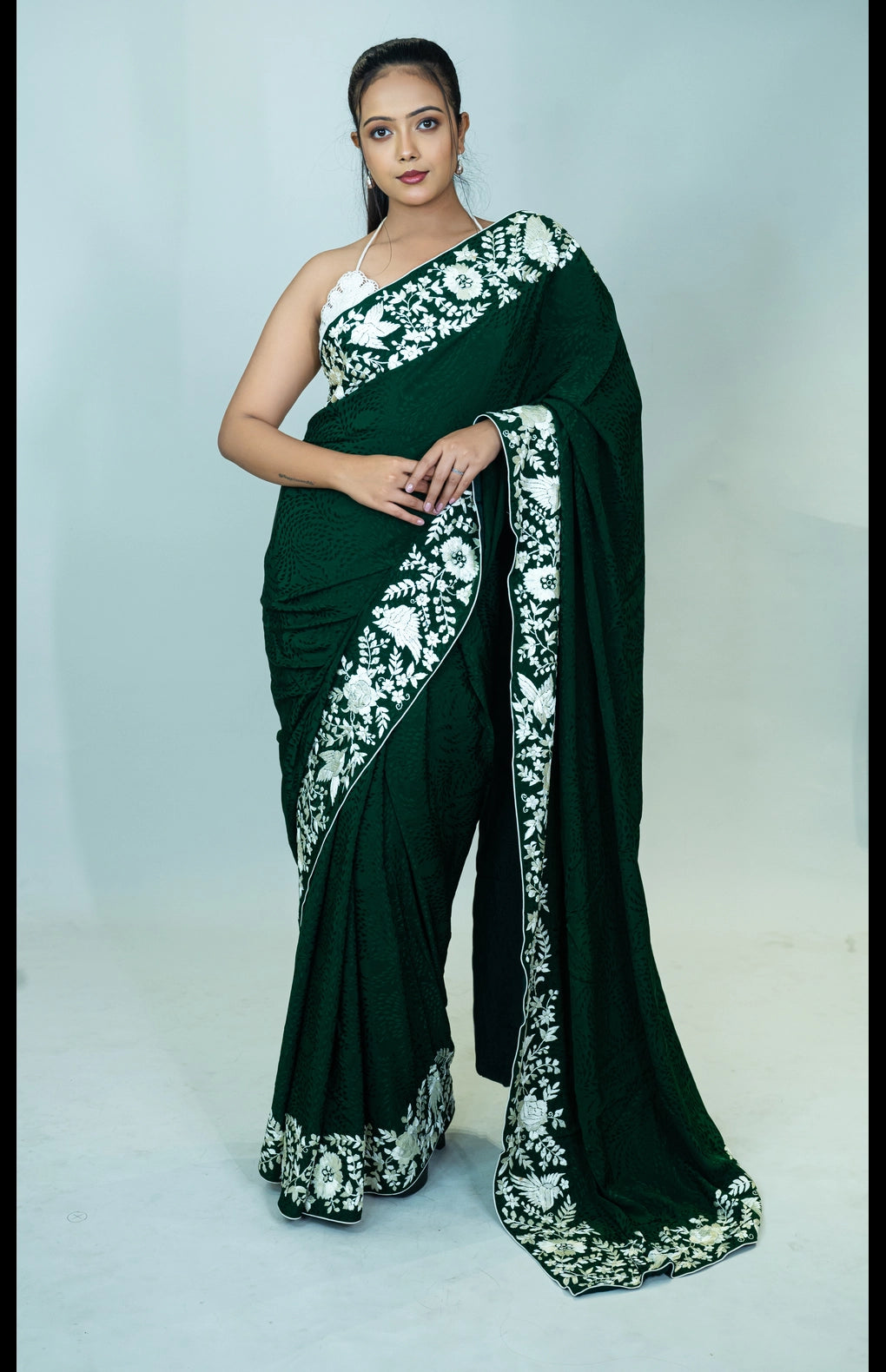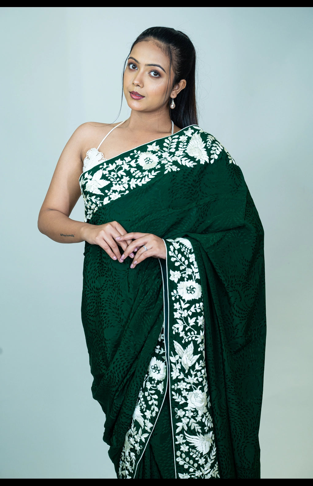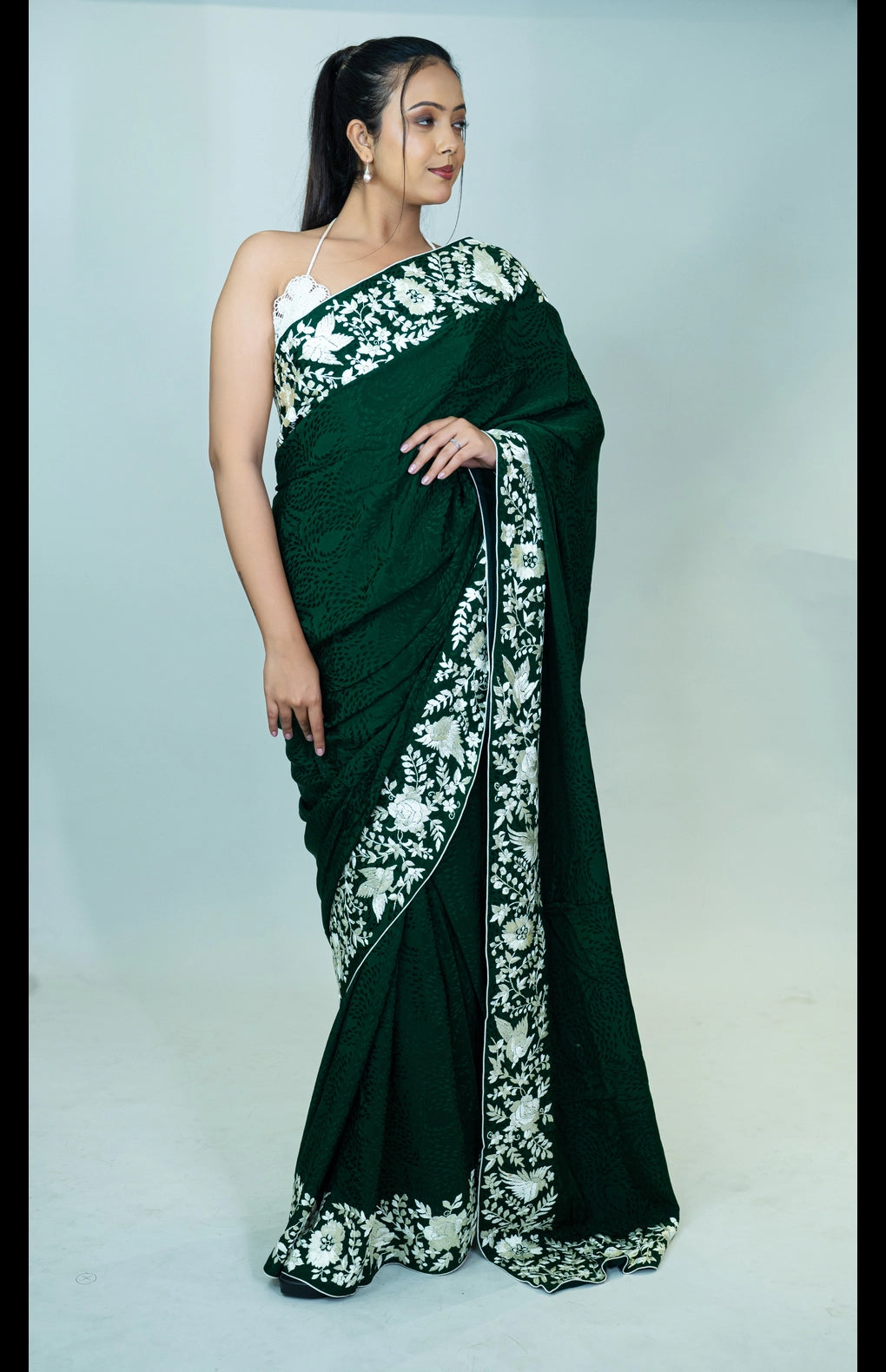This deep green saree features intricate hand-embroidered Parsi Gara work along the border. Made from pure silk crepe jacquard, it offers a refined and classic touch. Ideal for festive occasions and cultural gatherings, this piece stands out with its detailed craftsmanship and timeless design.