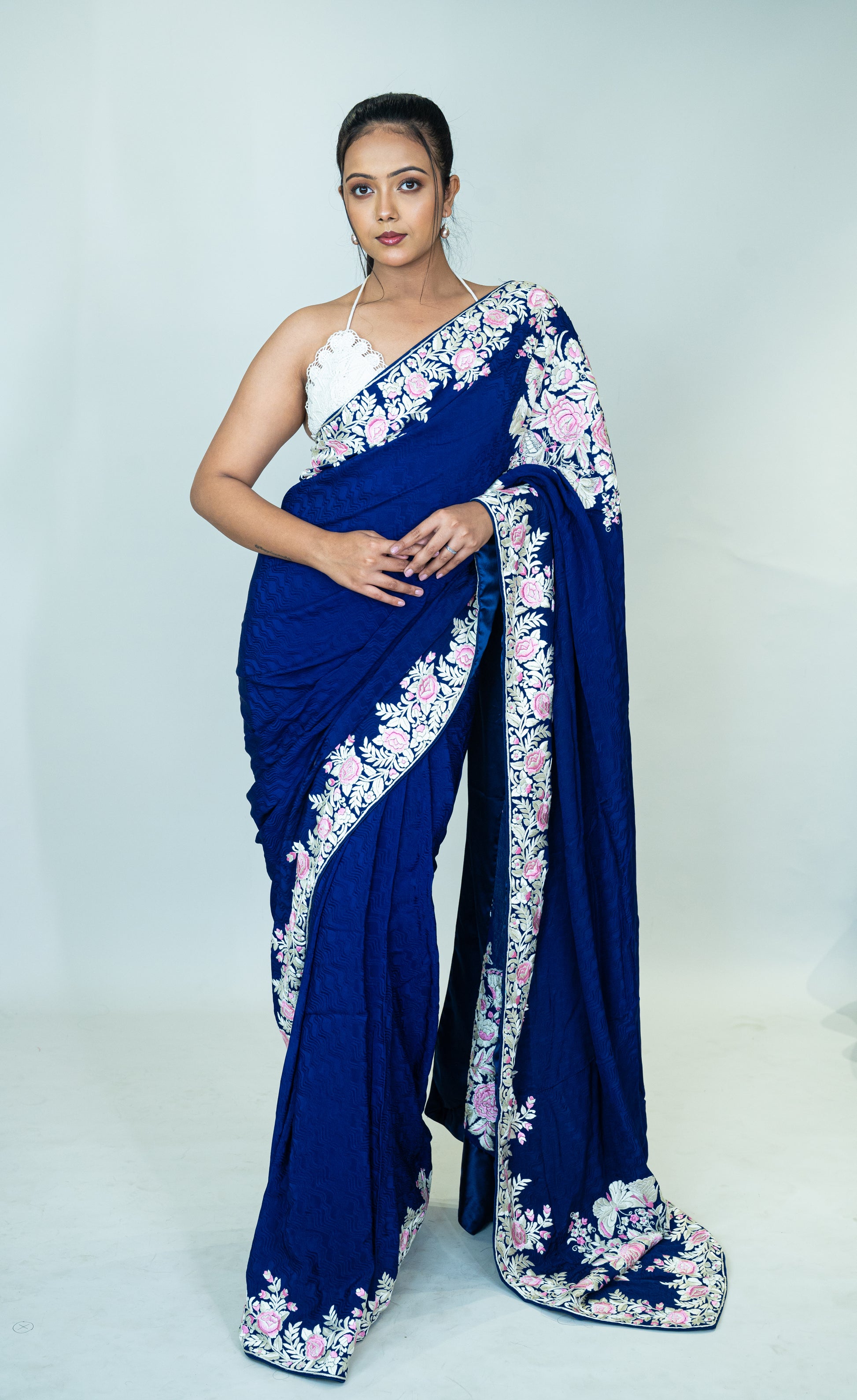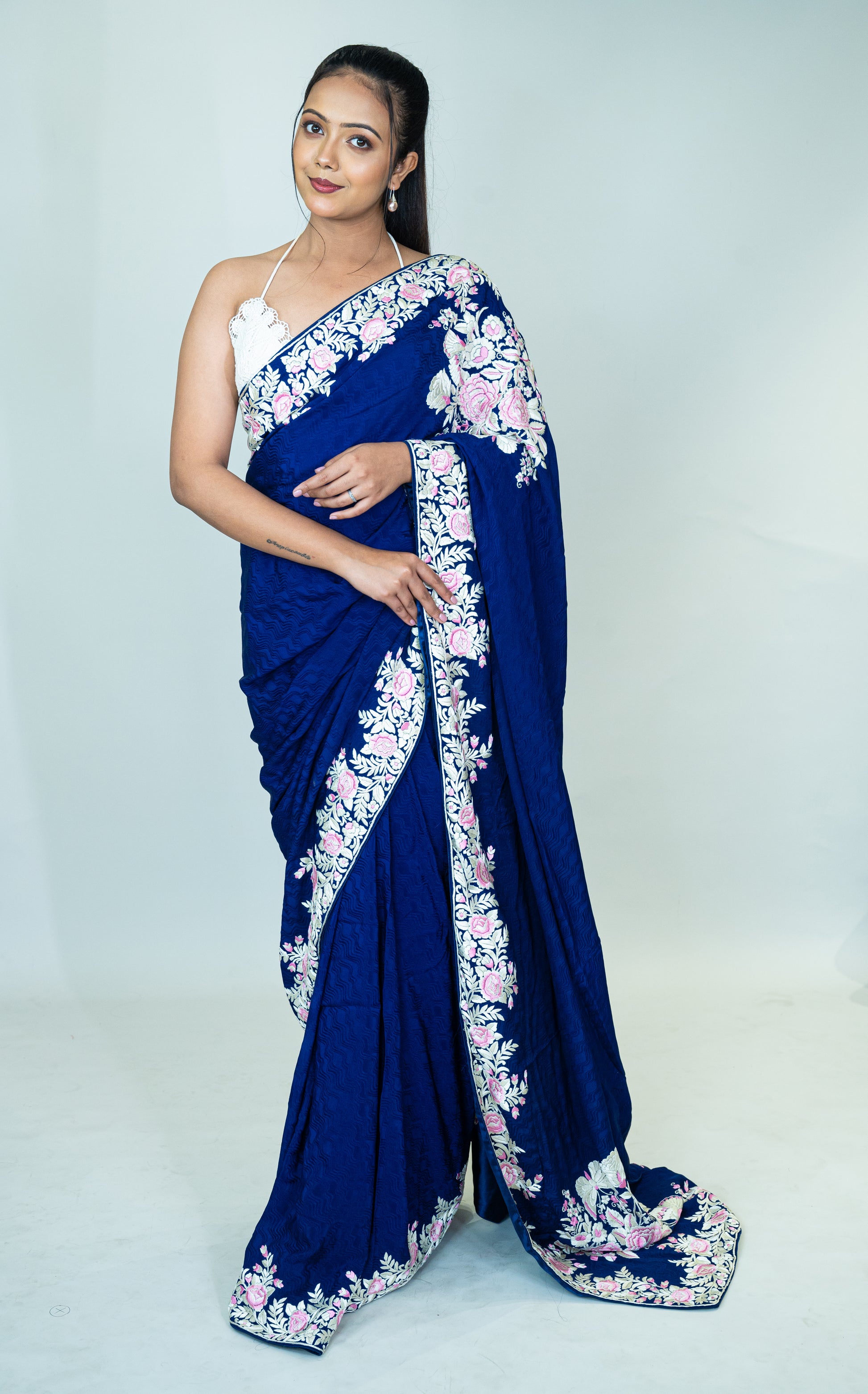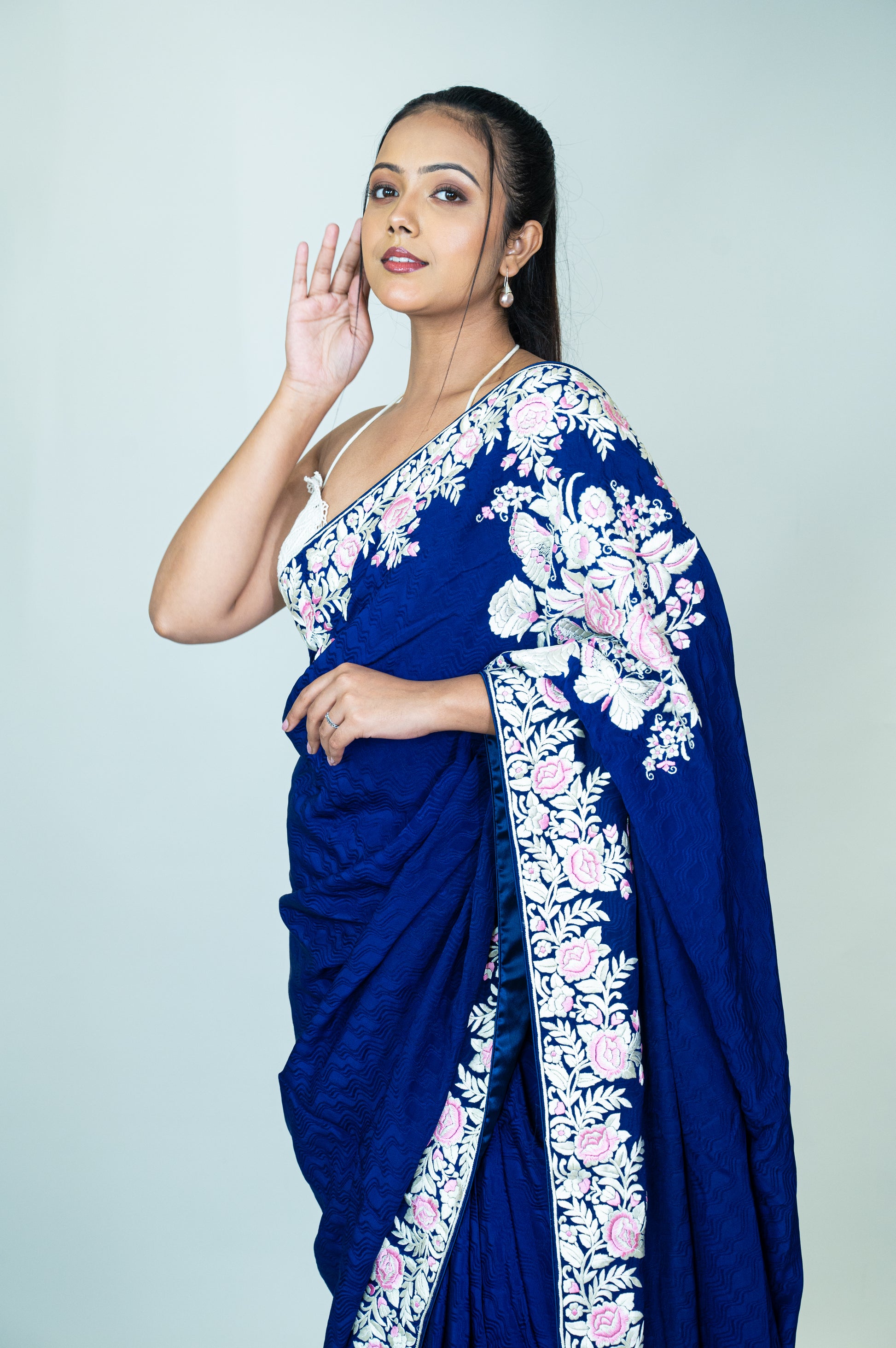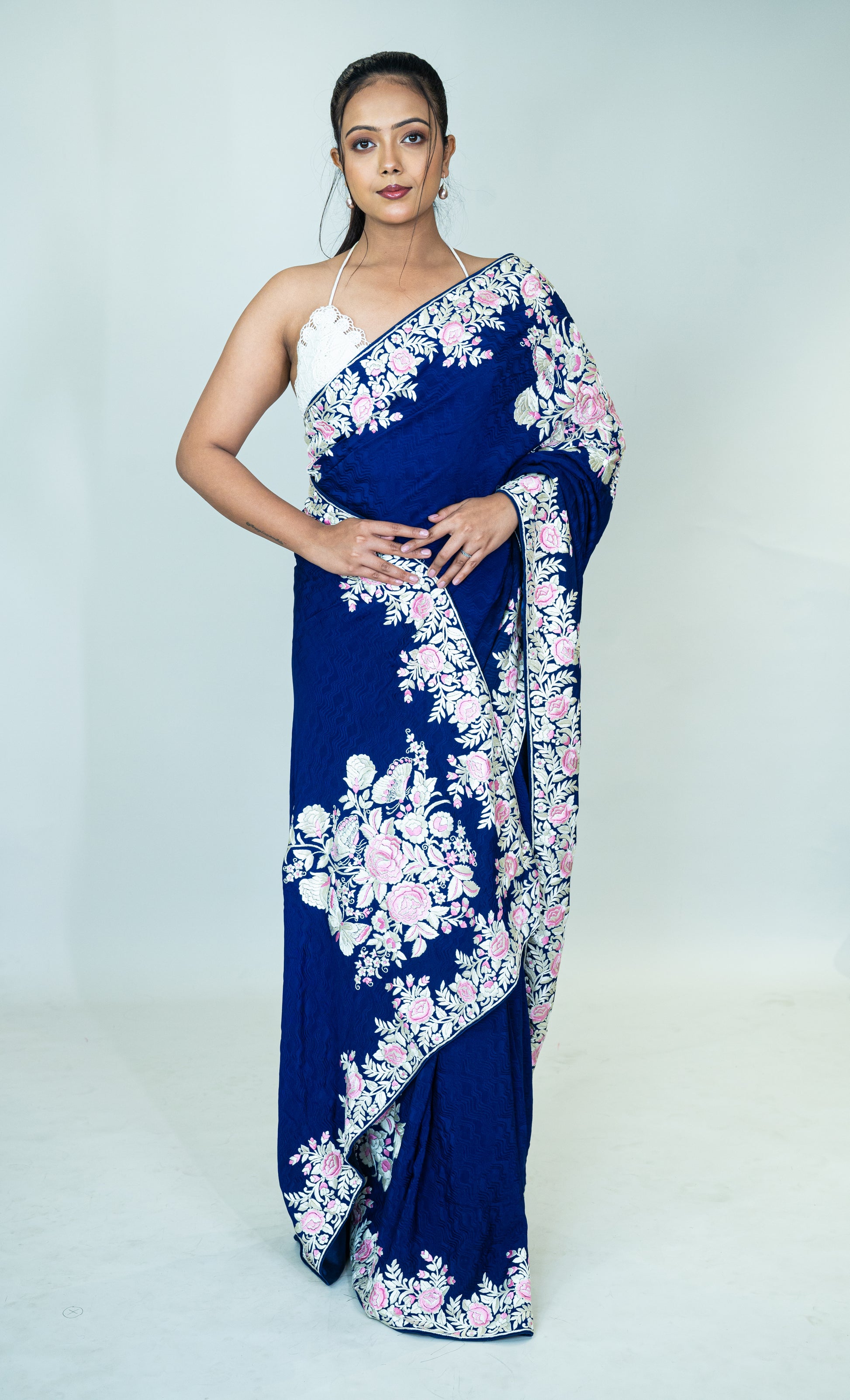 This saree showcases intricate hand embroidery in the traditional Parsi Gara style, bringing a timeless art form to life. The rich texture of the pure silk crepe jacquard fabric enhances the detailed floral motifs. A blend of craftsmanship and heritage, this saree is ideal for occasions where you want to celebrate culture with modern grace.