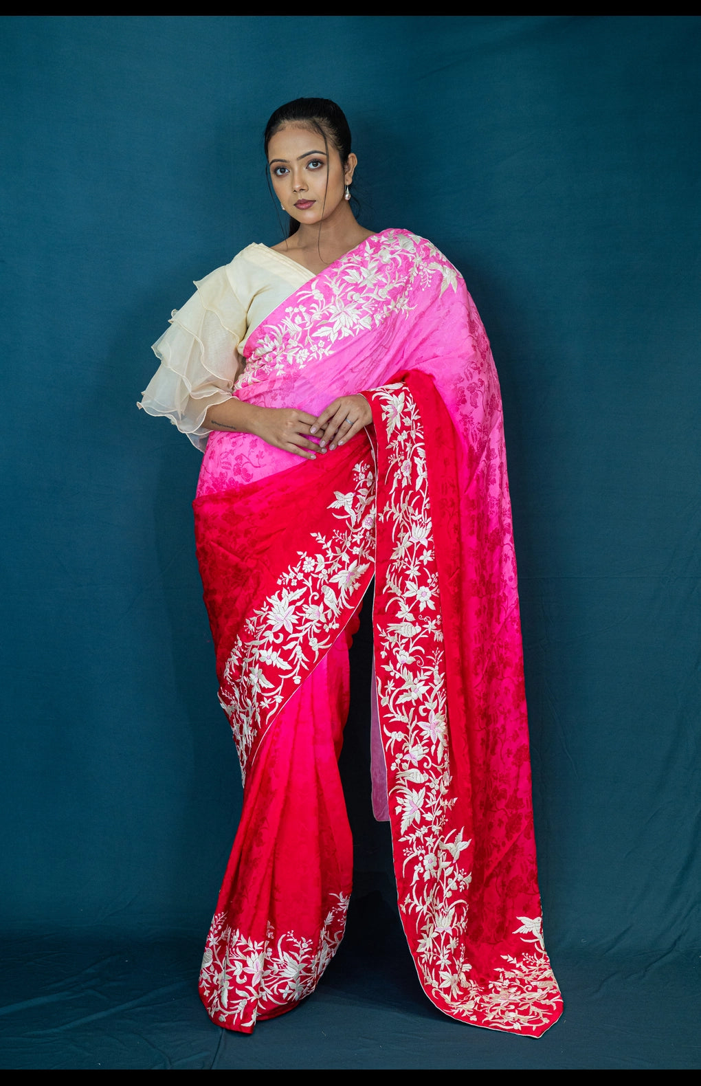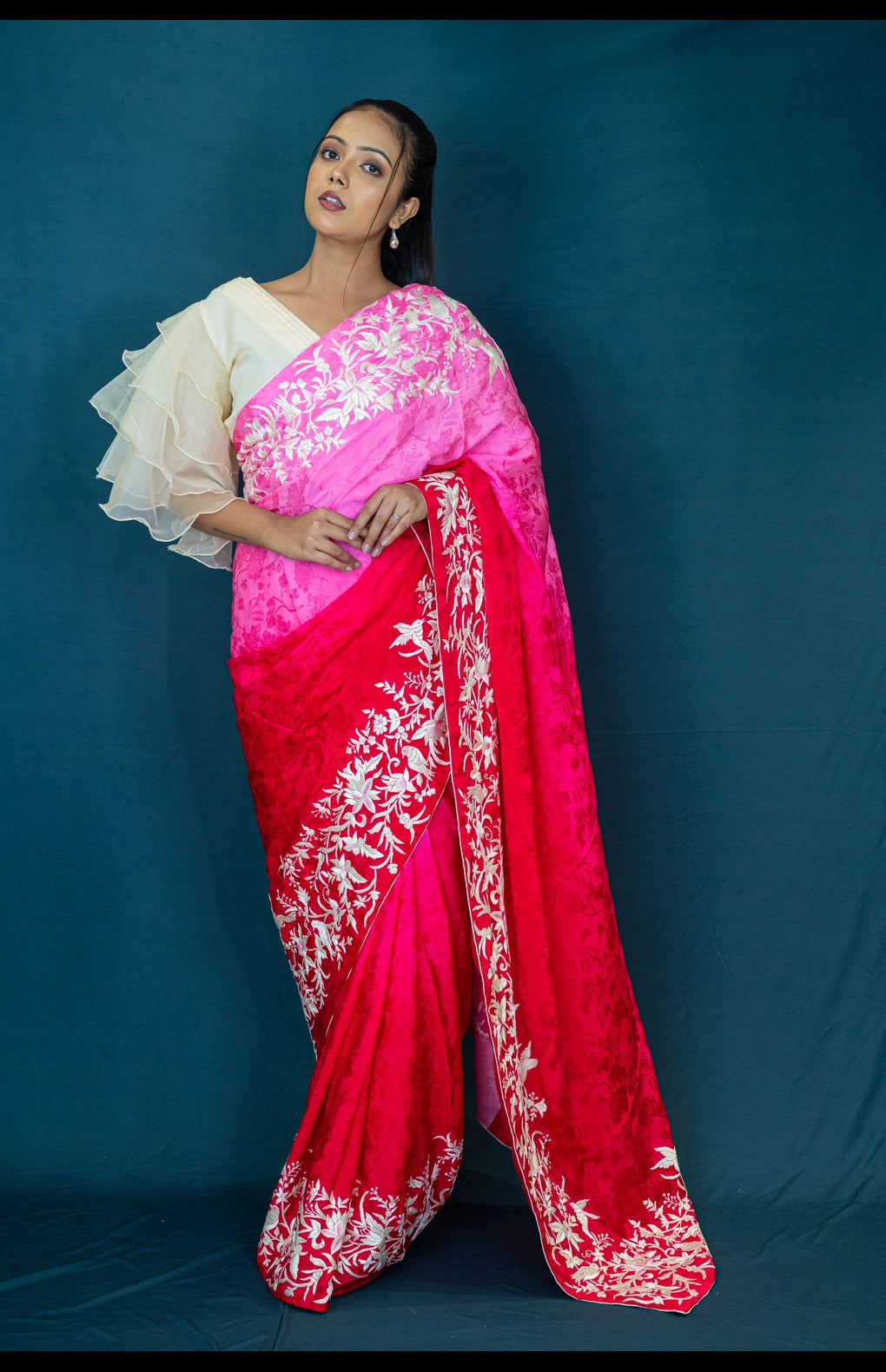 This saree features intricate hand-embroidered Parsi Gara work, crafted on a pure silk crepe jacquard base. The vibrant pink and red tones add a contemporary twist to a traditional design, making it a standout choice for festive and special occasions. Comes with a matching blouse piece for easy styling.