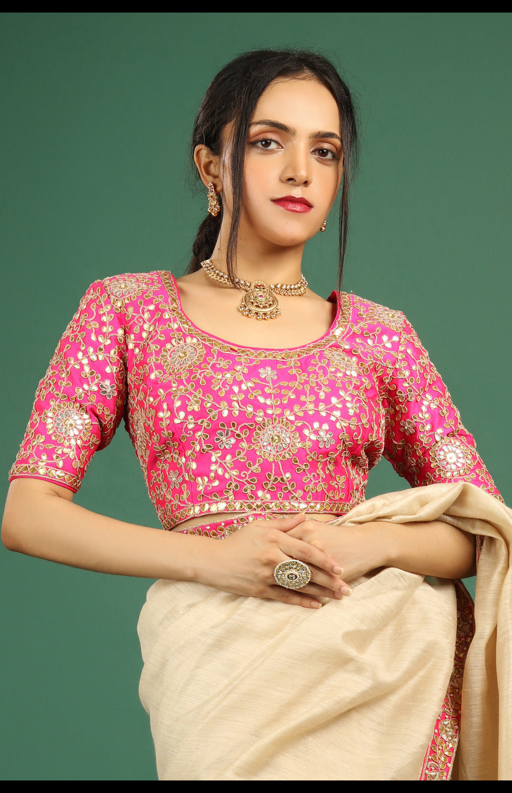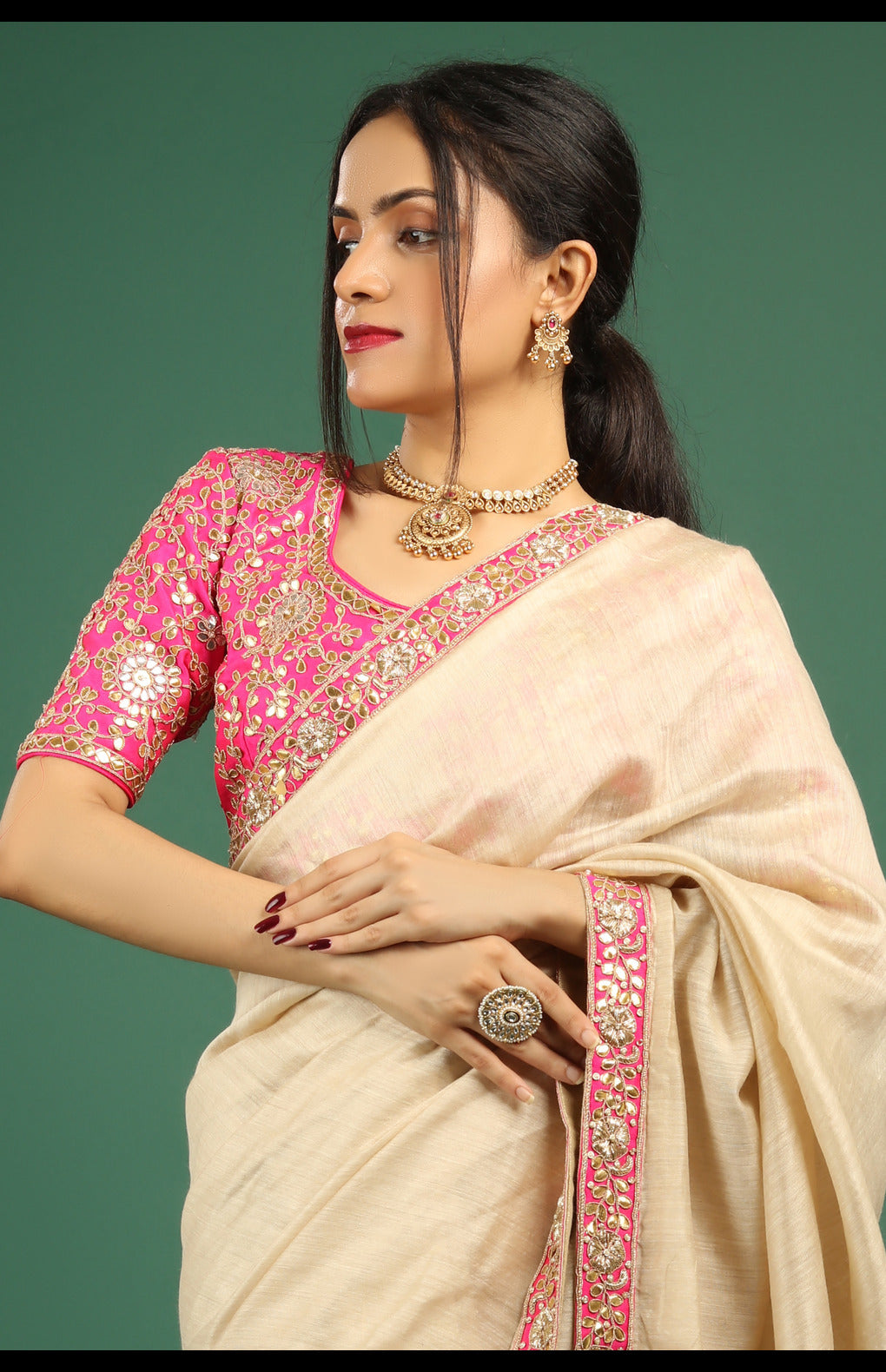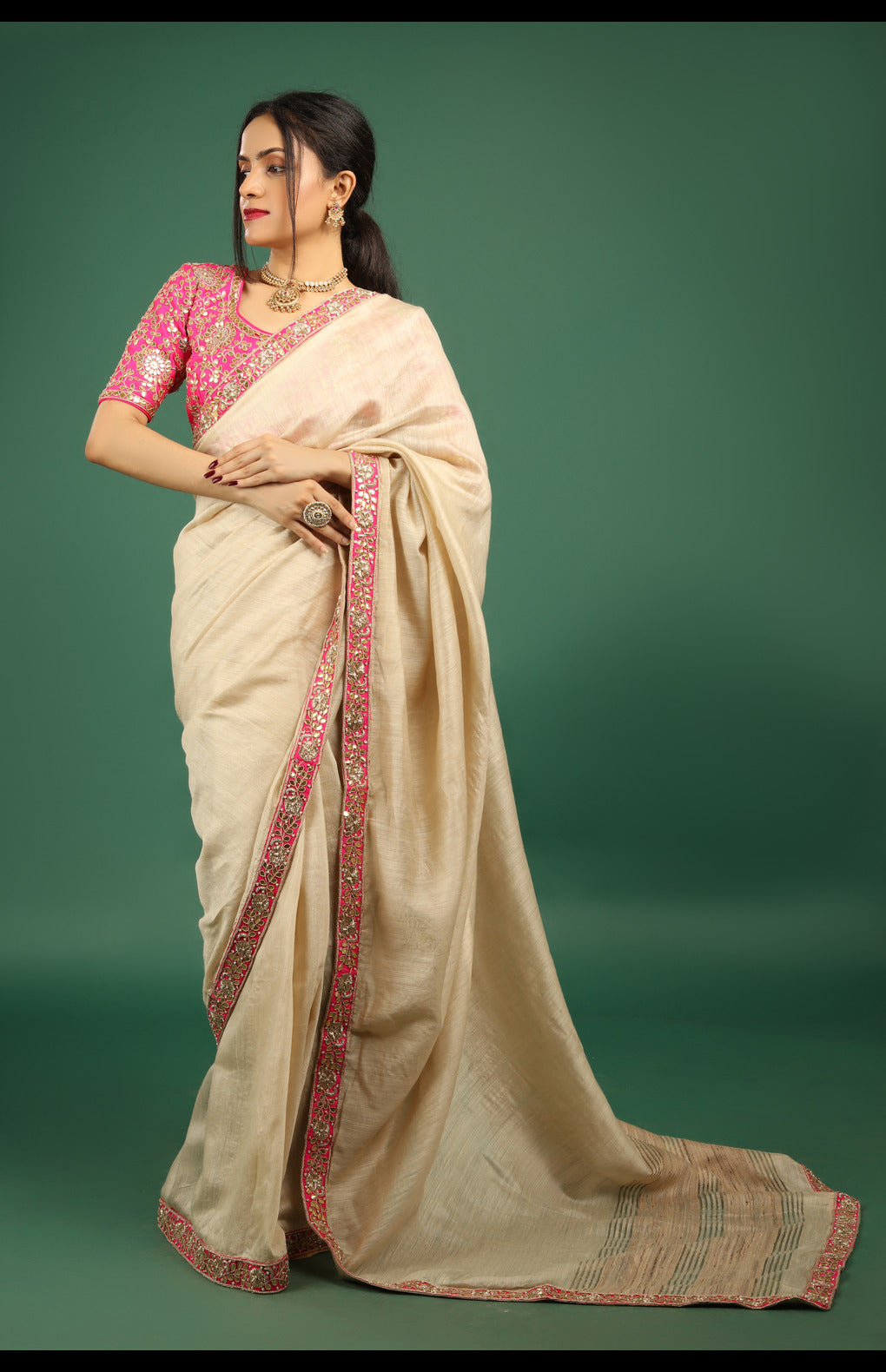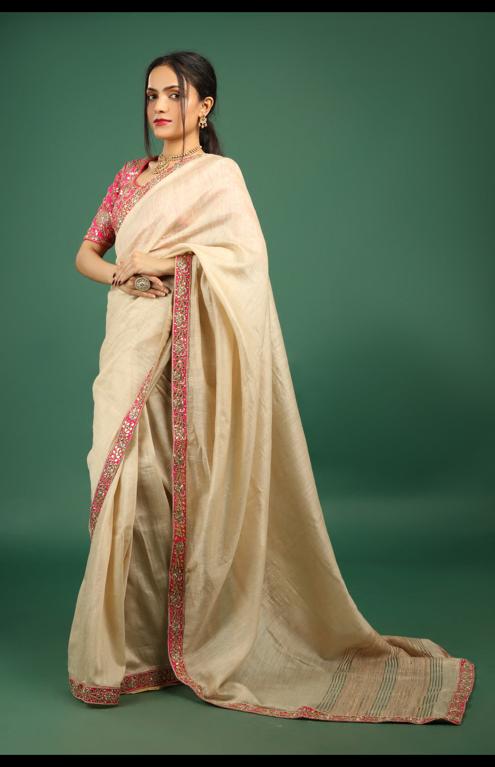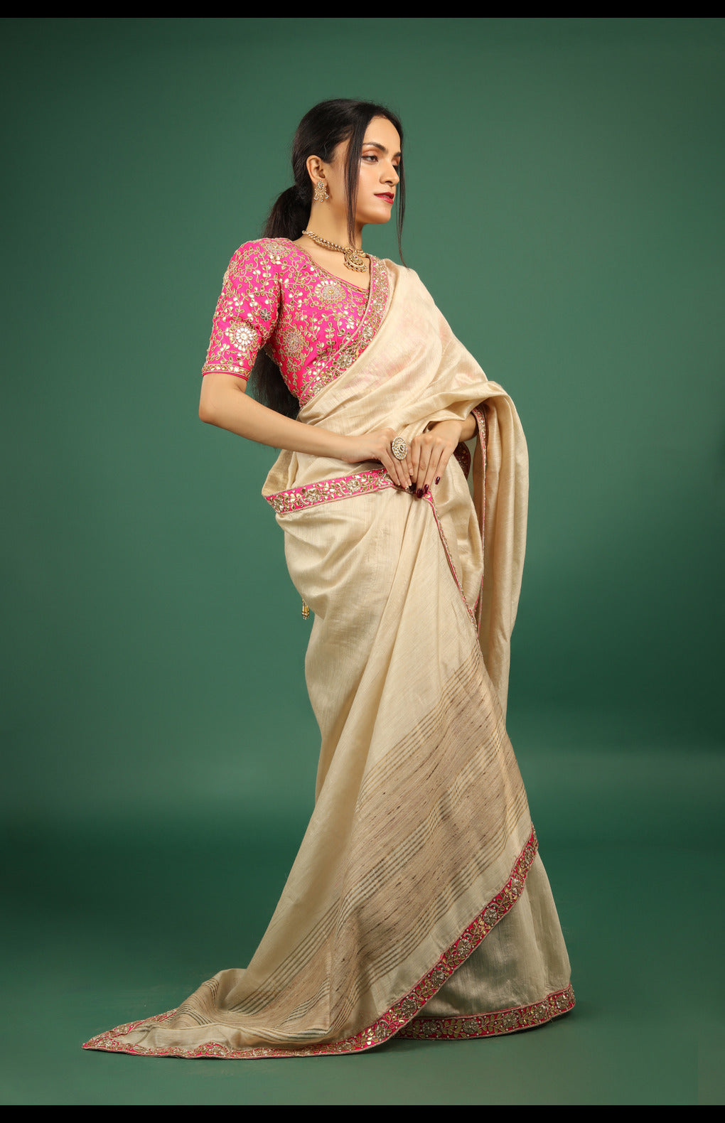 Hand-Embroidered Tusser Silk Saree with Fuchsia Gota Patti Blouse