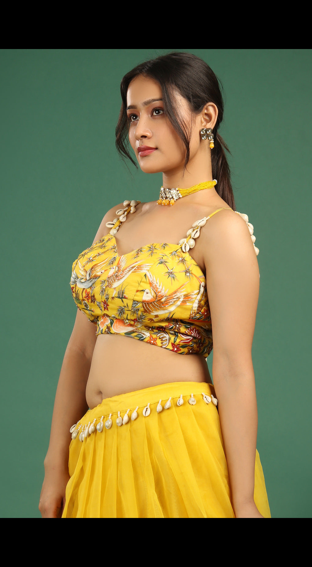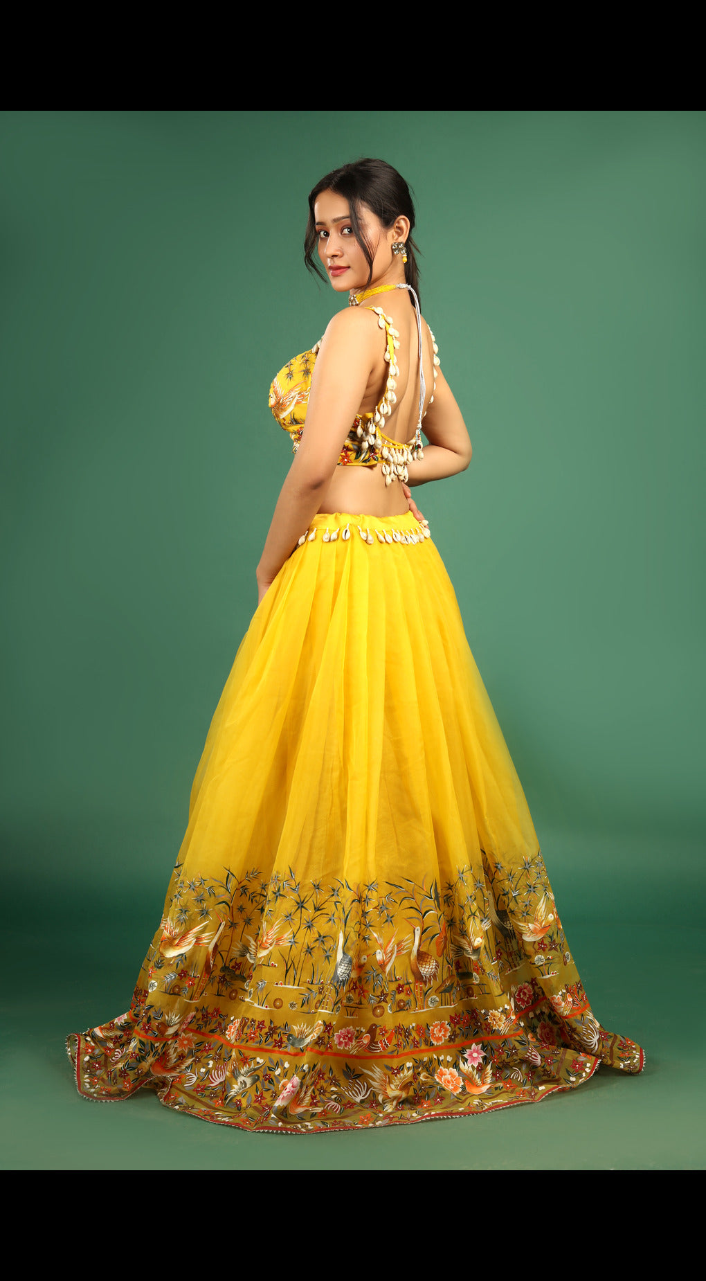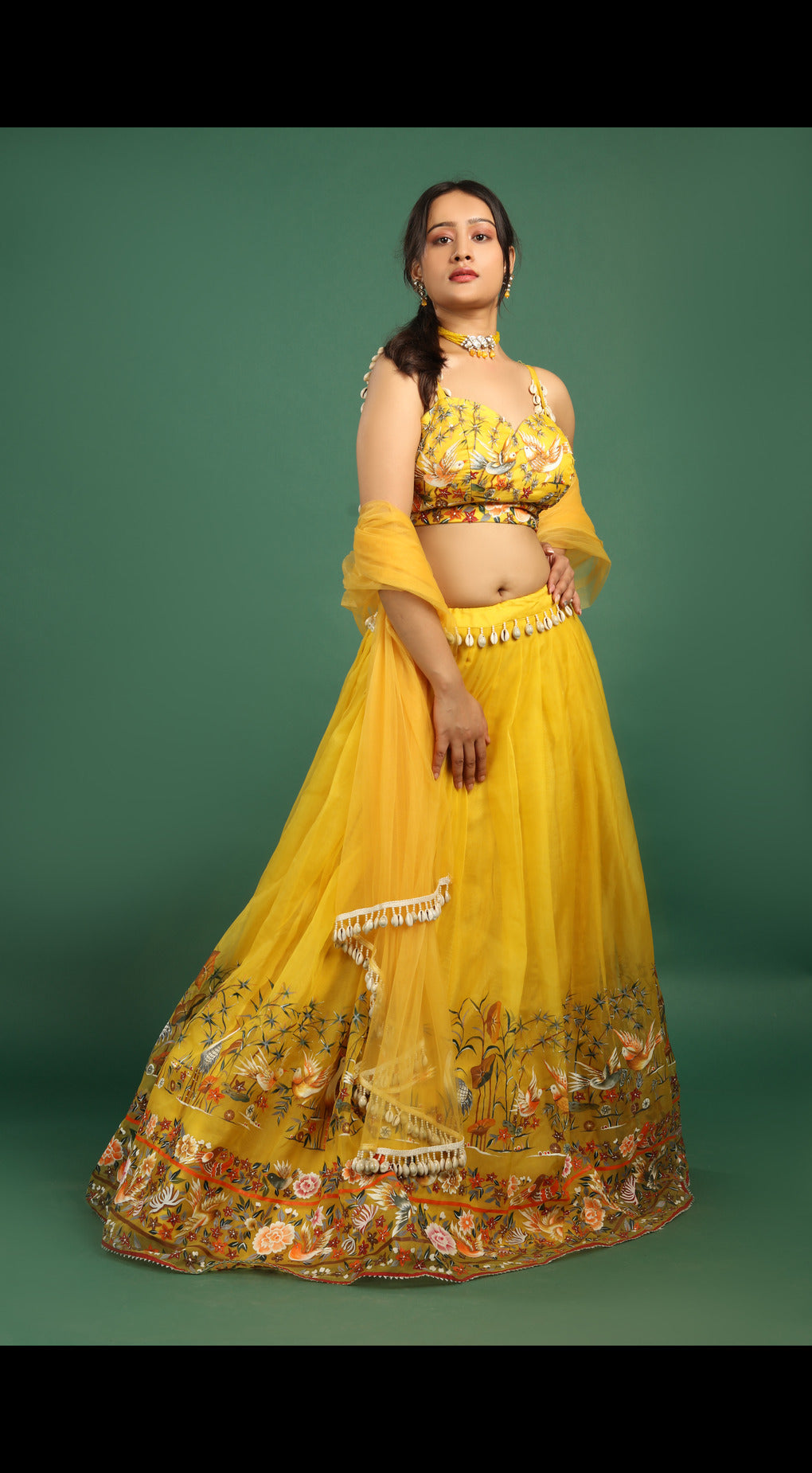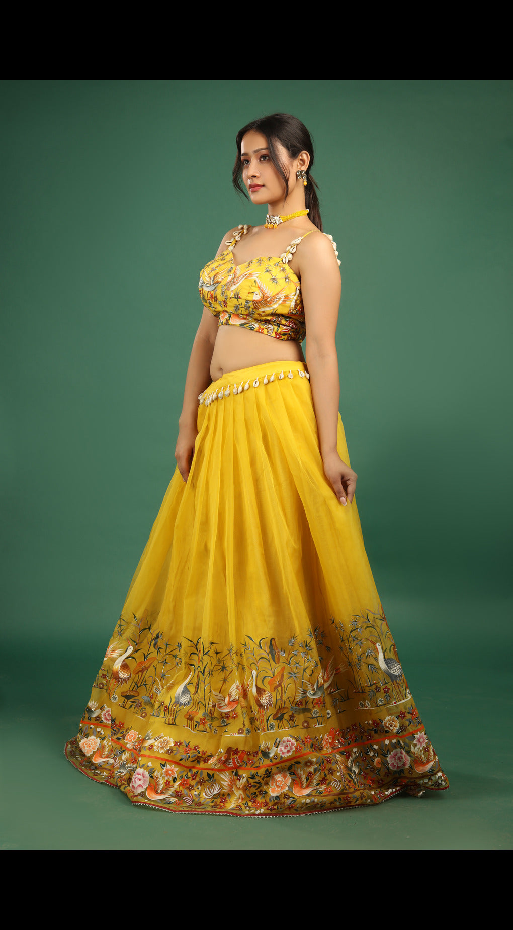 Step into timeless beauty with this yellow pure organza lehenga set, intricately hand-painted with nature-inspired designs and masterfully hand-embroidered for a striking finish. The lightweight organza fabric ensures flow and grace, while the shell-embellished blouse adds a playful and modern twist. Perfect for weddings, festivals, or special occasions, this lehenga is a celebration of artistic craftsmanship and vibrant style.
