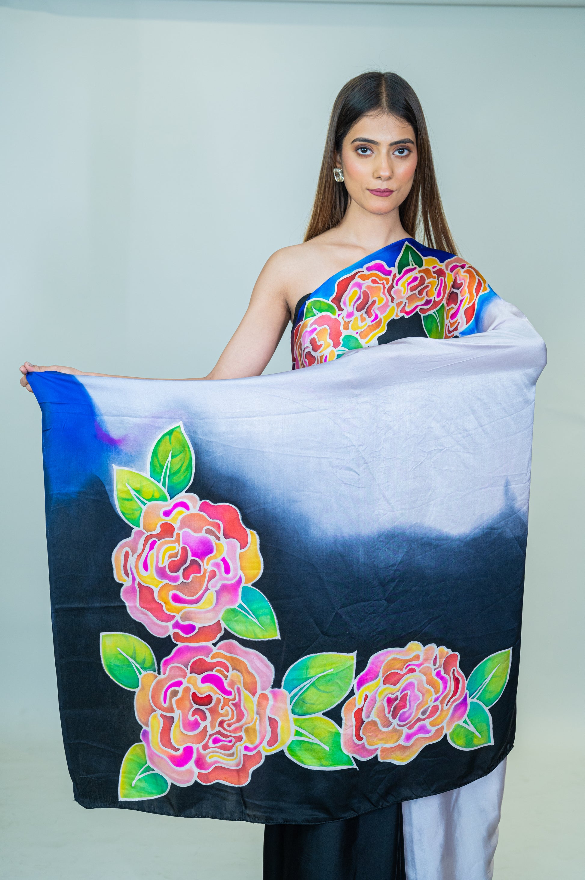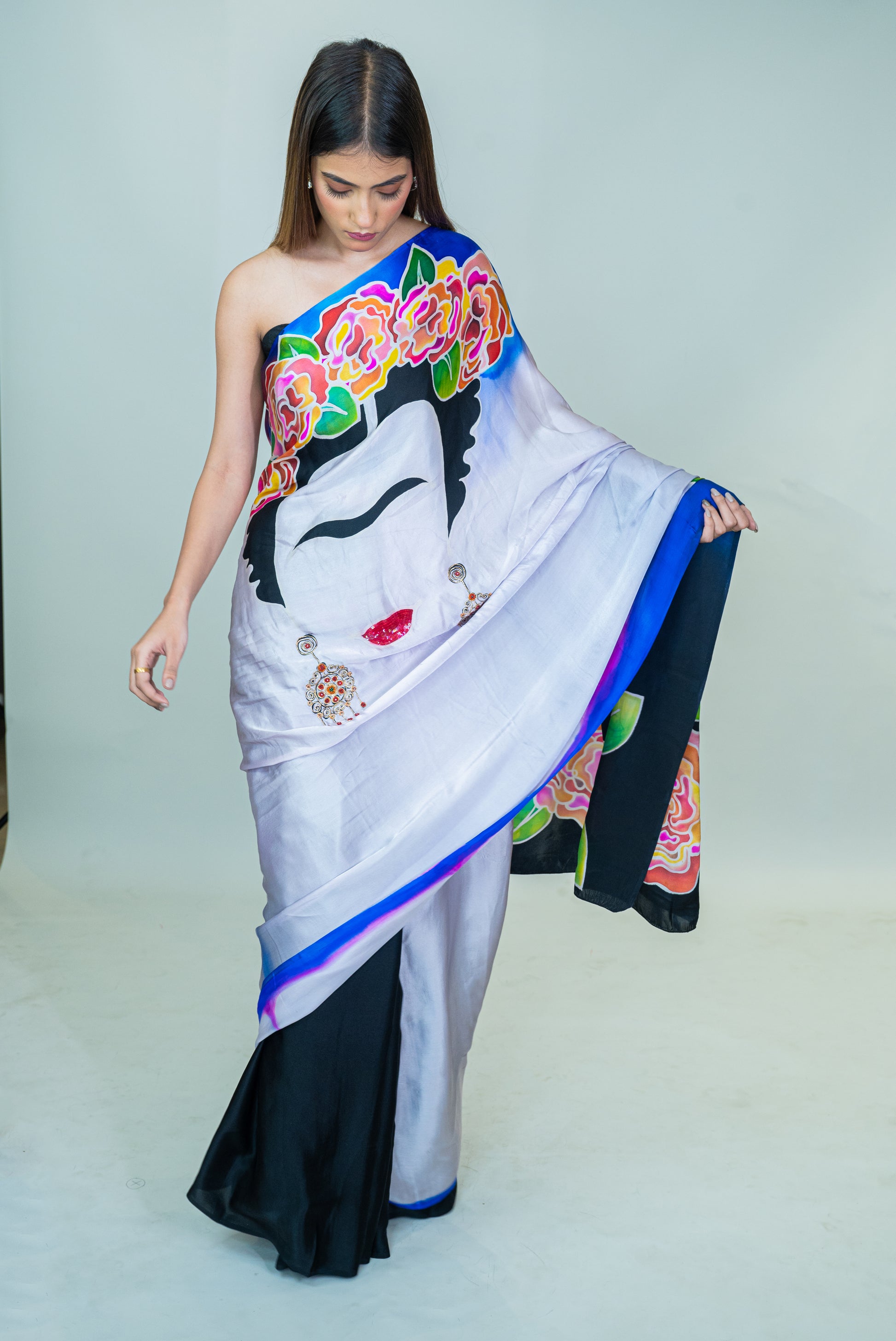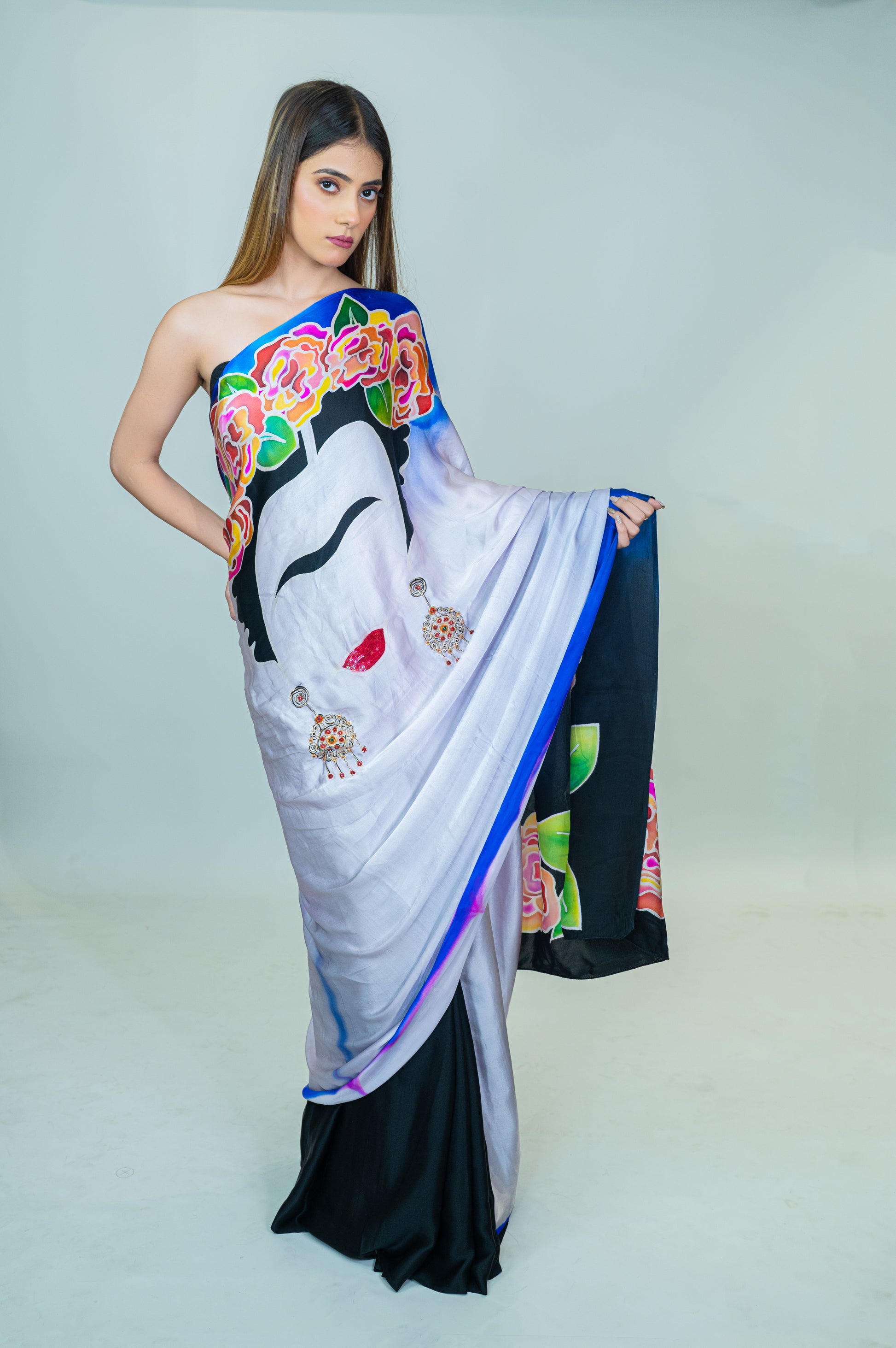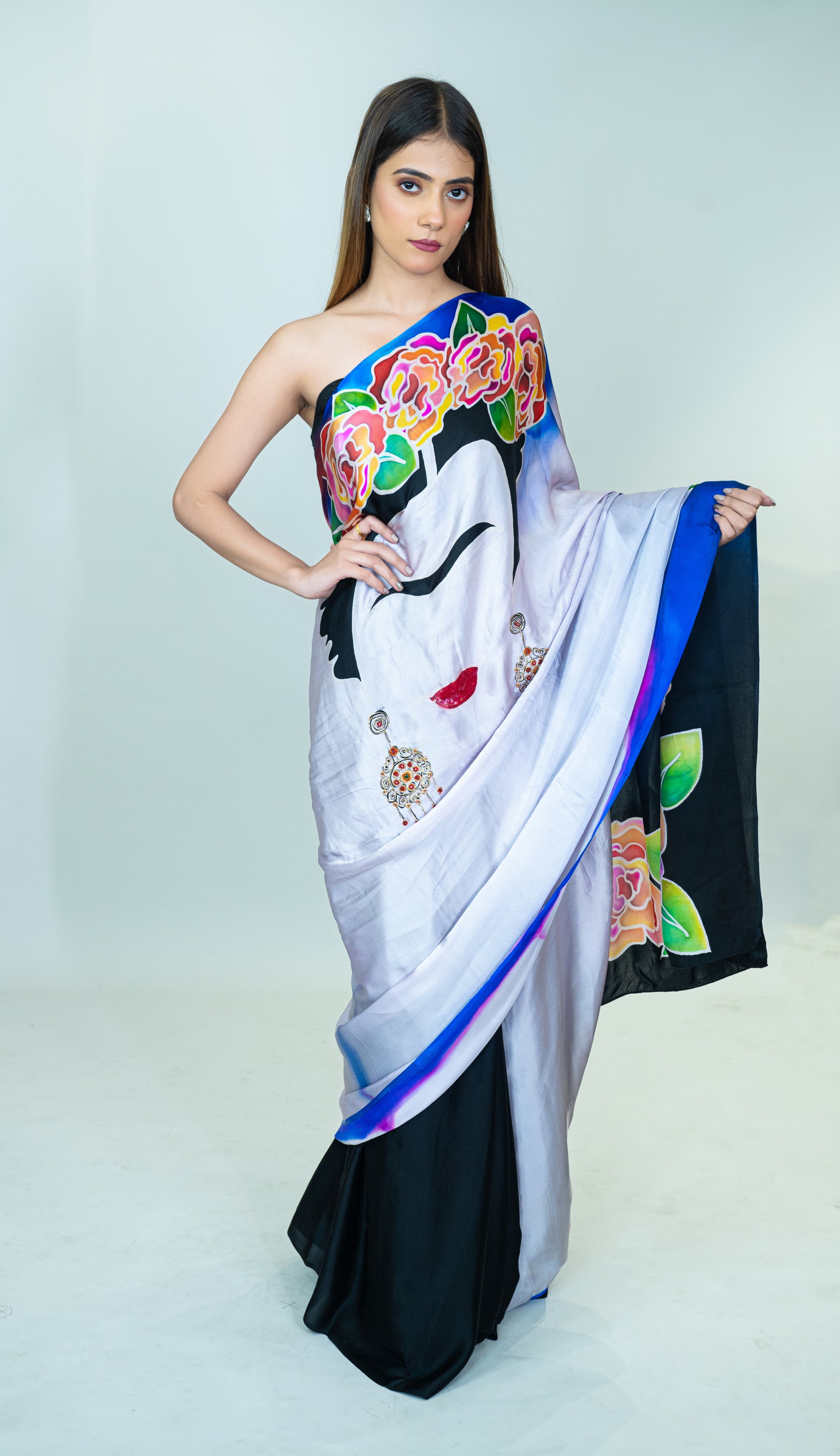 This pure silk satin saree features unique hand-painted art and intricate hand embroidery. The bold face design paired with vibrant floral patterns creates a striking visual impact, making this saree a true statement piece. The smooth satin fabric offers a fluid drape, perfect for special occasions where you want to stand out. Includes a matching blouse piece for a complete ensemble.