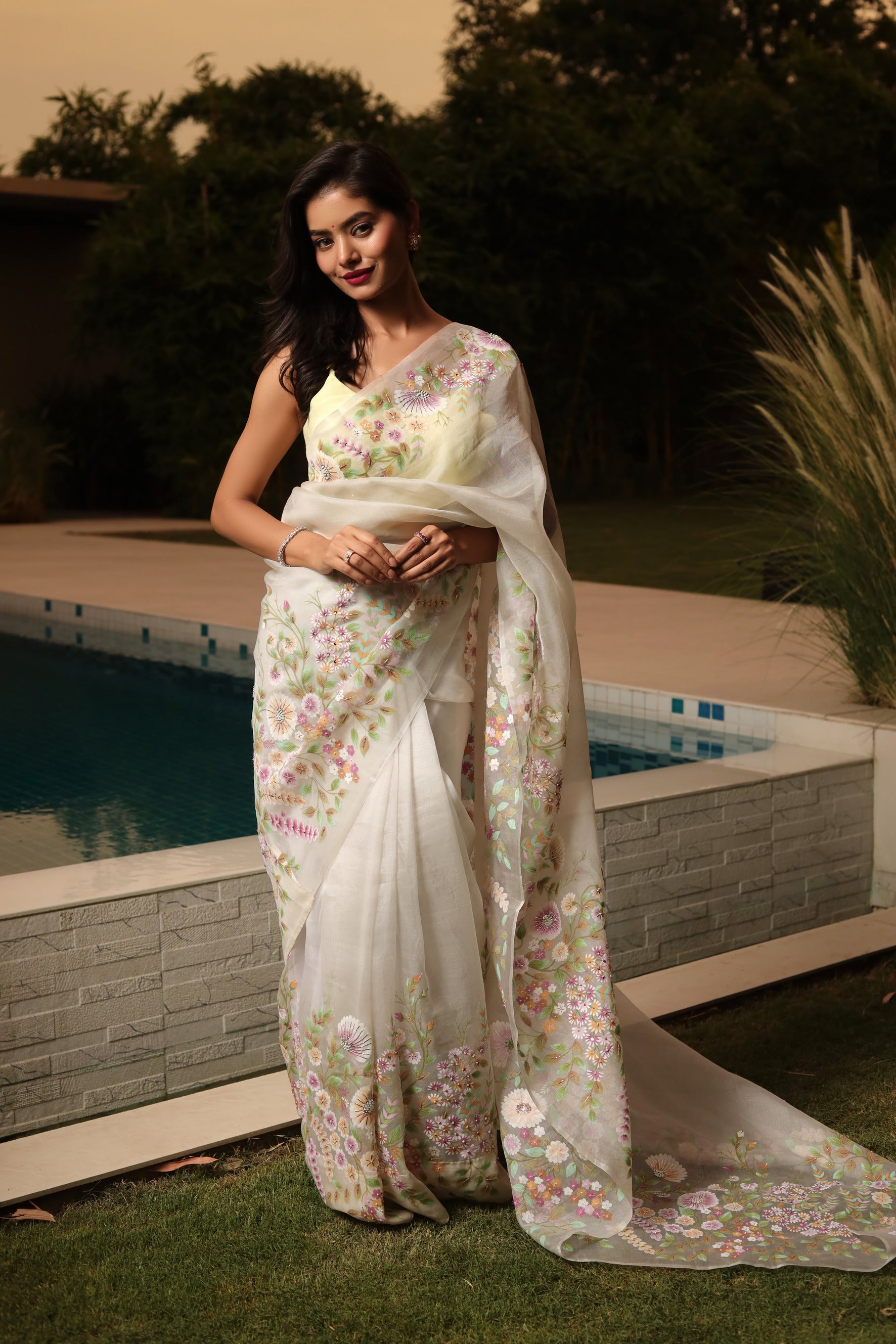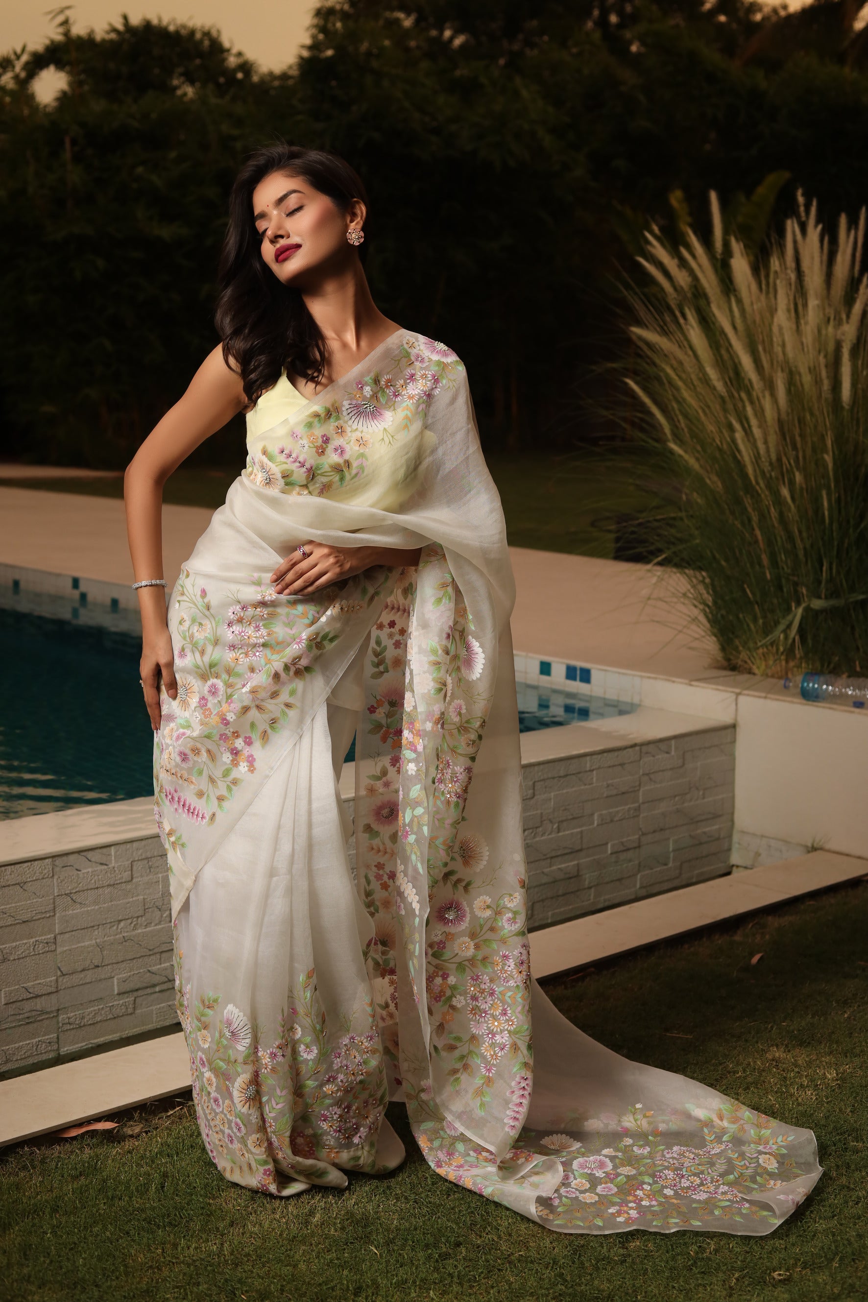 Hand-Painted Egg Grey Mulberry Silk Organza Saree with Pitan Work & Running Blouse Piece