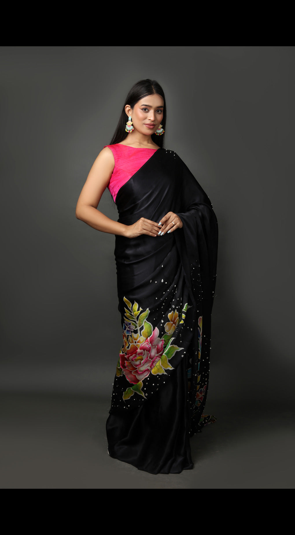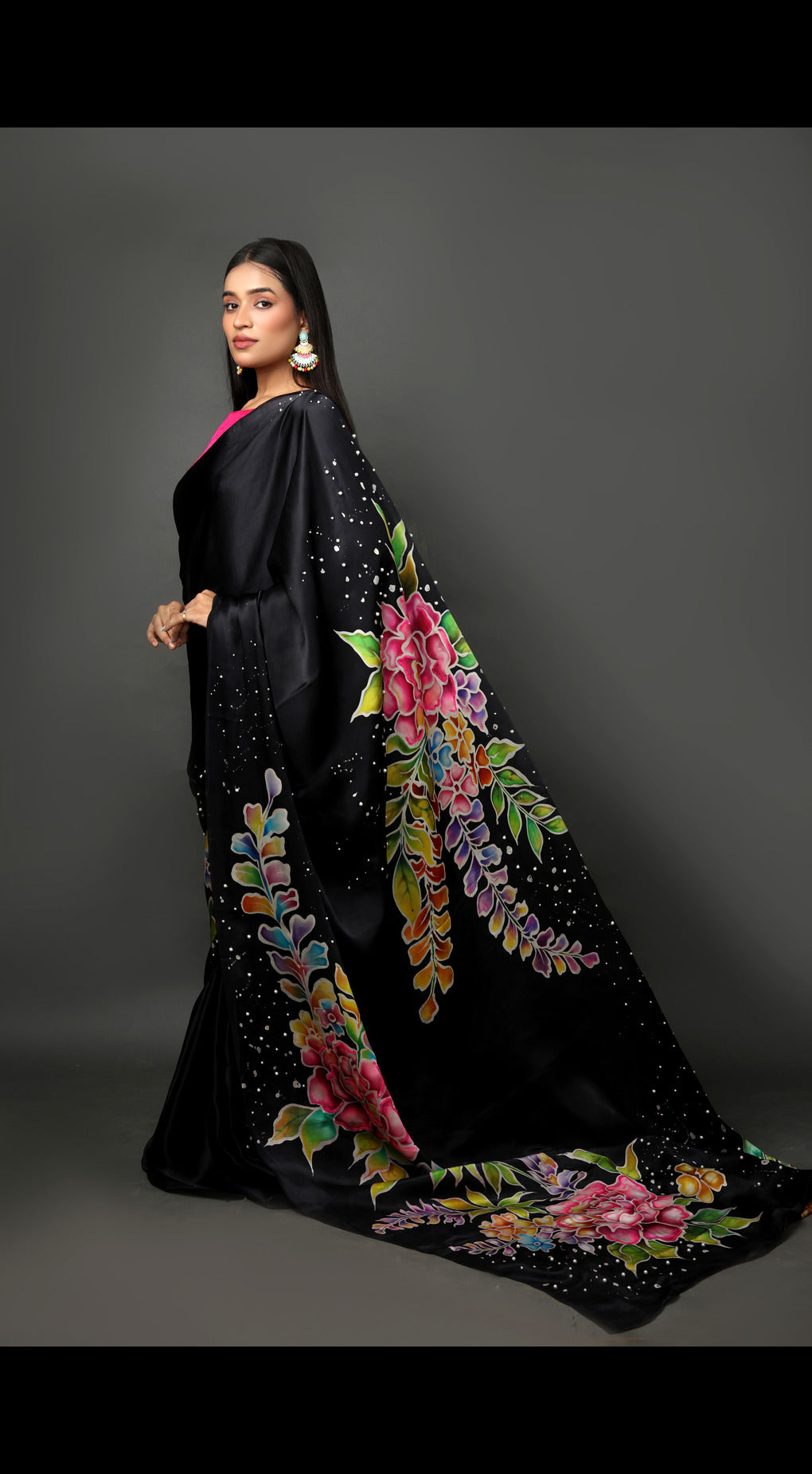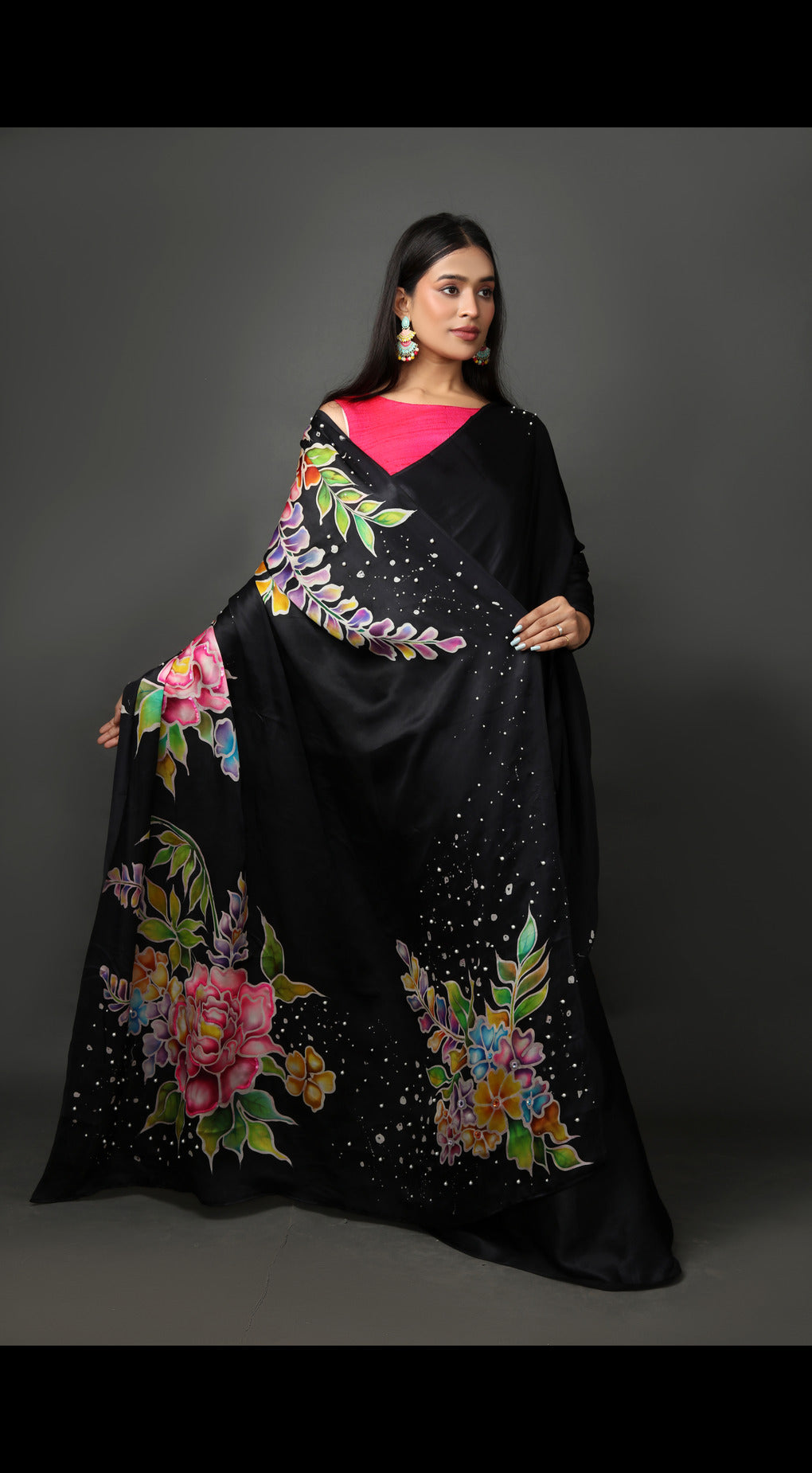This beautifully crafted saree showcases a vibrant floral design, hand-painted using premium French dyes. The intricate bead embroidery adds a refined touch, making it an ideal choice for festive events or evening gatherings. The striking contrast of the black base with colorful florals creates a stunning visual appeal. Wear this saree to make a statement with its handcrafted elegance and artistic detailing.