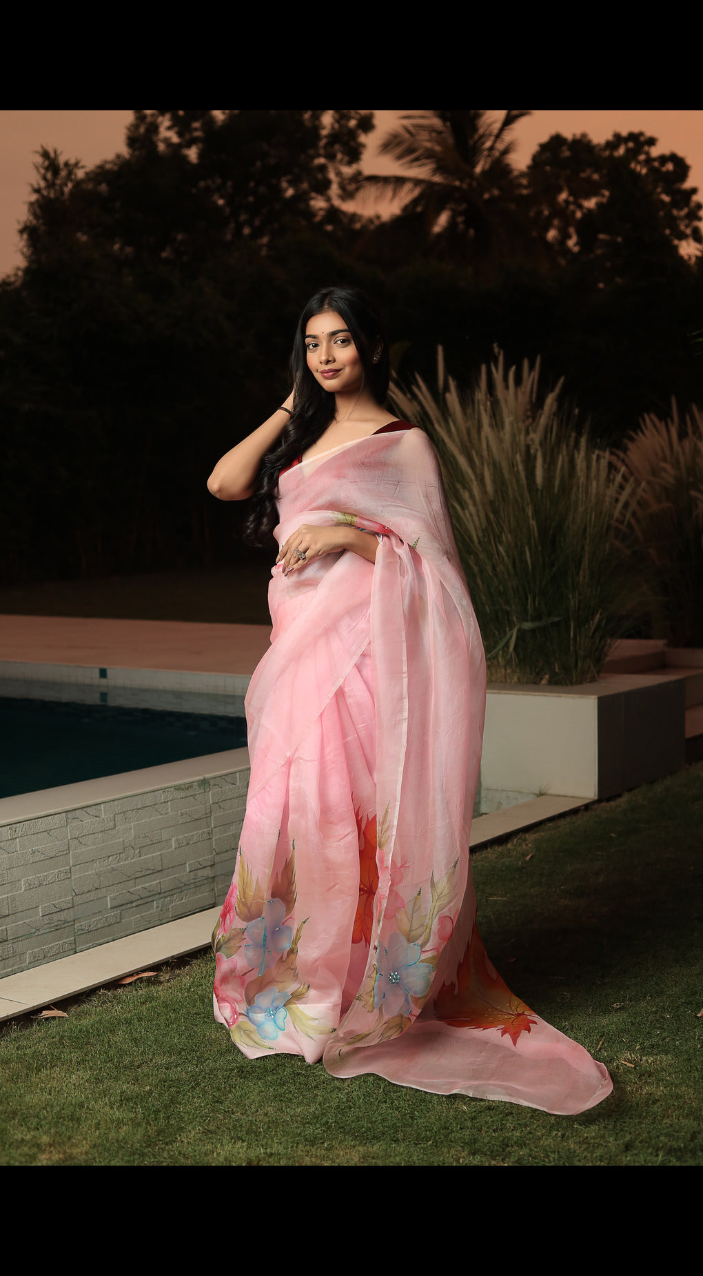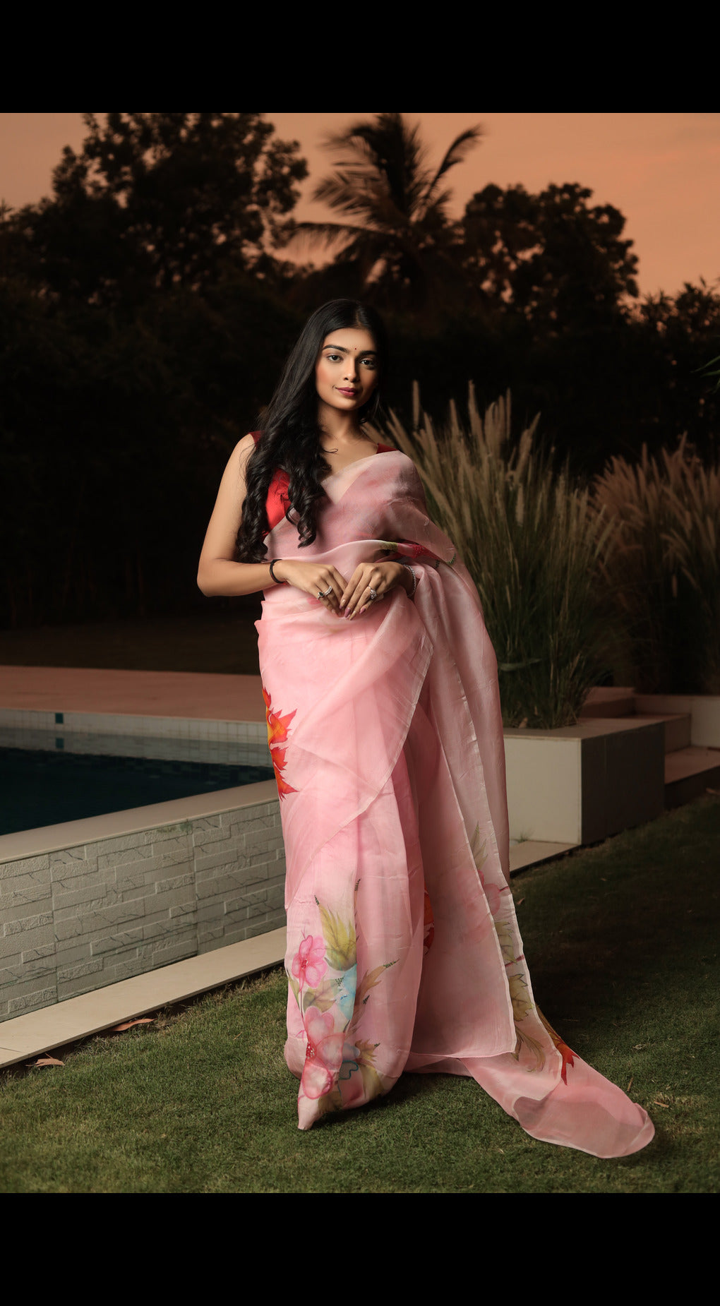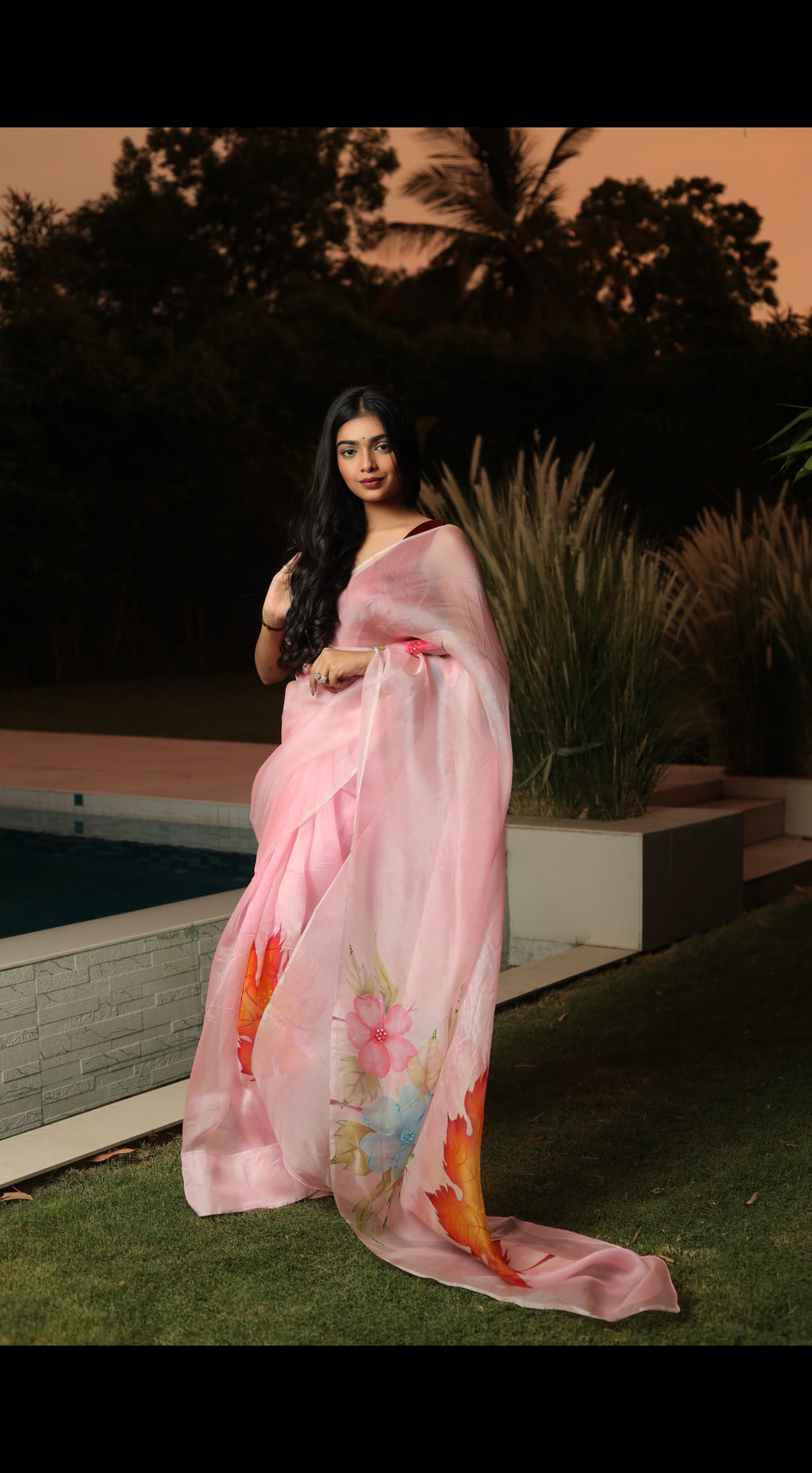 This exquisite hand-painted saree features vibrant floral designs created using the finest French dyes. Crafted from pure silk, this light pink saree offers a soft, luxurious drape, perfect for making a graceful statement at special events. The hand-painted details add a personal touch, making each piece unique.