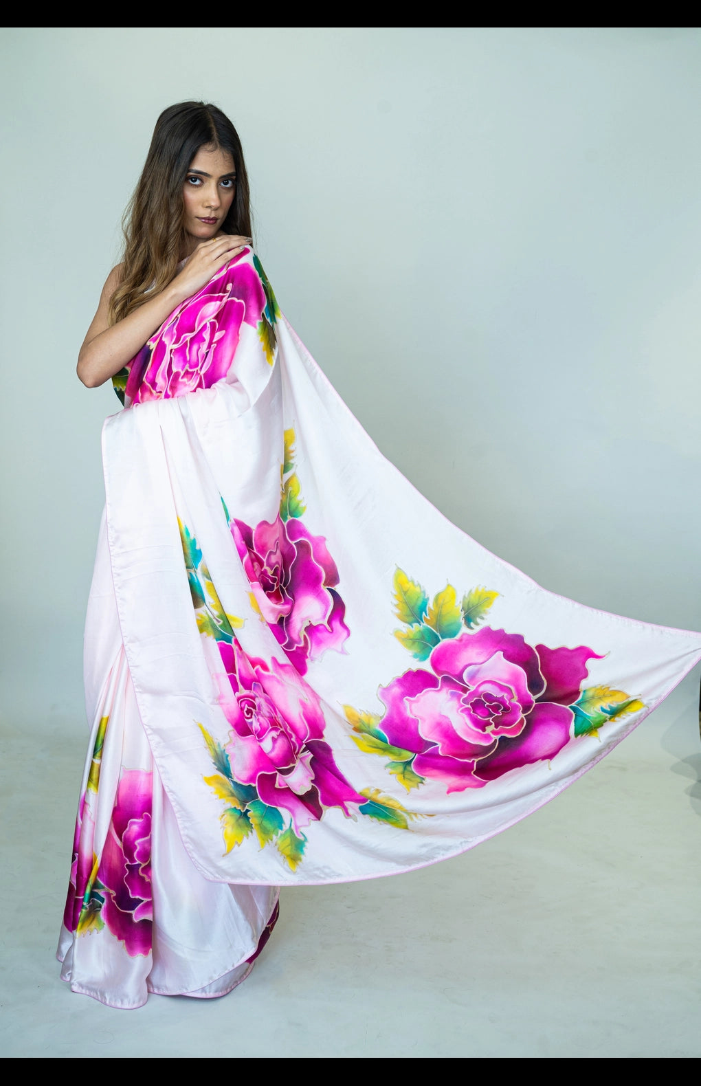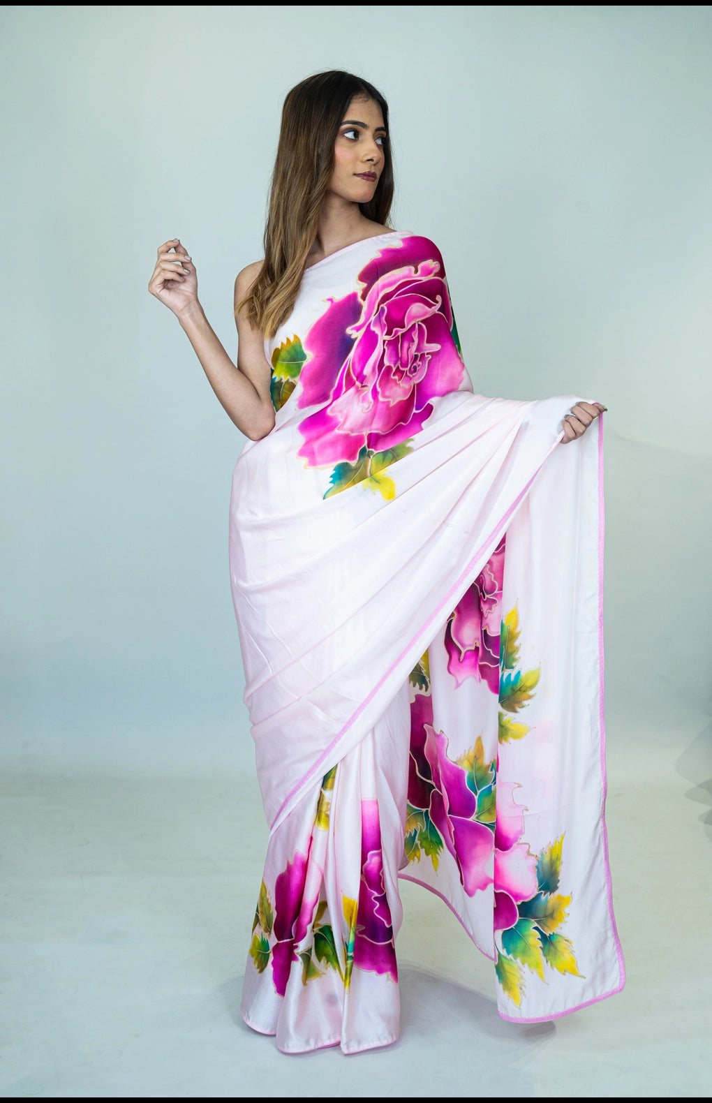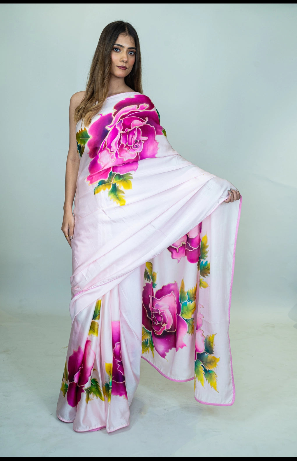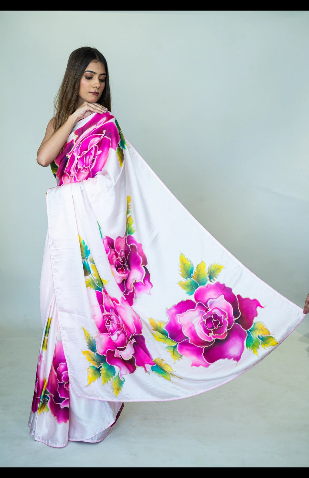 Hand-Painted Pure Silk Satin Saree with Floral Design