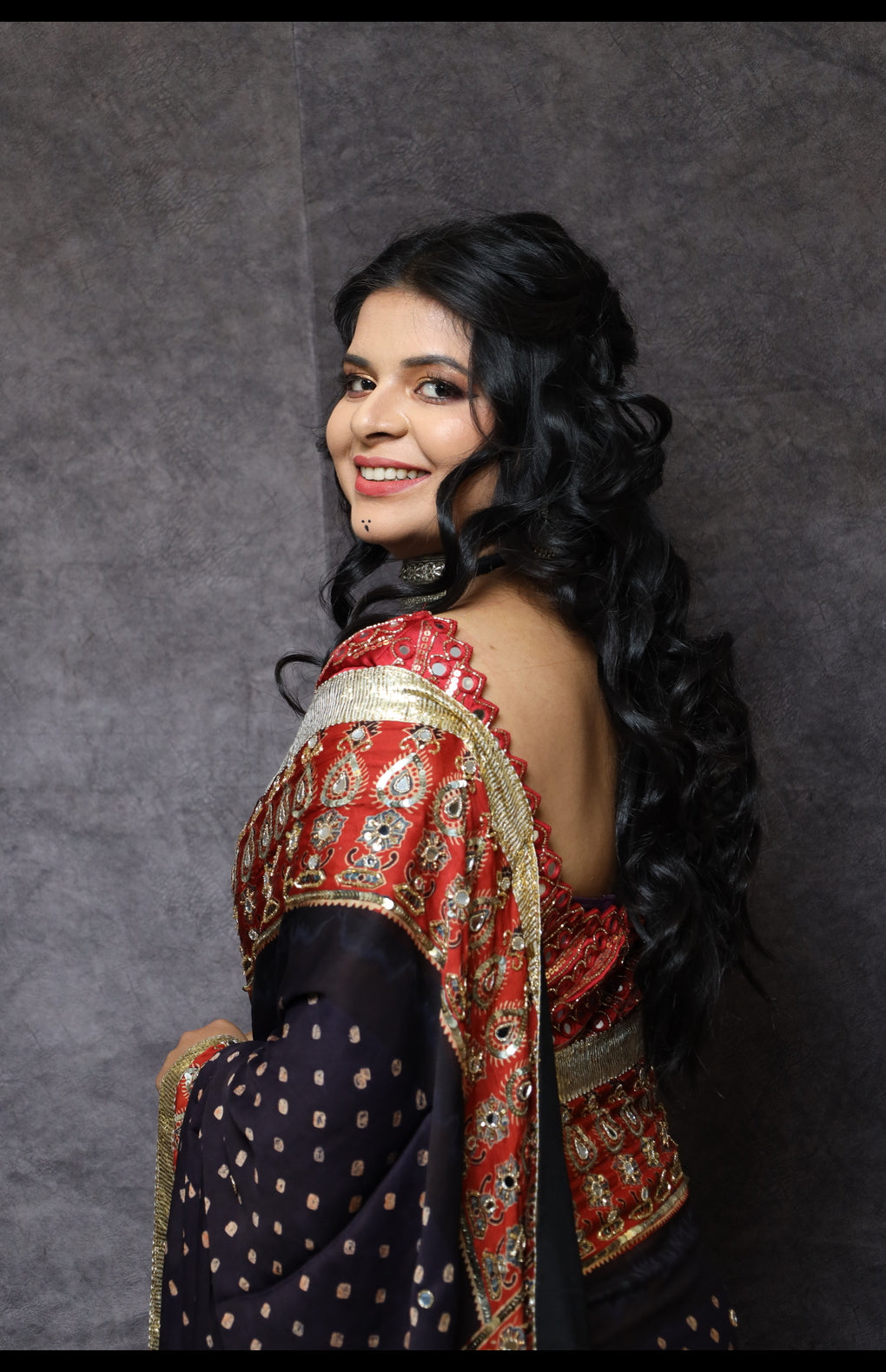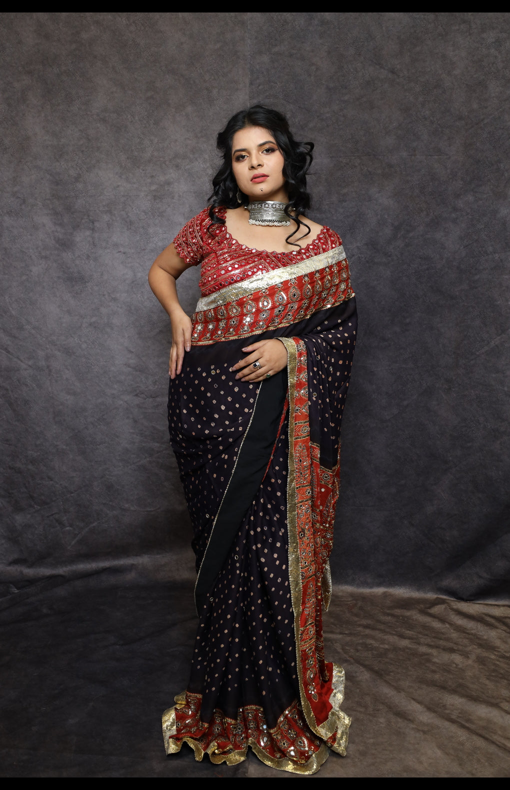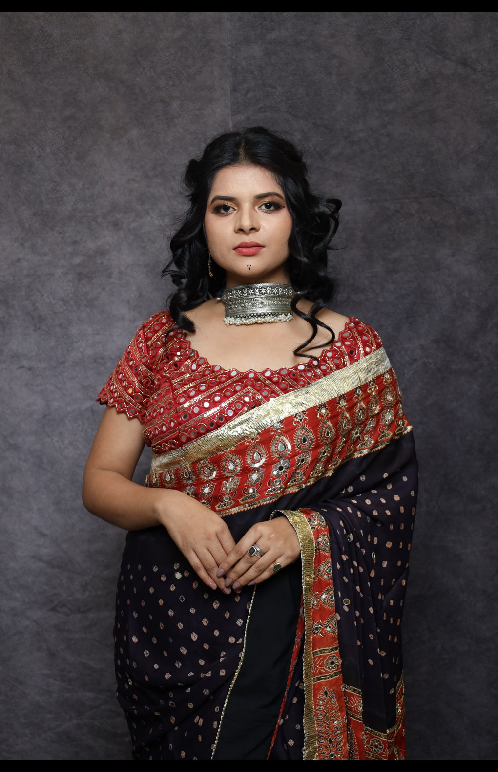 - Design: Features a classic Bandhani pattern on a deep base color, with vibrant red Ajrakh-embroidered borders and pallu. The golden detailing along the borders enhances the richness of the ensemble.