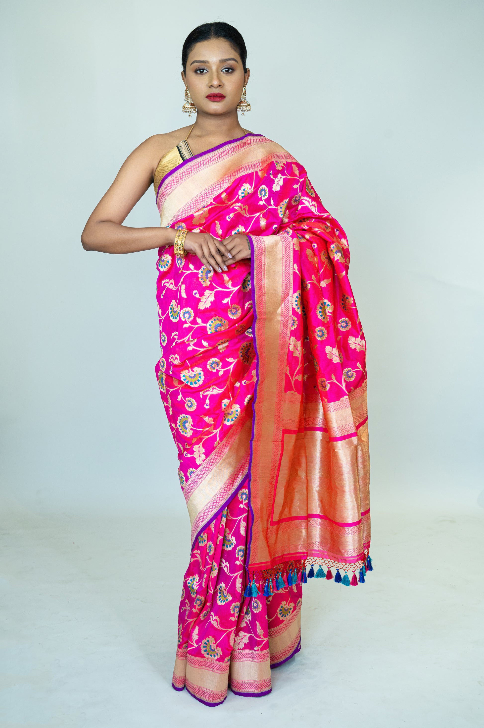 The intricate weaving showcases traditional craftsmanship and a vibrant color palette, making it a standout choice for special occasions. With rich zari borders and delicate floral patterns, this saree captures the essence of timeless tradition, perfect for weddings, festivals, or celebrations. The smooth, lustrous fabric drapes beautifully, offering both comfort and grandeur.