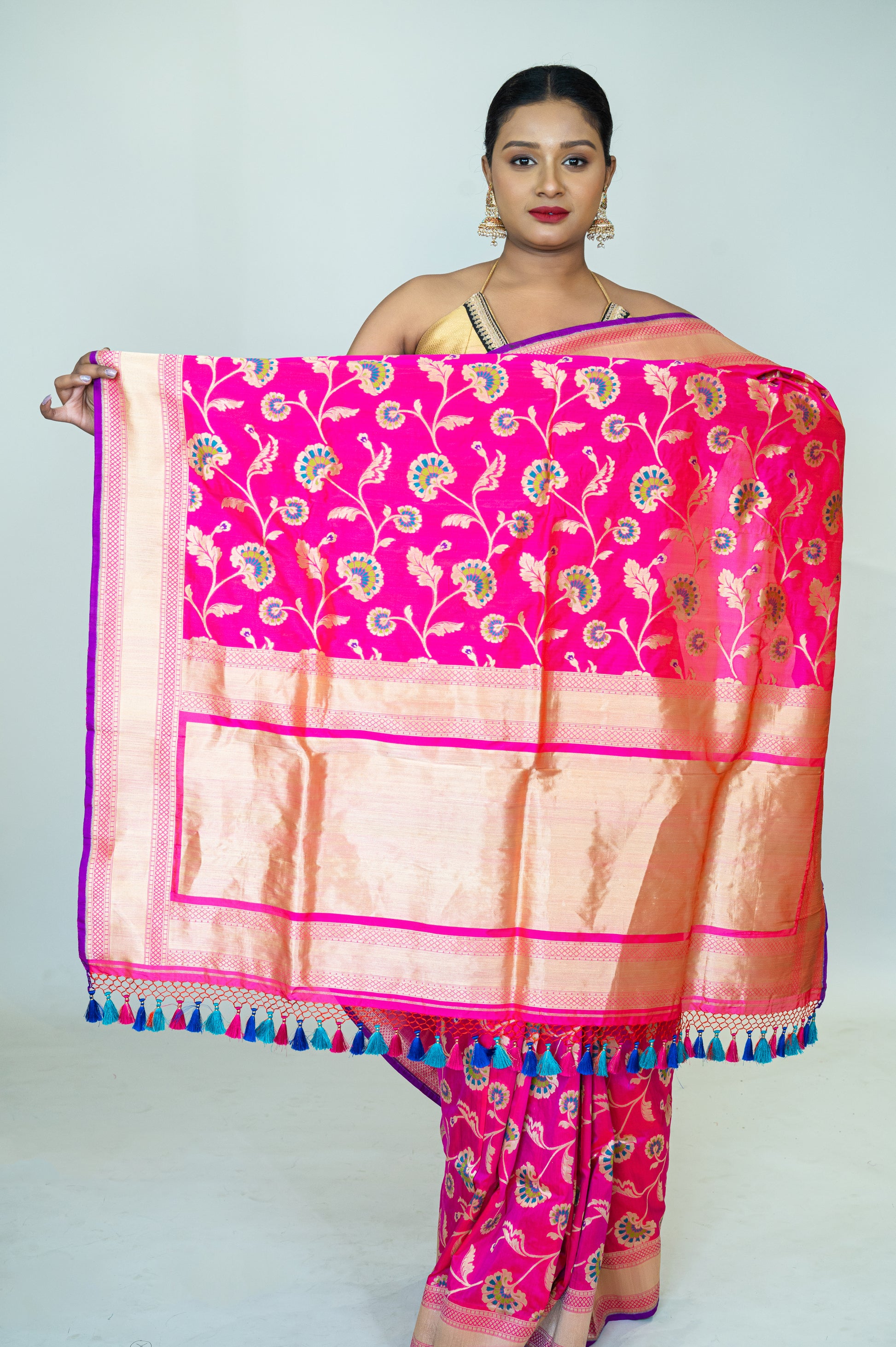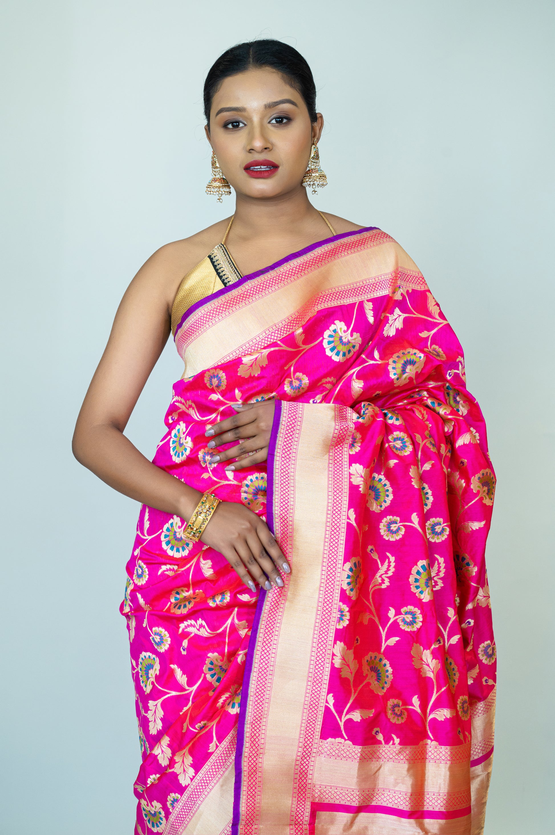 This exquisite hand-woven Banarasi saree is crafted from the finest Katan silk, made with 100% pure mulberry silk.