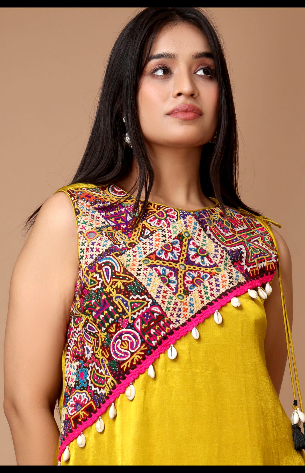 Step into the world of traditional artistry with this stunning handcrafted Ajrakh and Kutchi embroidered outfit. The vibrant top, adorned with intricate Kutchi mirror work, complements the rich Ajrakh printed , offering a blend of modern design with age-old techniques. Shell details and playful tassels add a unique touch, making it perfect for festive occasions or cultural celebrations. Available in a comfortable fit, this outfit is designed for effortless style and all-day wear.