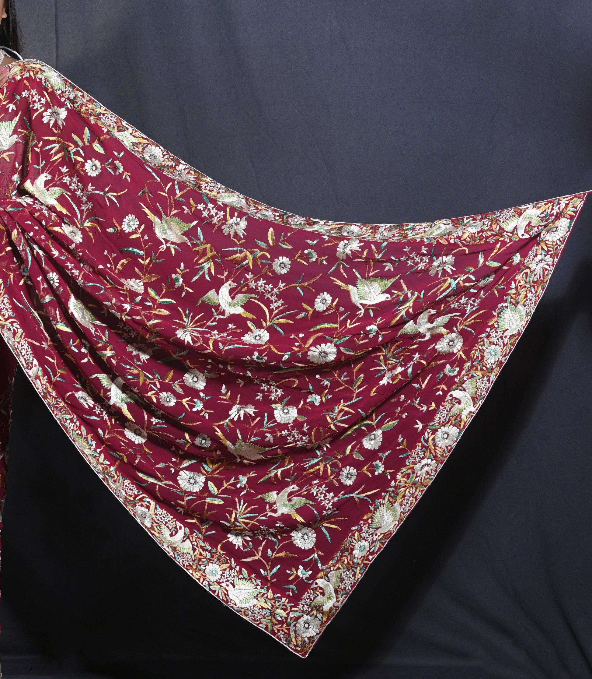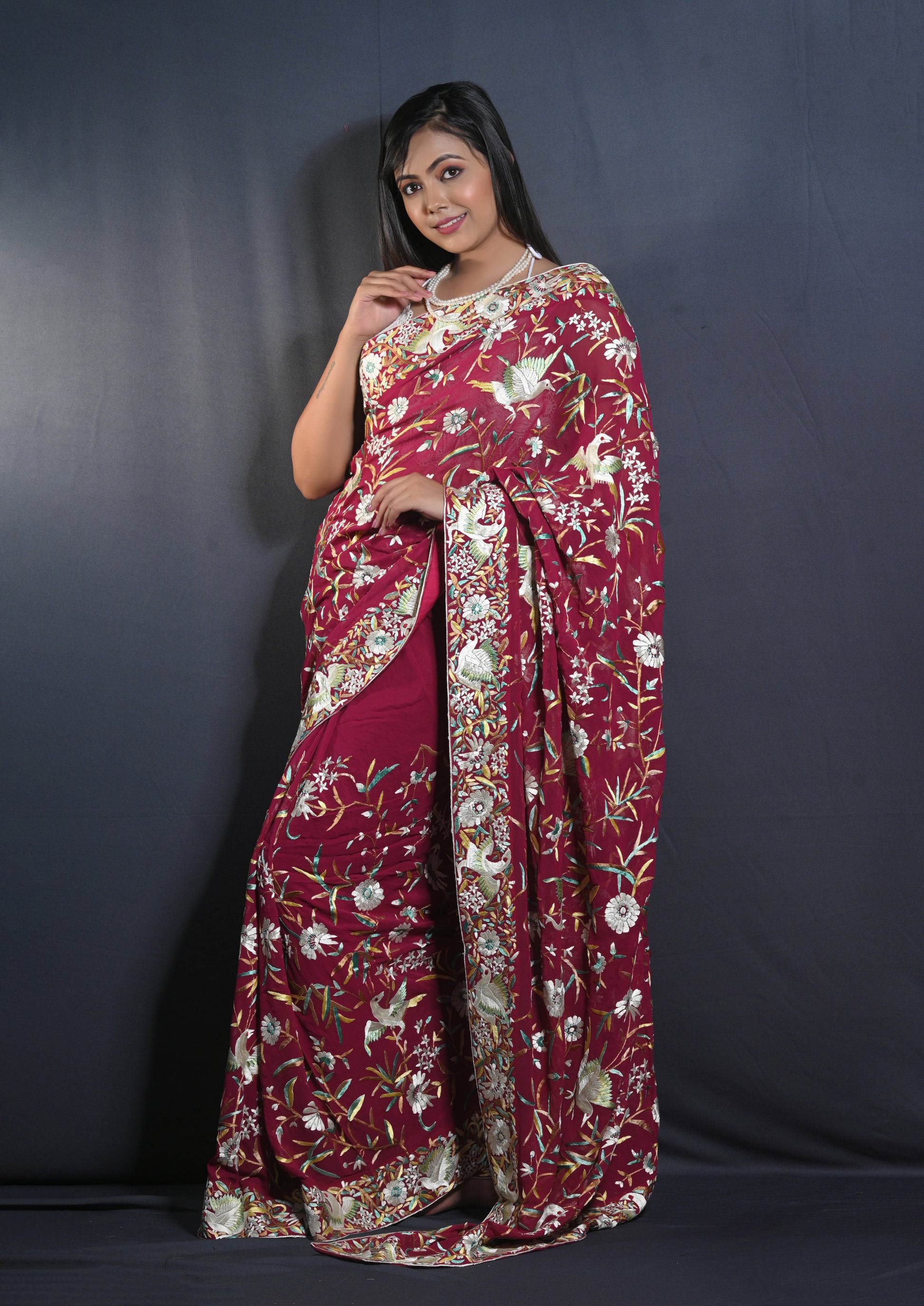 This Parsi Gara saree by Label Priyanka Jha is made from georgette fabric in a deep royal blue color. Featuring detailed hand embroidery, it highlights traditional Parsi Gara techniques with floral and bird motifs. The meticulous craftsmanship and fine details make this saree a standout piece for special events and festive occasions.