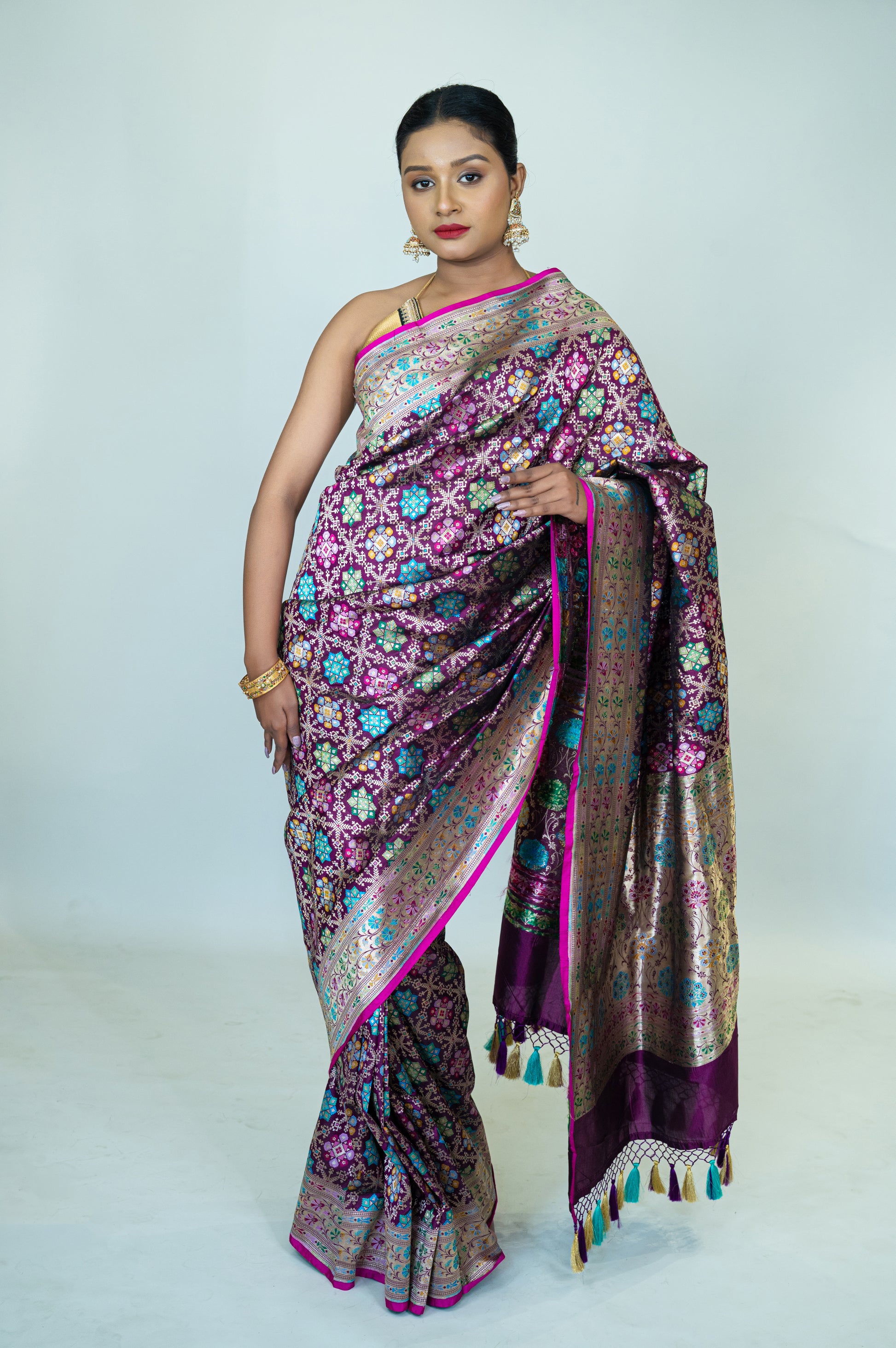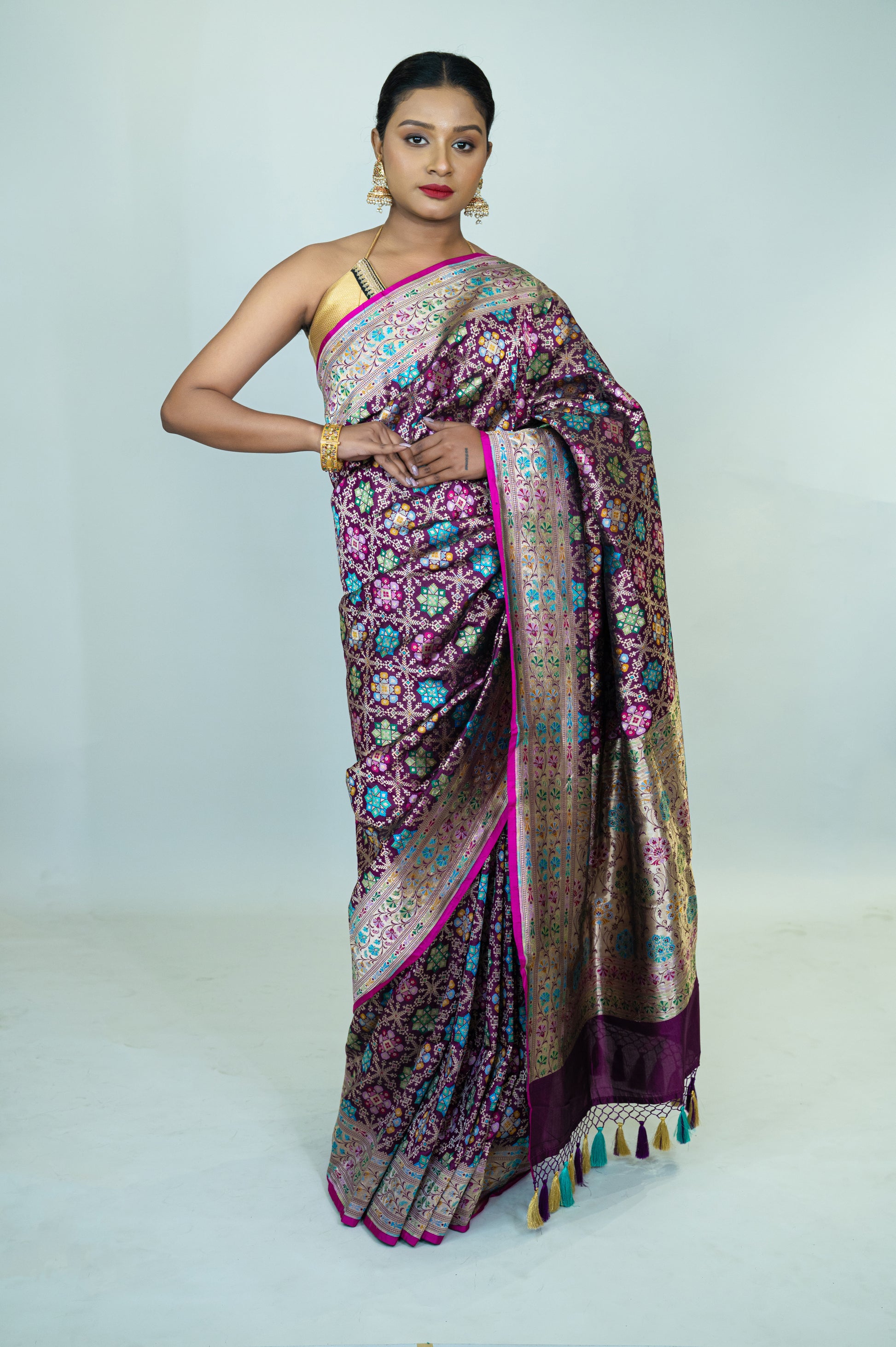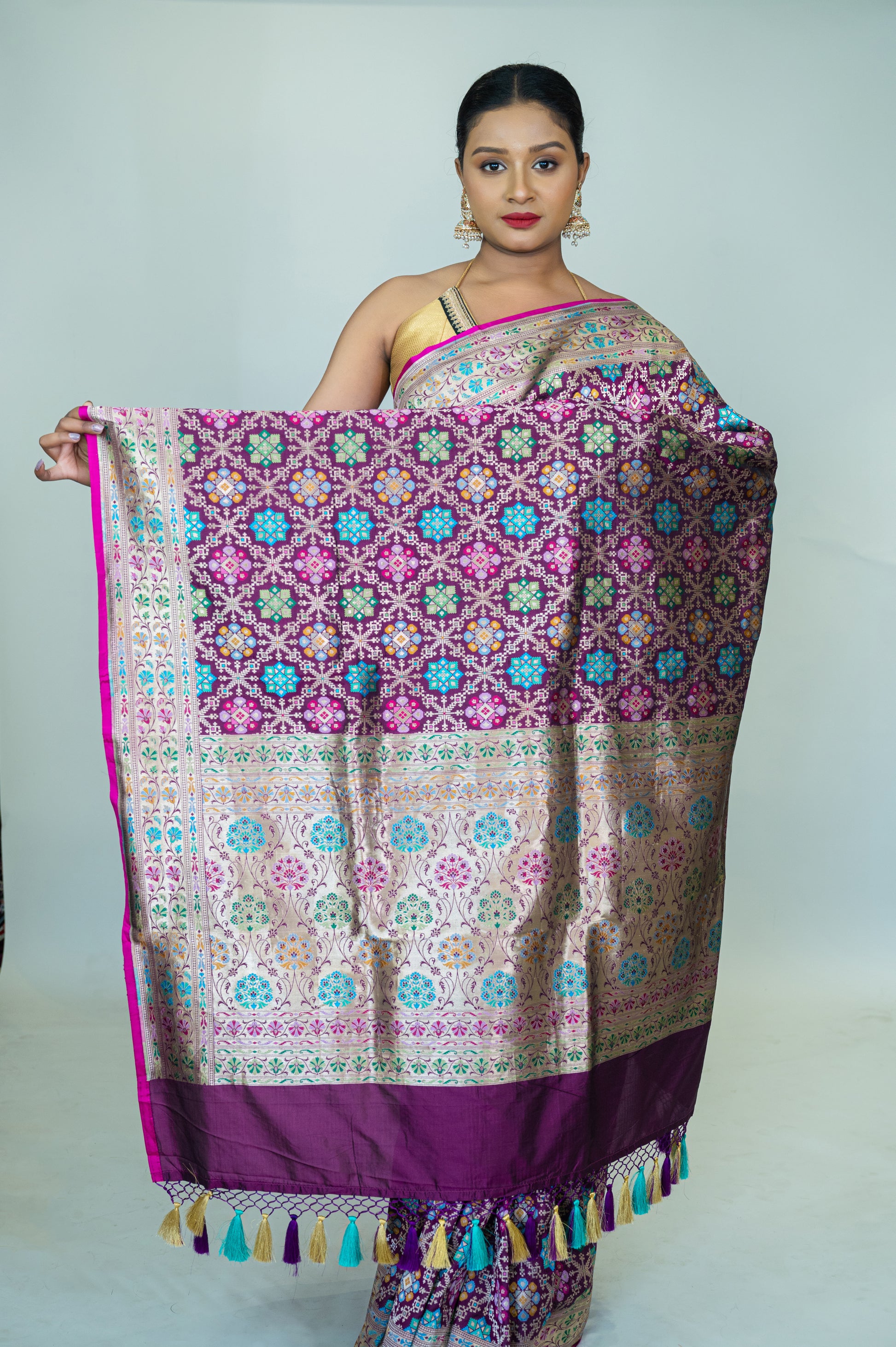 This beautiful saree showcases the rich tradition of handwoven Katan silk, crafted from the finest mulberry silk. The intricate Patola Banarasi design, with its detailed motifs and vibrant colors, adds a unique charm to this luxurious fabric. The pure Katan silk gives the saree a smooth texture and a radiant finish, making it an ideal choice for weddings and special events. The tassel detail along the pallu enhances the overall appeal of this timeless piece, making it a must-have for any occasion.