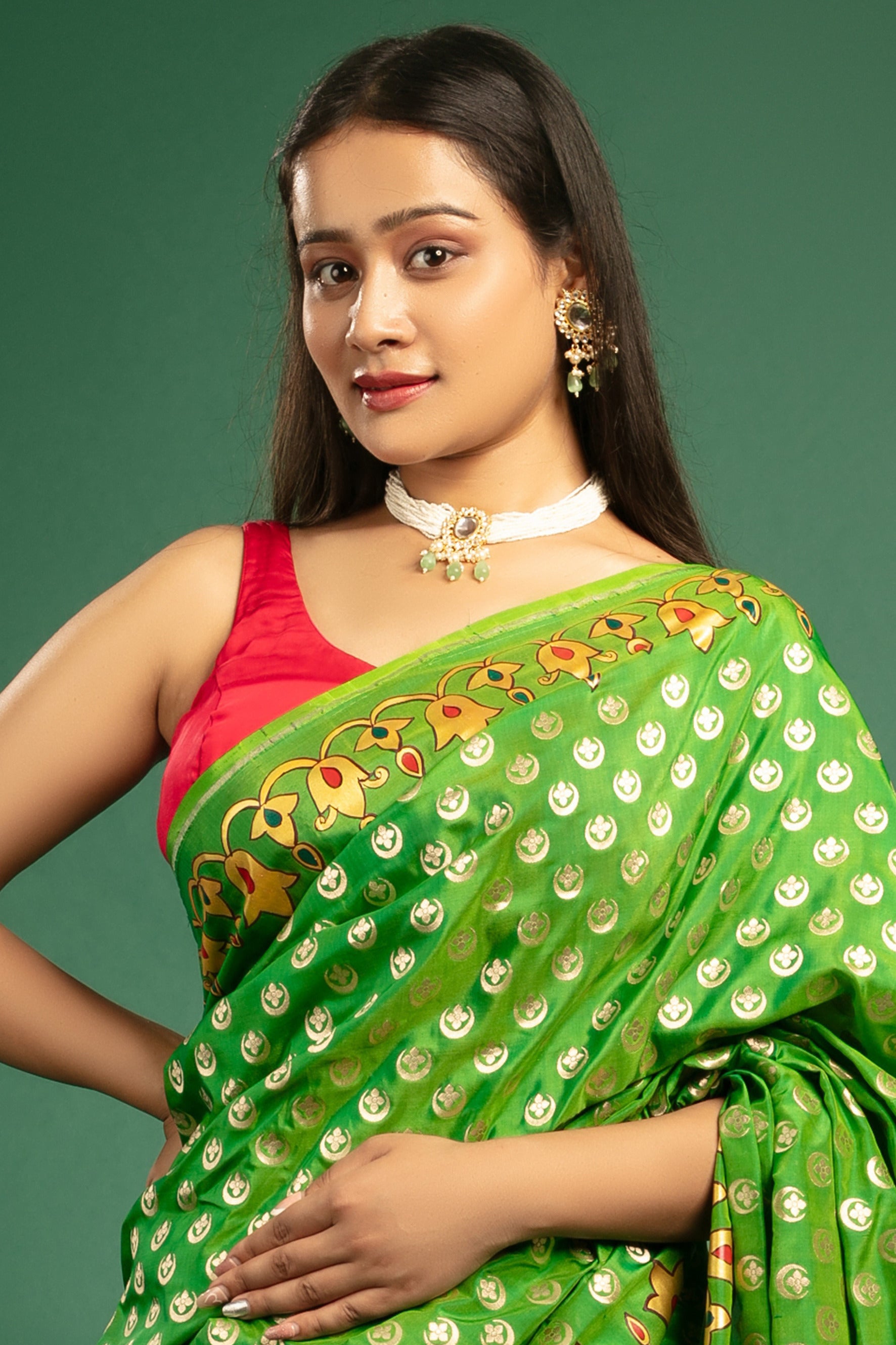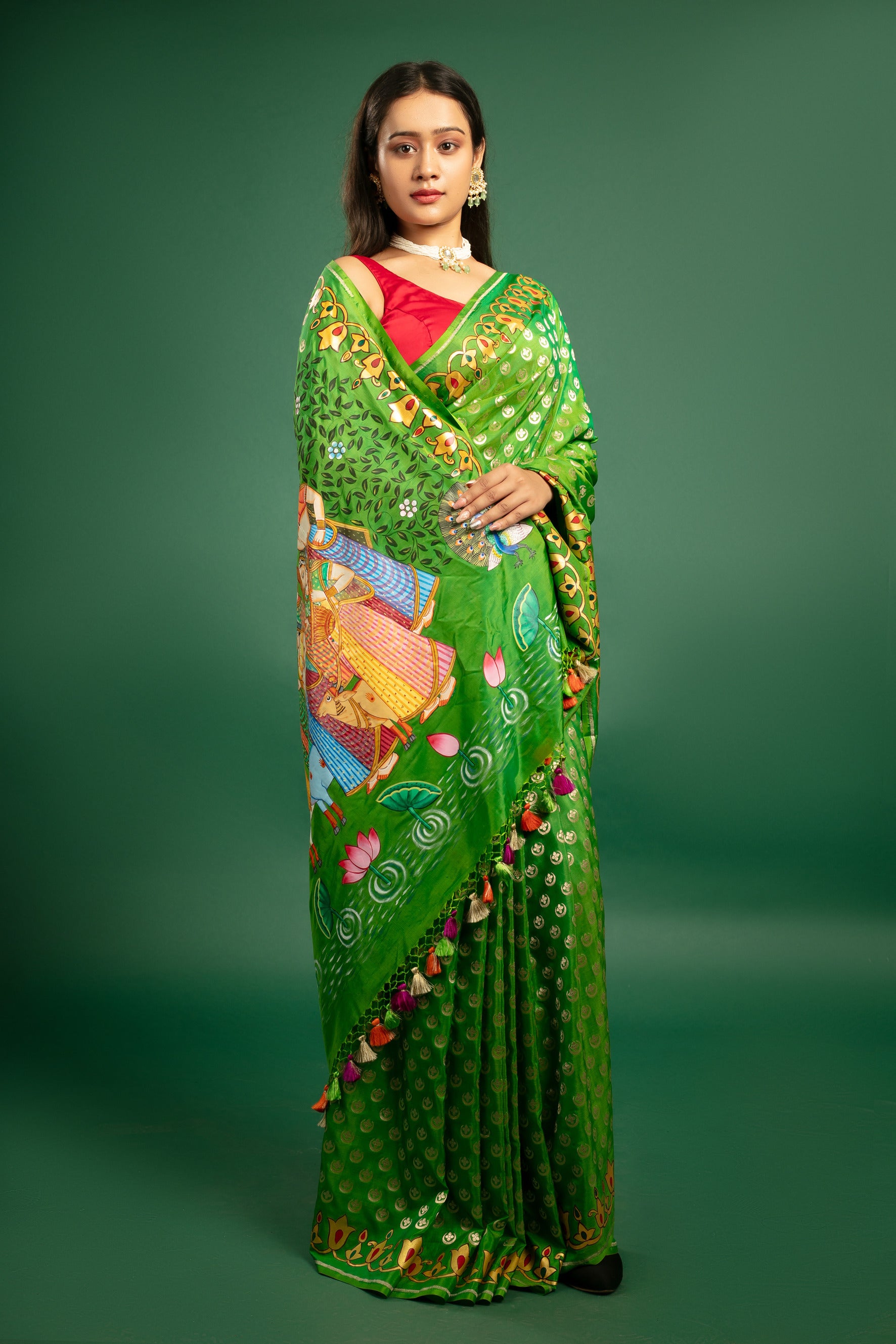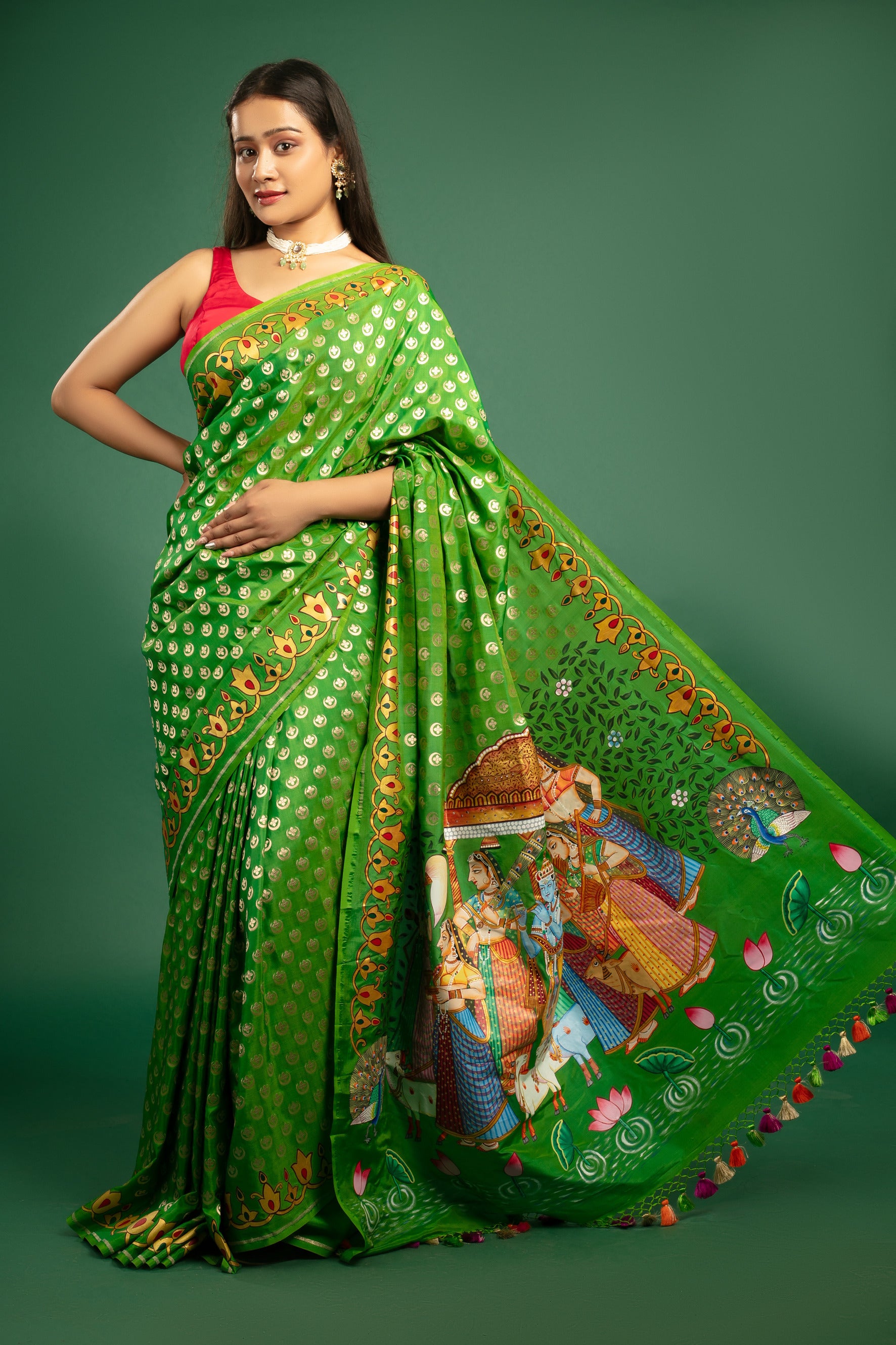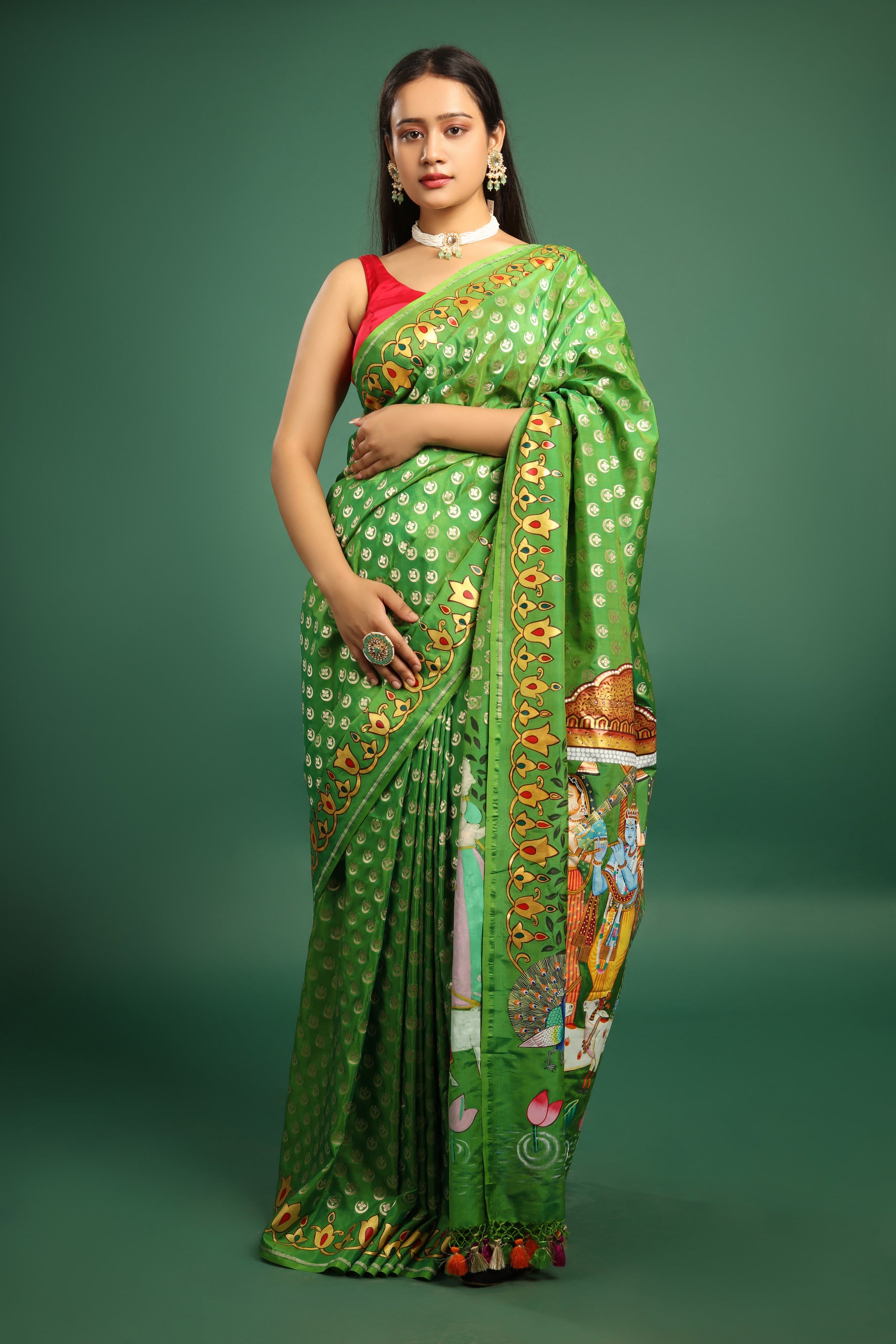 Leaf Green Banarasi Katan Silk Saree with Pichwai Art
