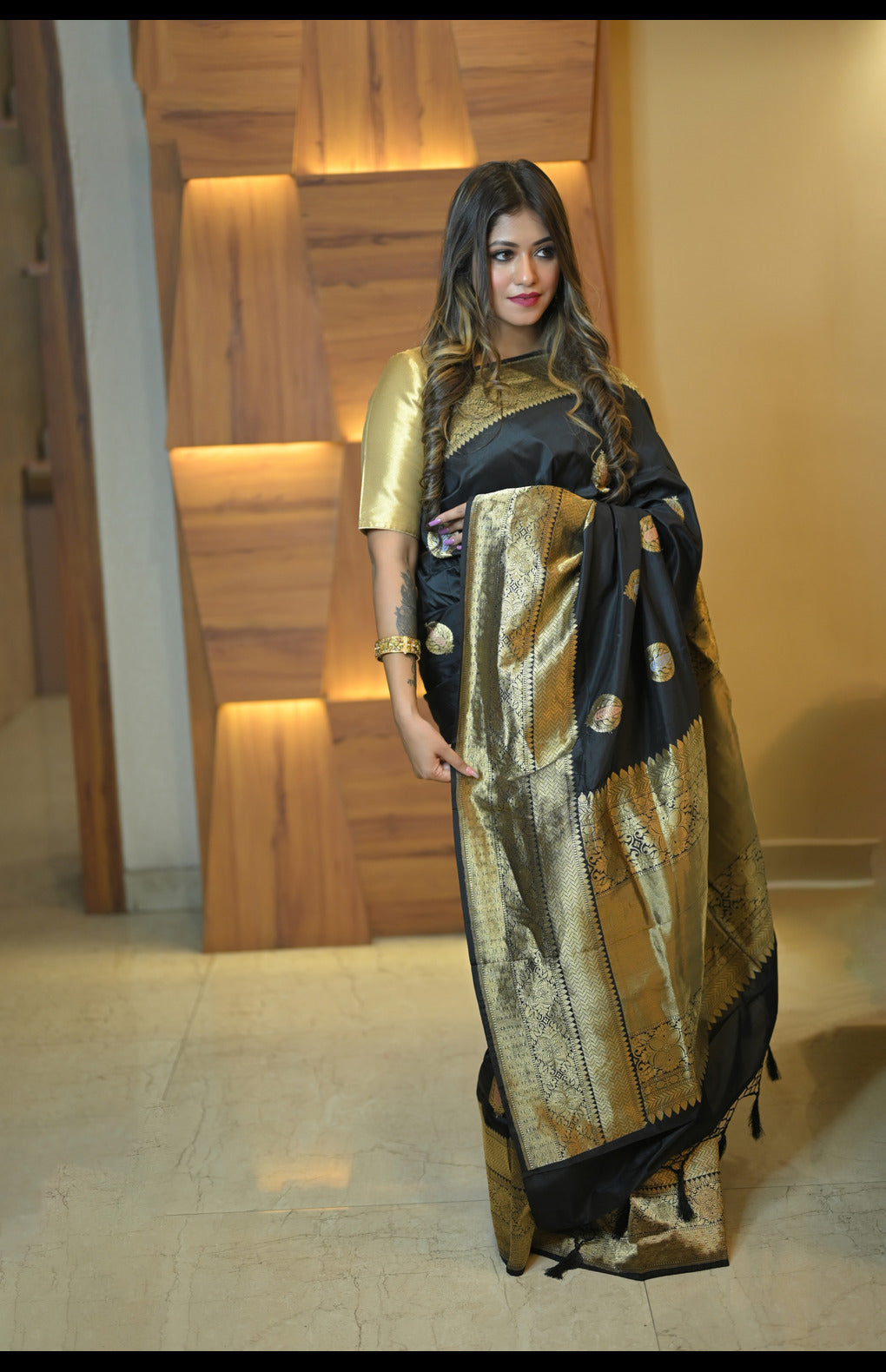 - Design: The black saree is adorned with intricate golden Kadhua Meena bootas and an ornate Kadhiyal border, which adds a touch of traditional grandeur. The border is beautifully woven with detailed patterns, enhancing the saree's overall elegance.