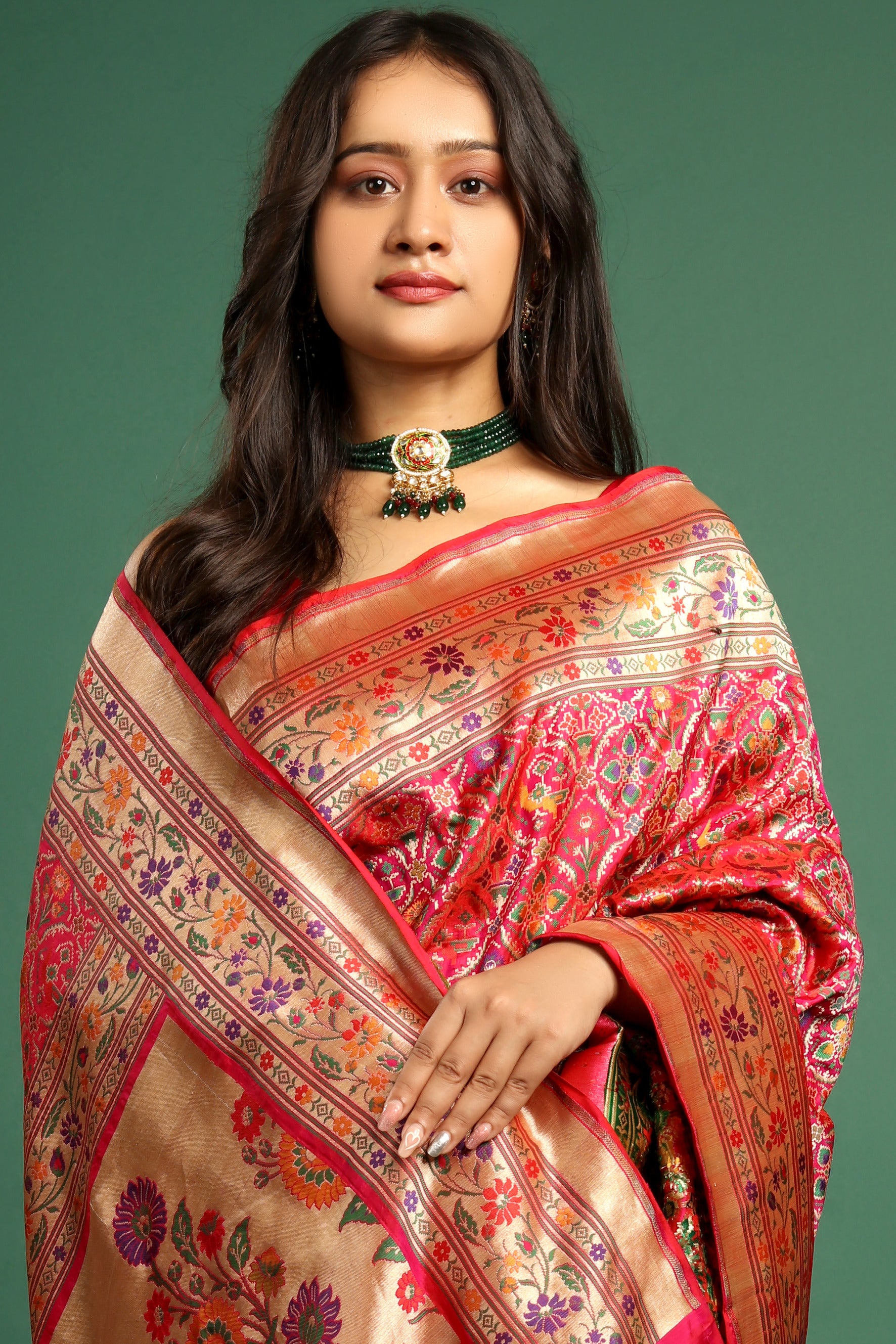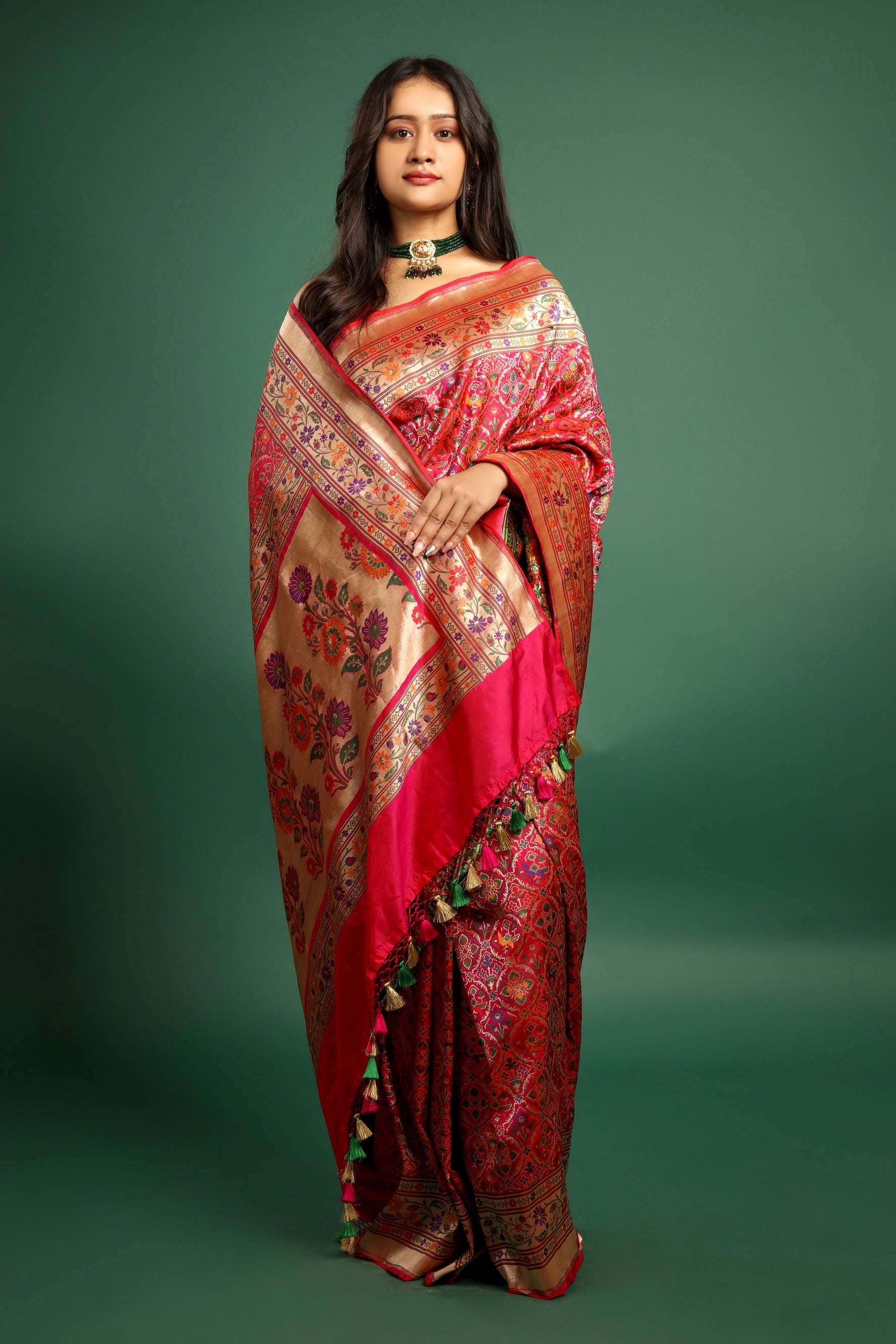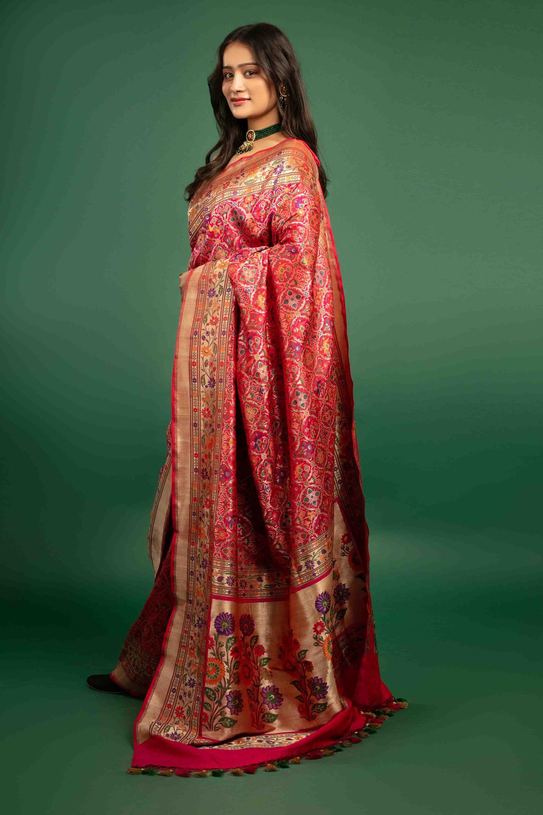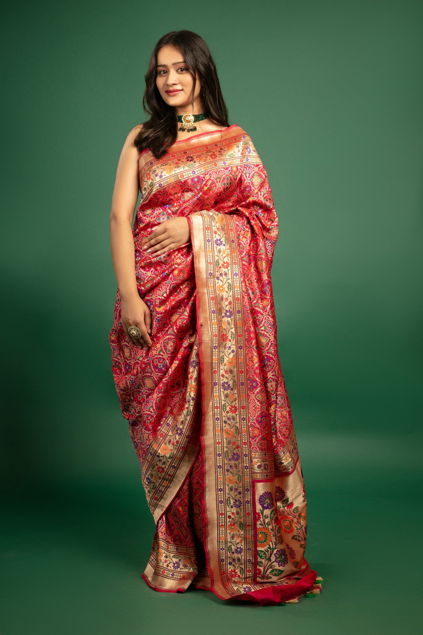 Elevate your style with our luxurious handwoven Minakari Banarasi saree in stunning red and rani hues. The detailed Minakari work adds an elegant touch, while the accompanying unstitched blouse allows you to customize the fit. Perfect for any special occasion, this saree is sure to make you feel confident and beautiful.