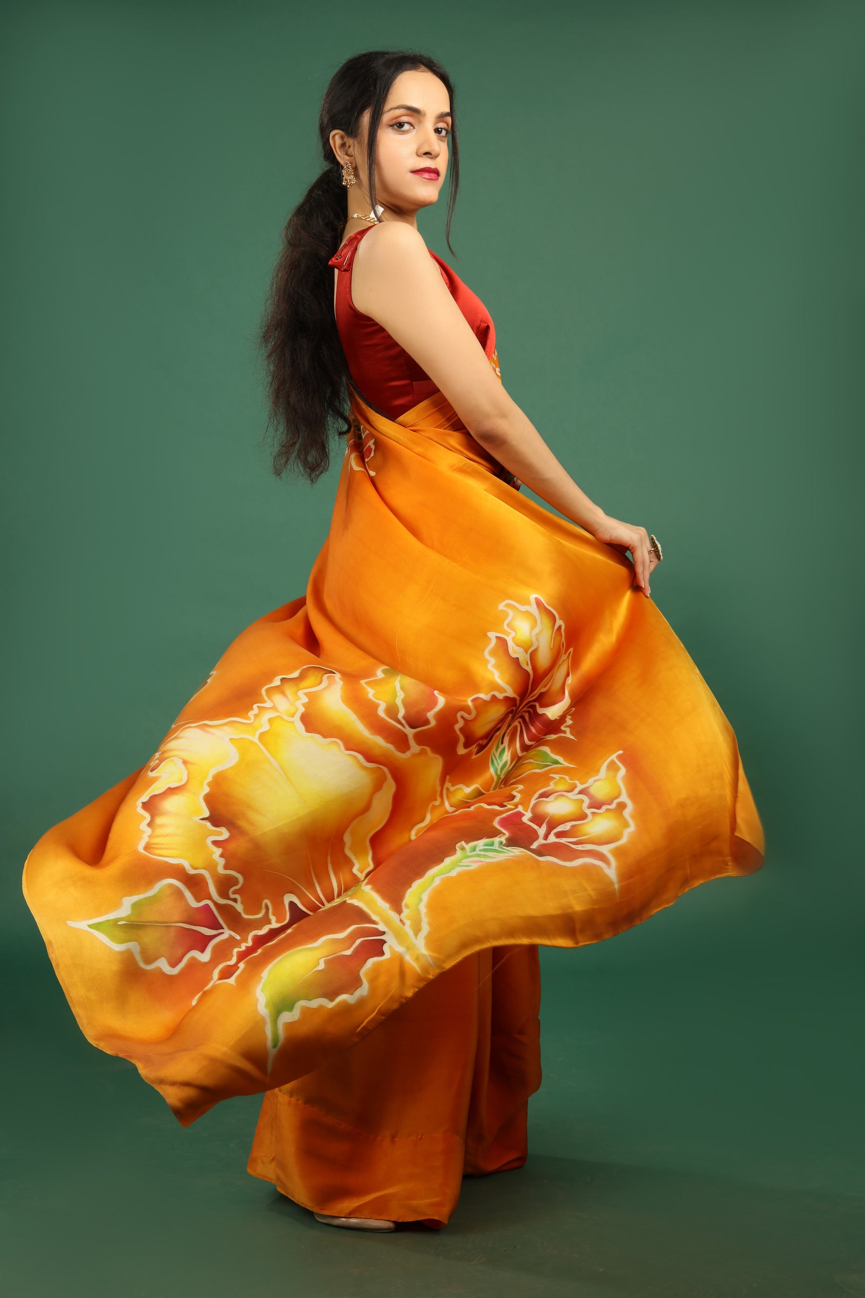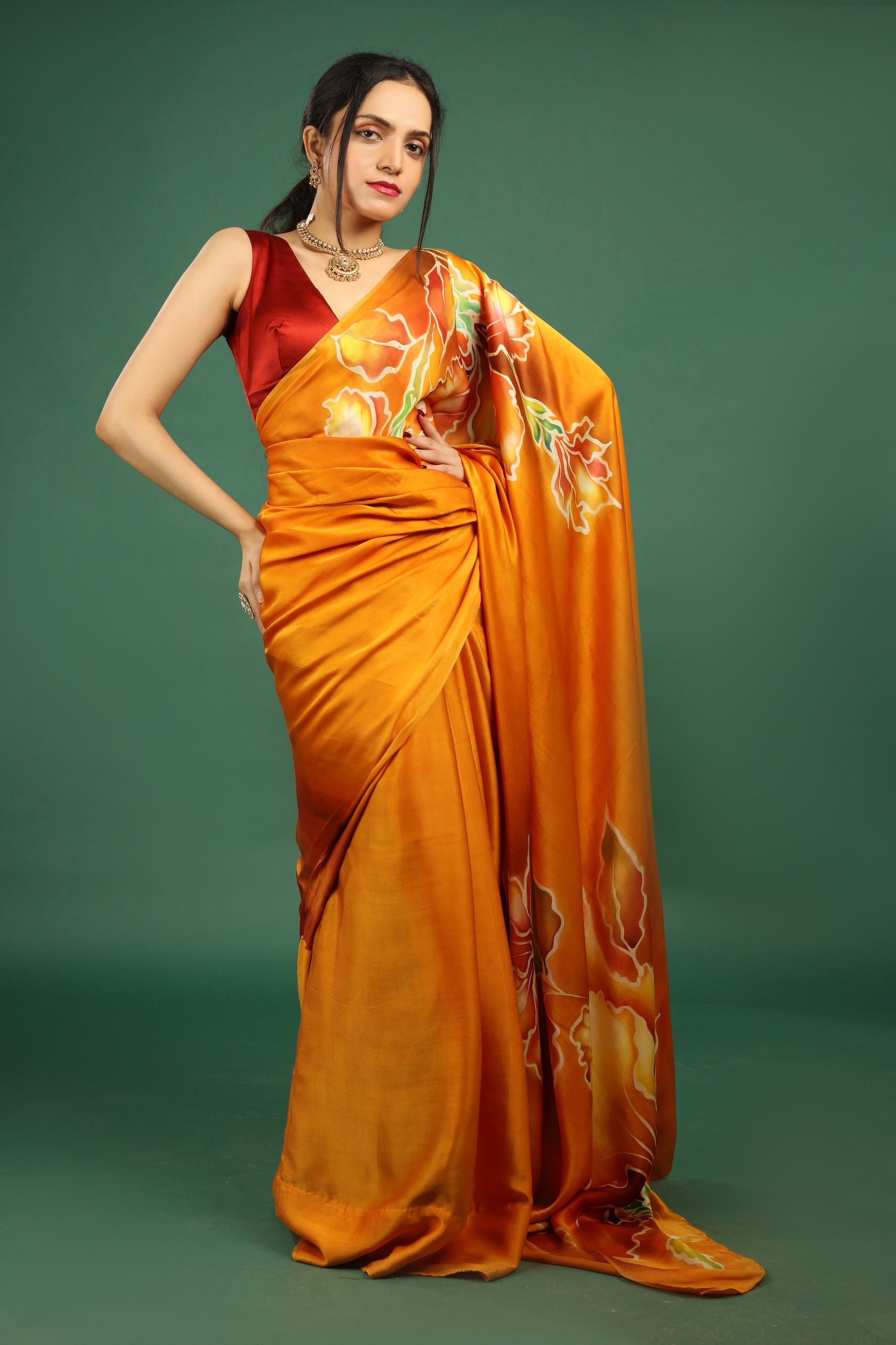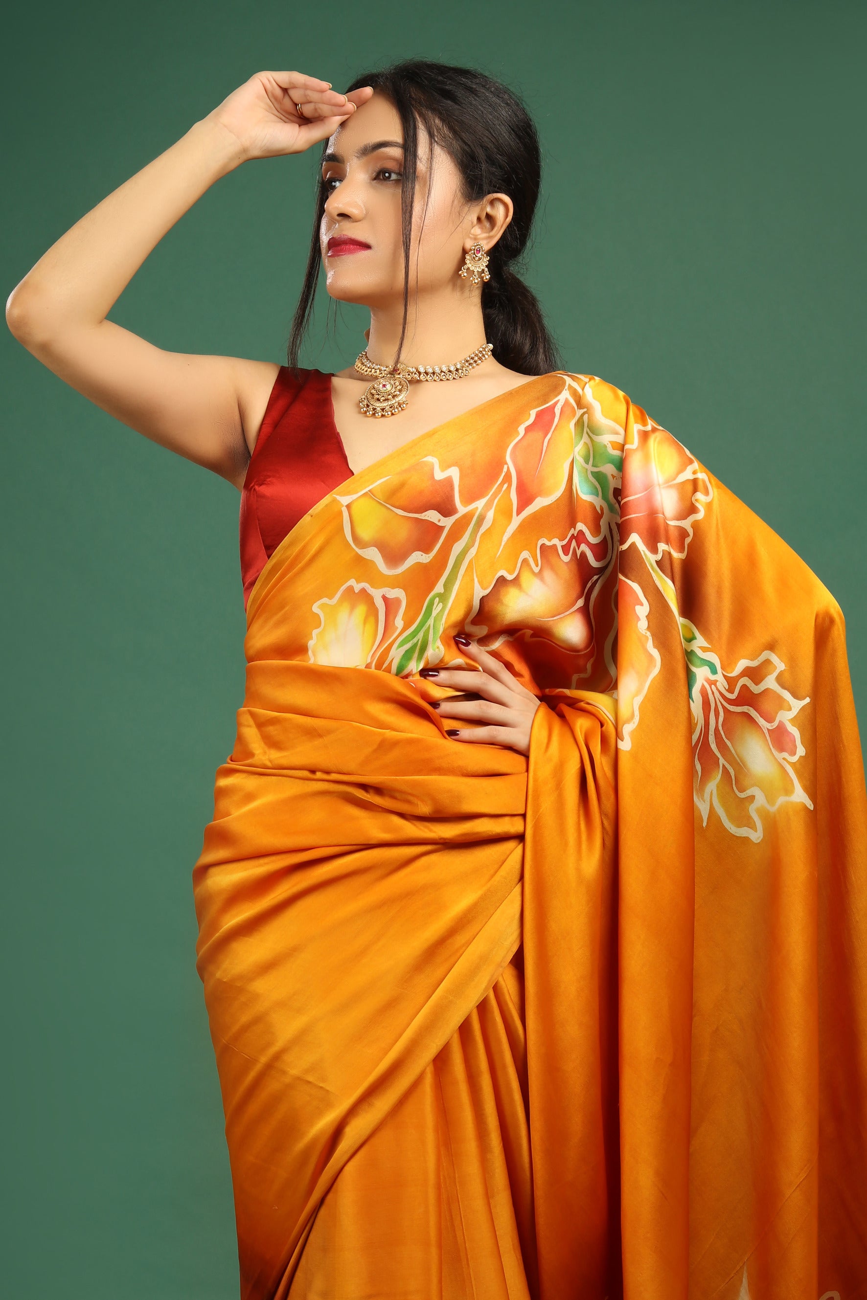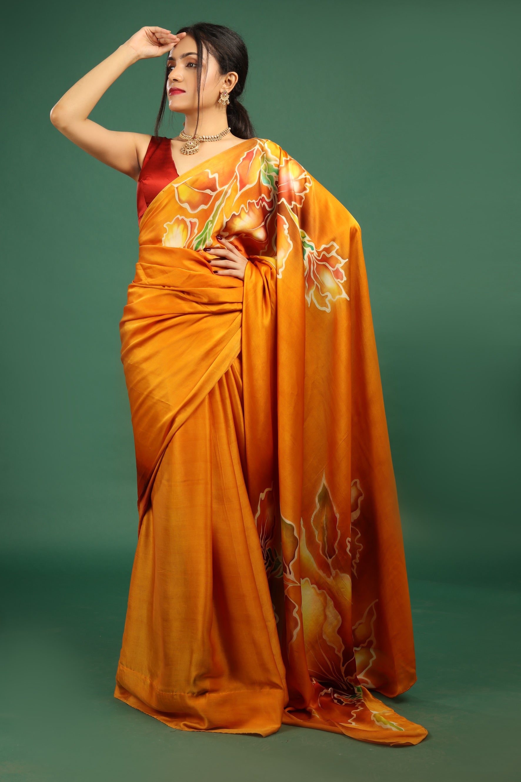 Vibrant Hand-Painted Pure Silk Satin Saree in Fiery Orange
