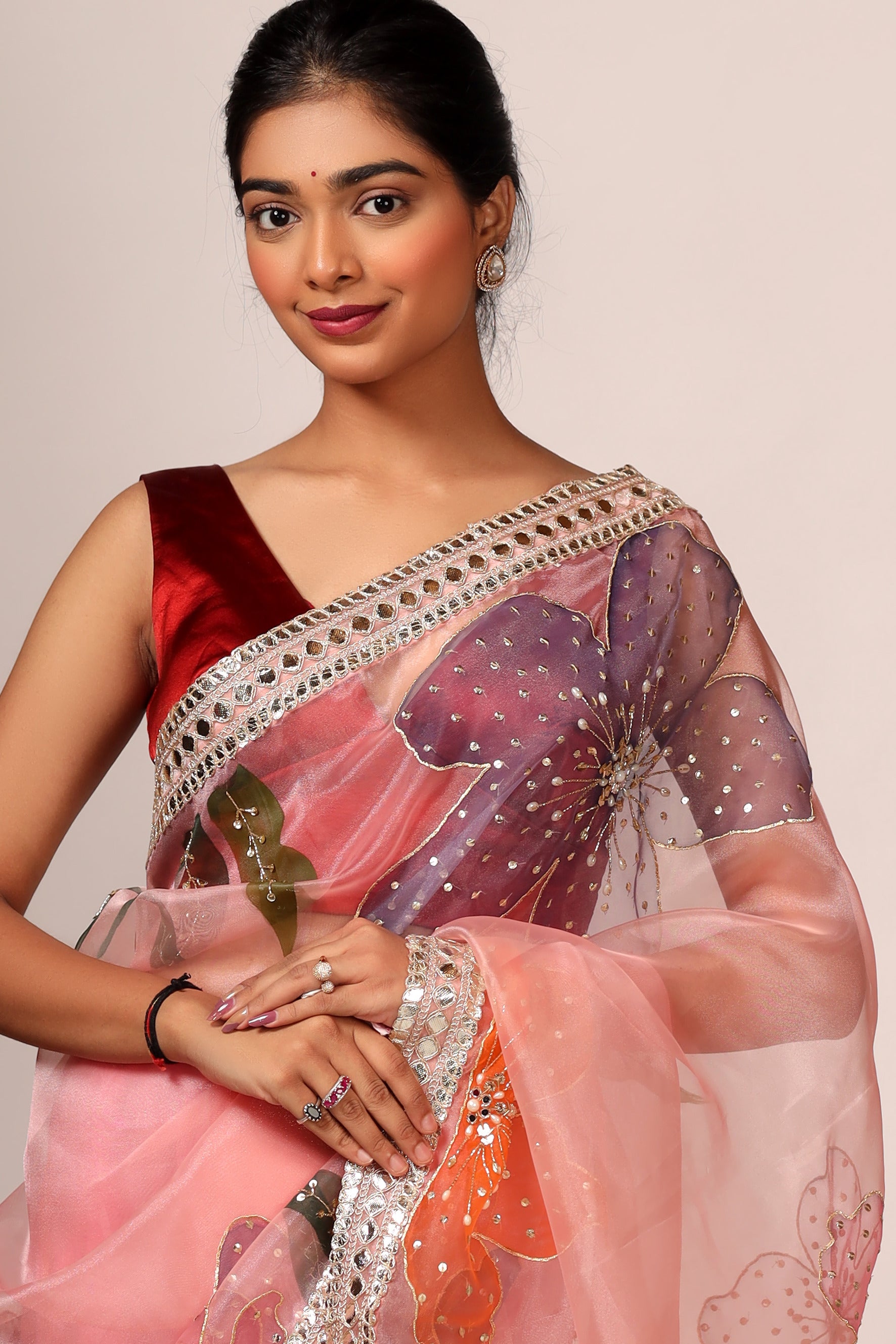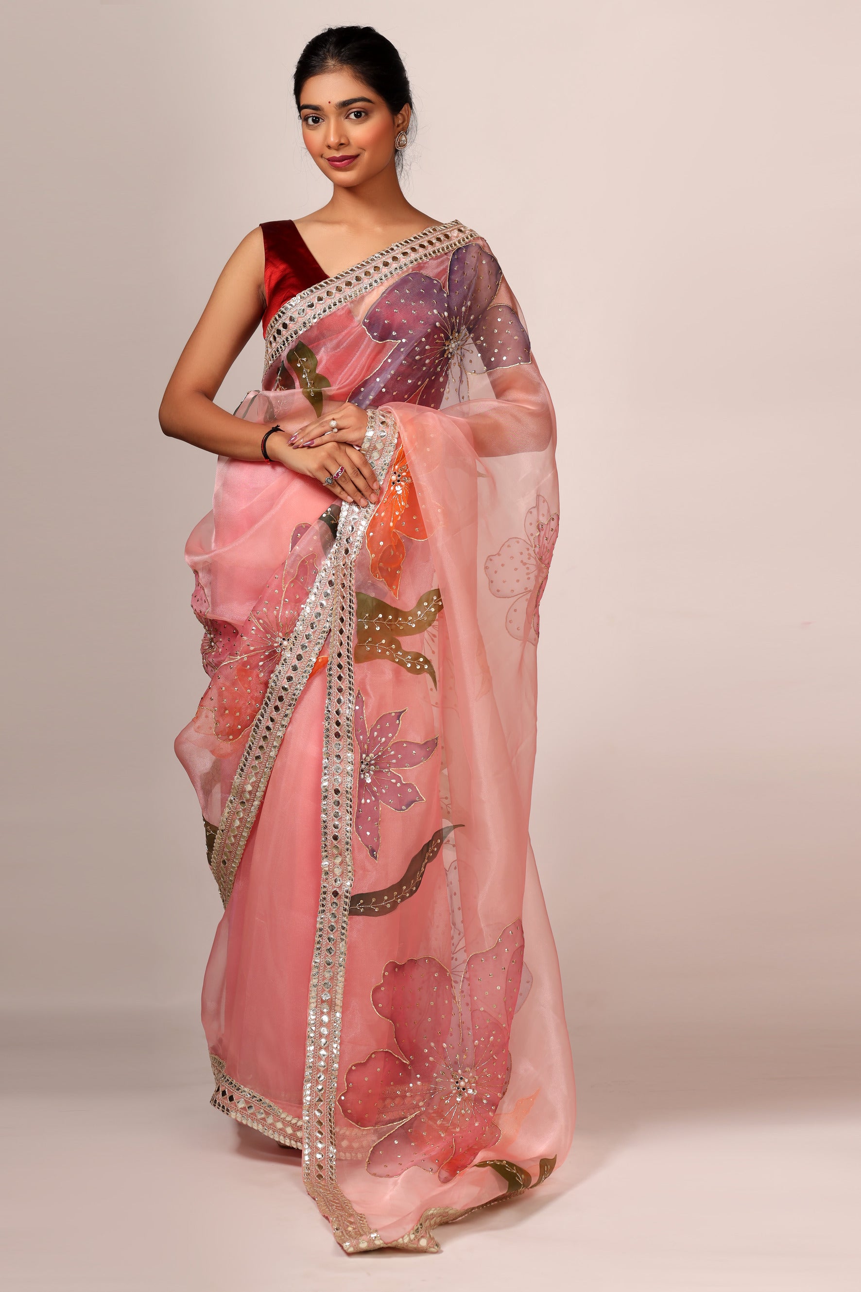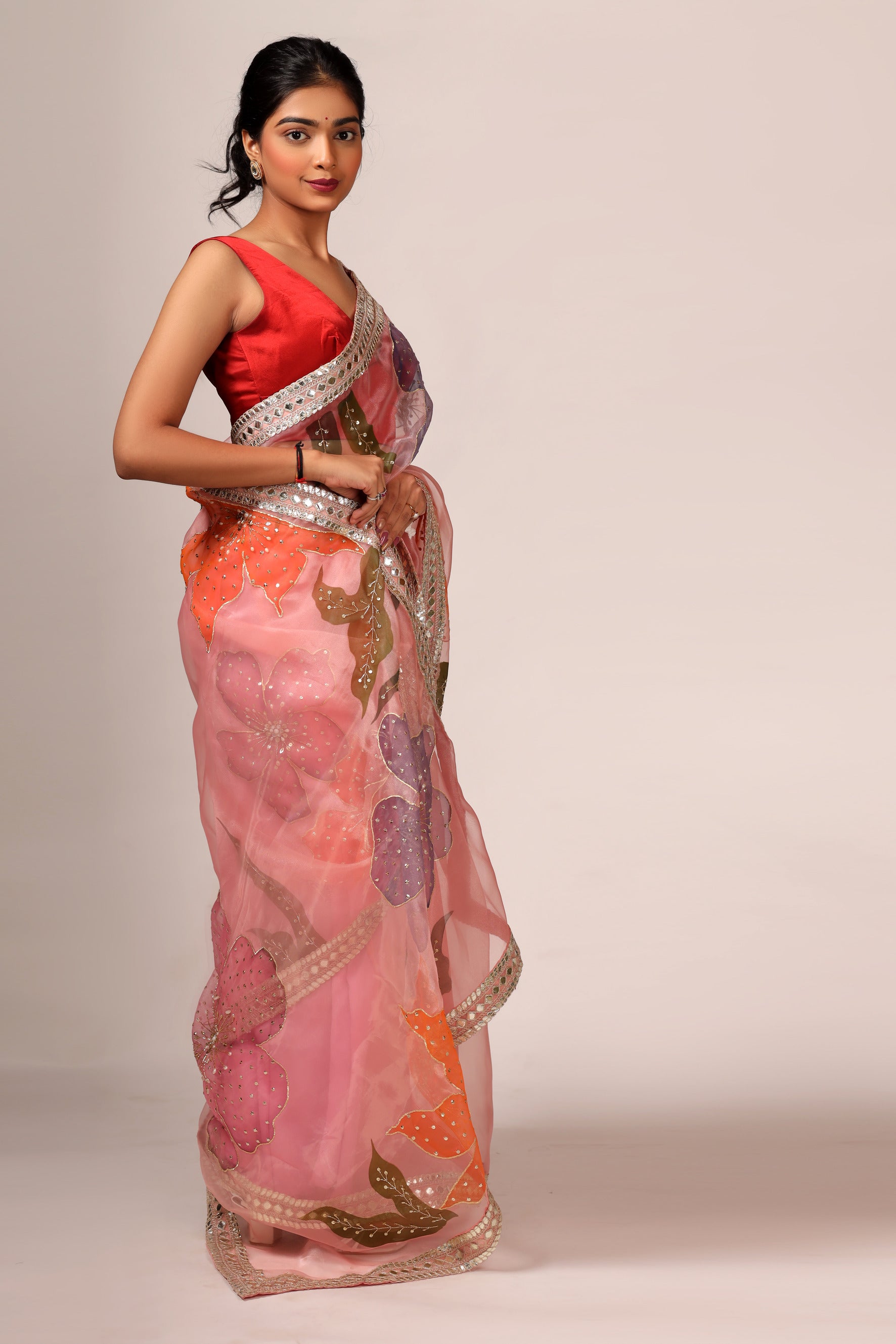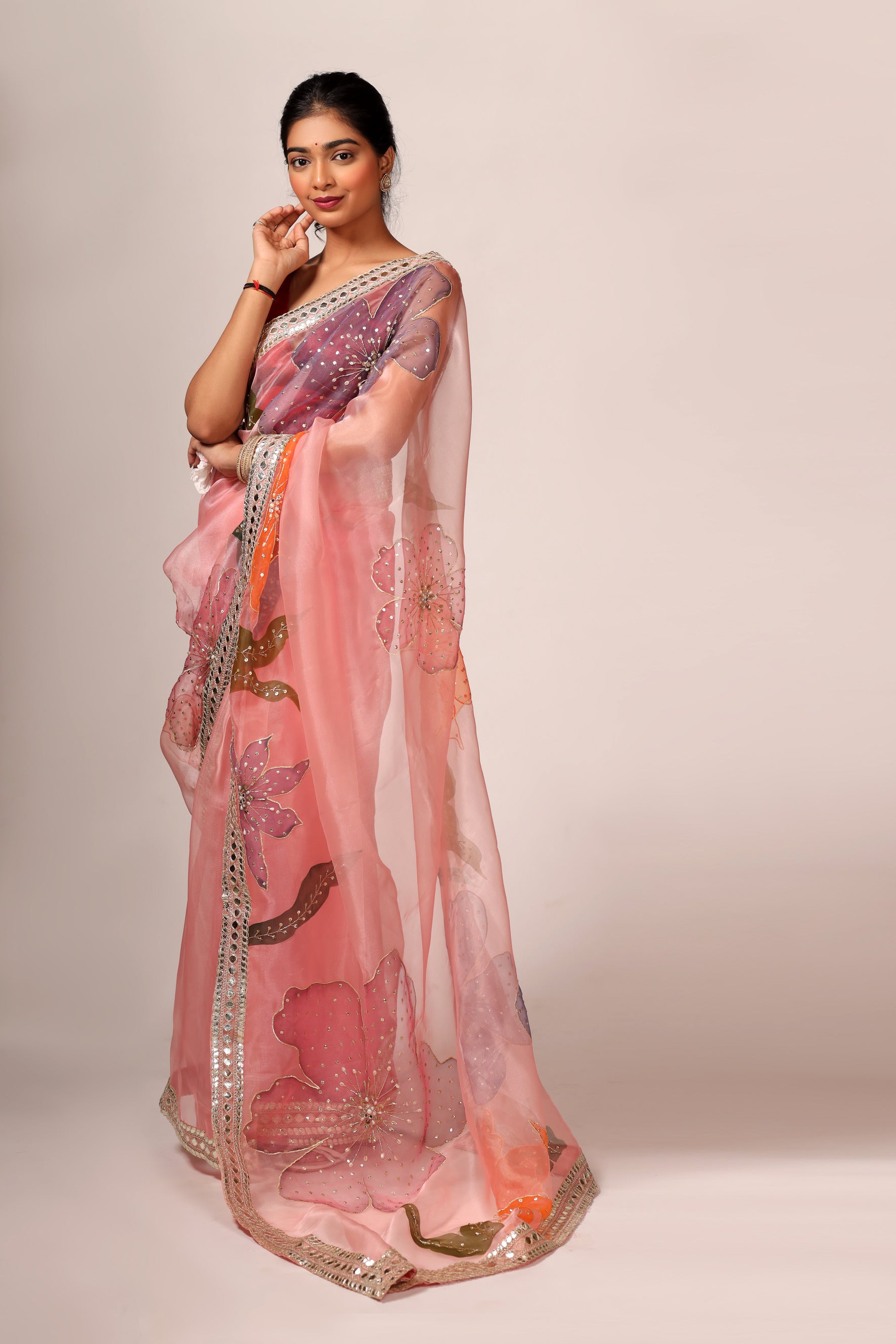 Experience elegance and luxury with our Luxurious Peach Pink Tissue Organza Saree Set. Made with high-quality tissue organza fabric, this saree set features a handcrafted border that is expertly hand painted using premium fabric paint. The saree set also includes a satin blouse piece in a beautiful peach pink color. Elevate your outfit with this stunning saree set.