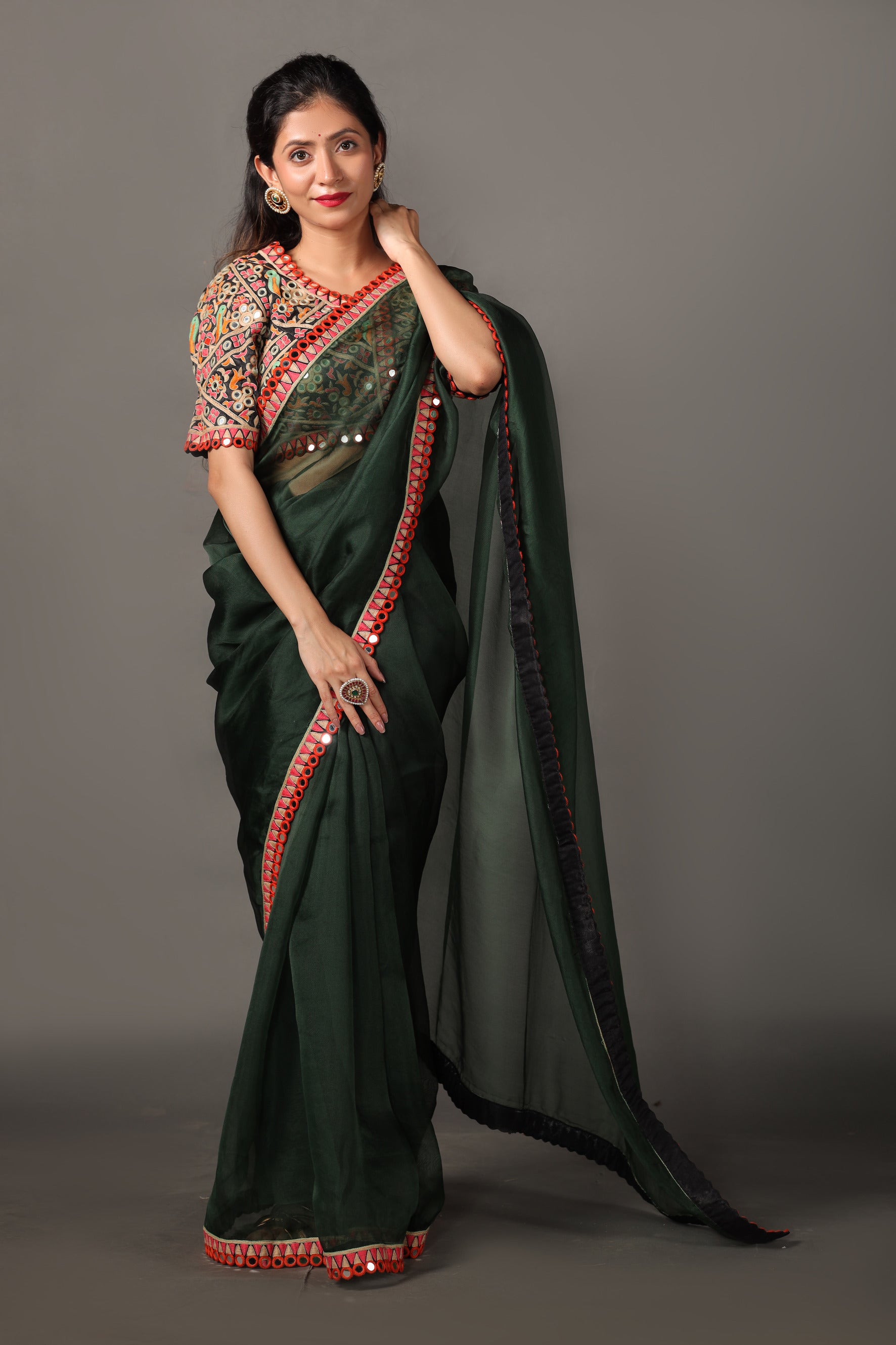 Moss Green Pure Silk Orzanga Saree with Hand Embroidery & Hand embroided Raw Silk Blouse