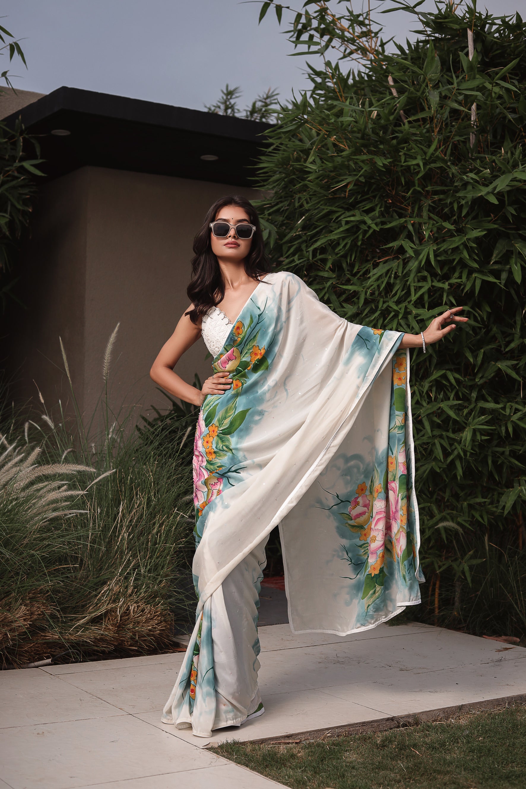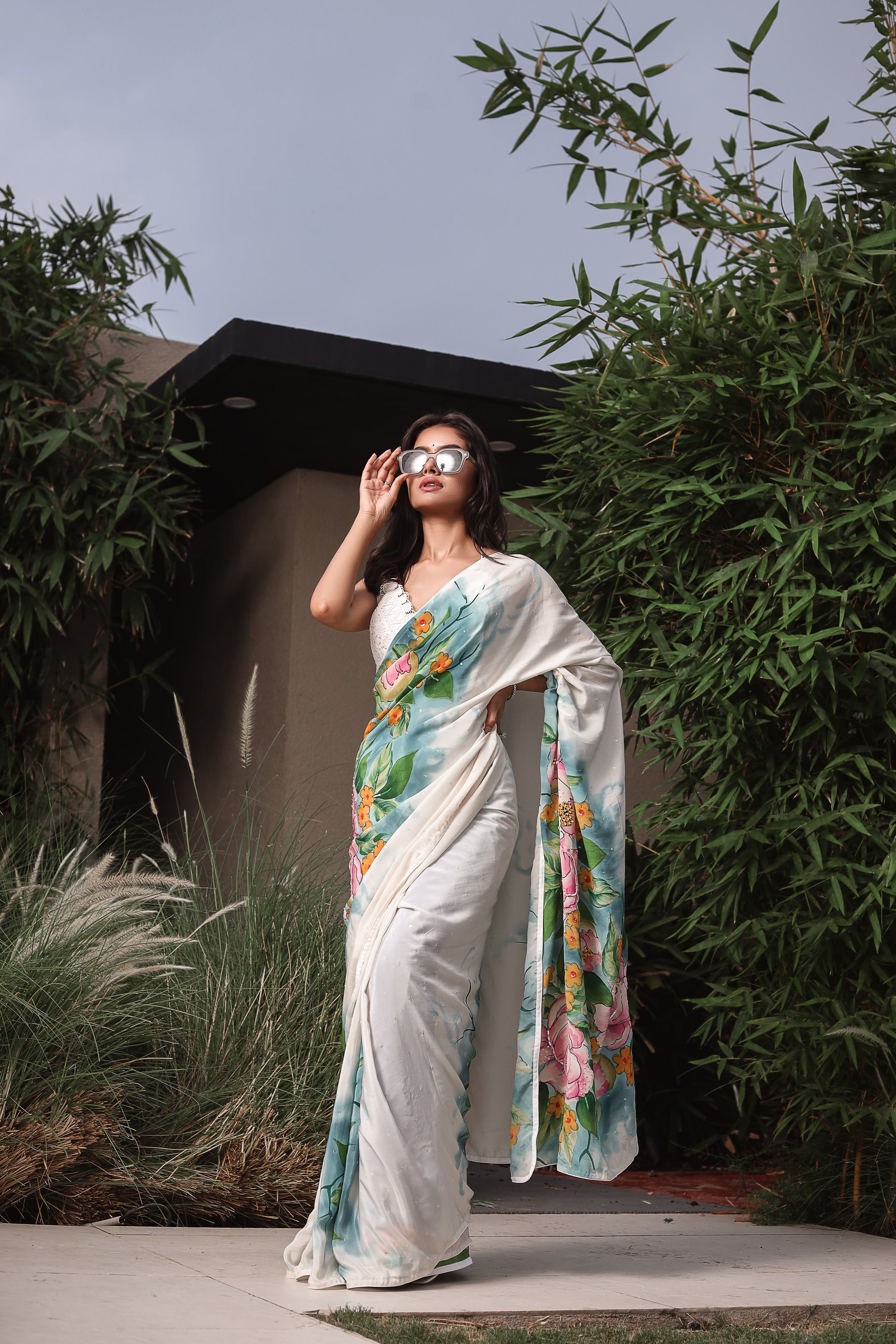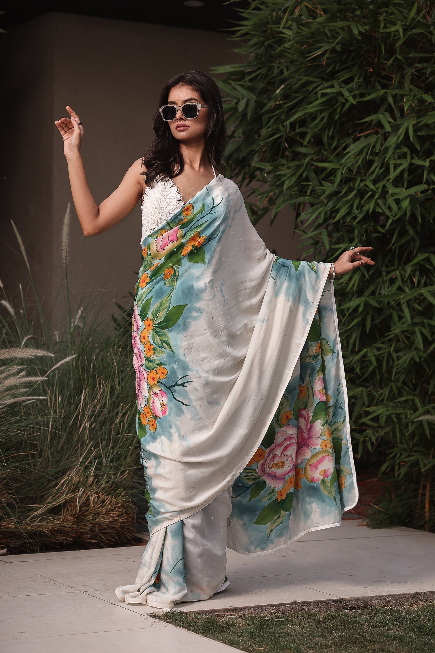 Experience the luxurious feel of 100% pure Malbari silk with our Off-White Malbari Silk Crepe Saree. Hand-painted with vibrant French dye and adorned with intricate embroidery, this saree is a masterpiece of craftsmanship. The unique combination of off-white and multi colors adds a touch of artistic elegance, making it perfect for special occasions. Complete with a standard size blouse piece.