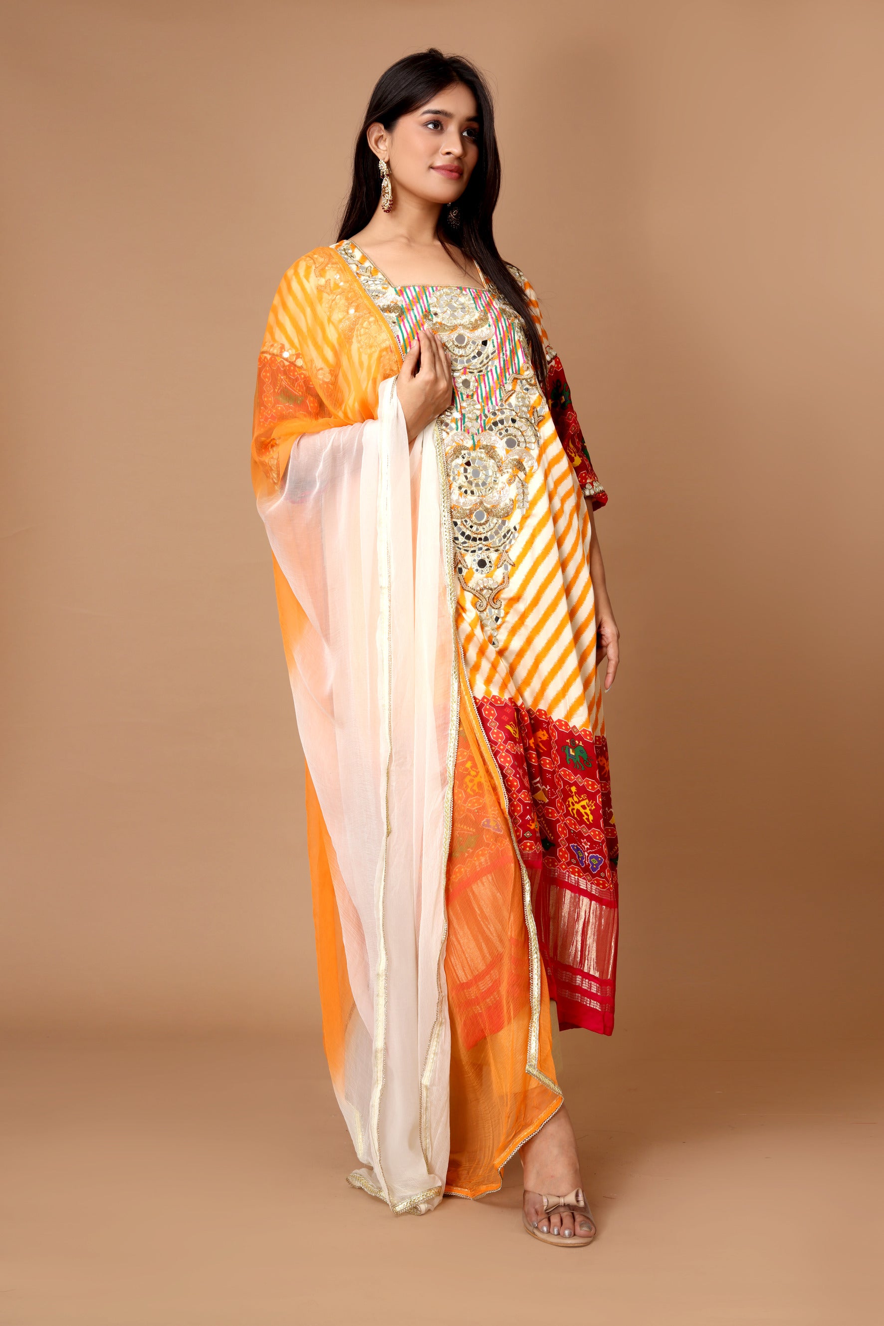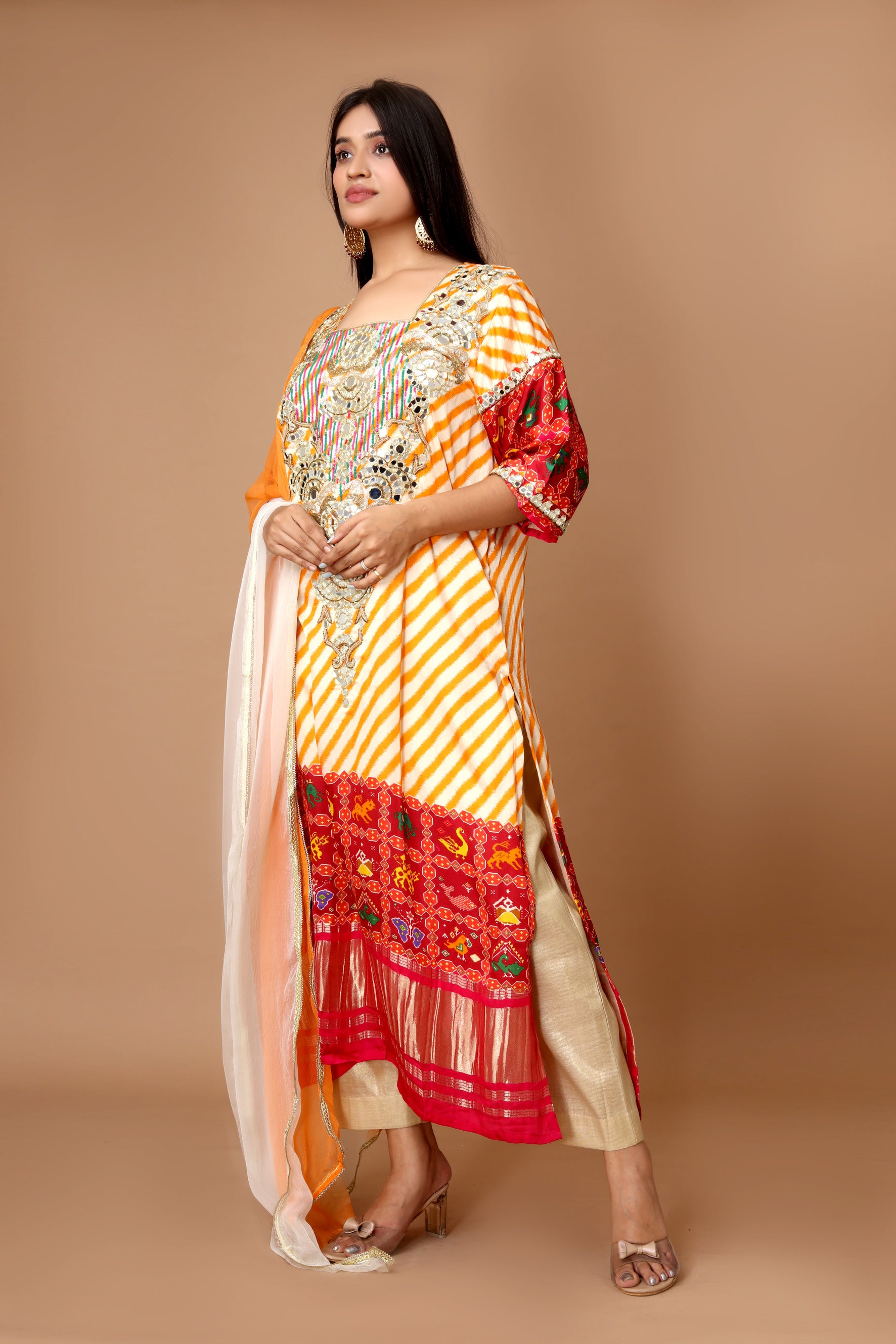 Off-White Modal Satin Kurta Set with Hand-Embroidered Mirror Work & Chiffon Dupatta