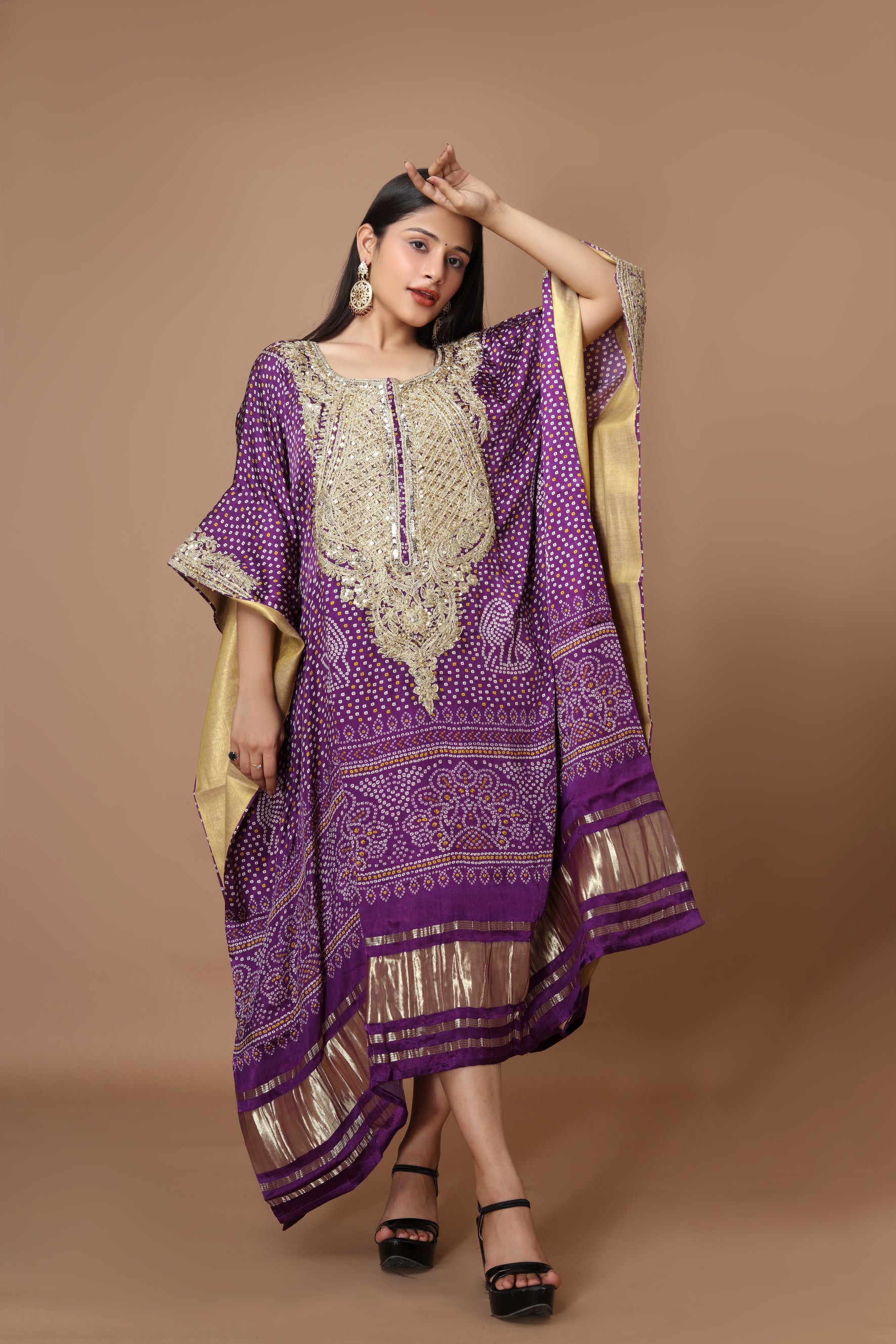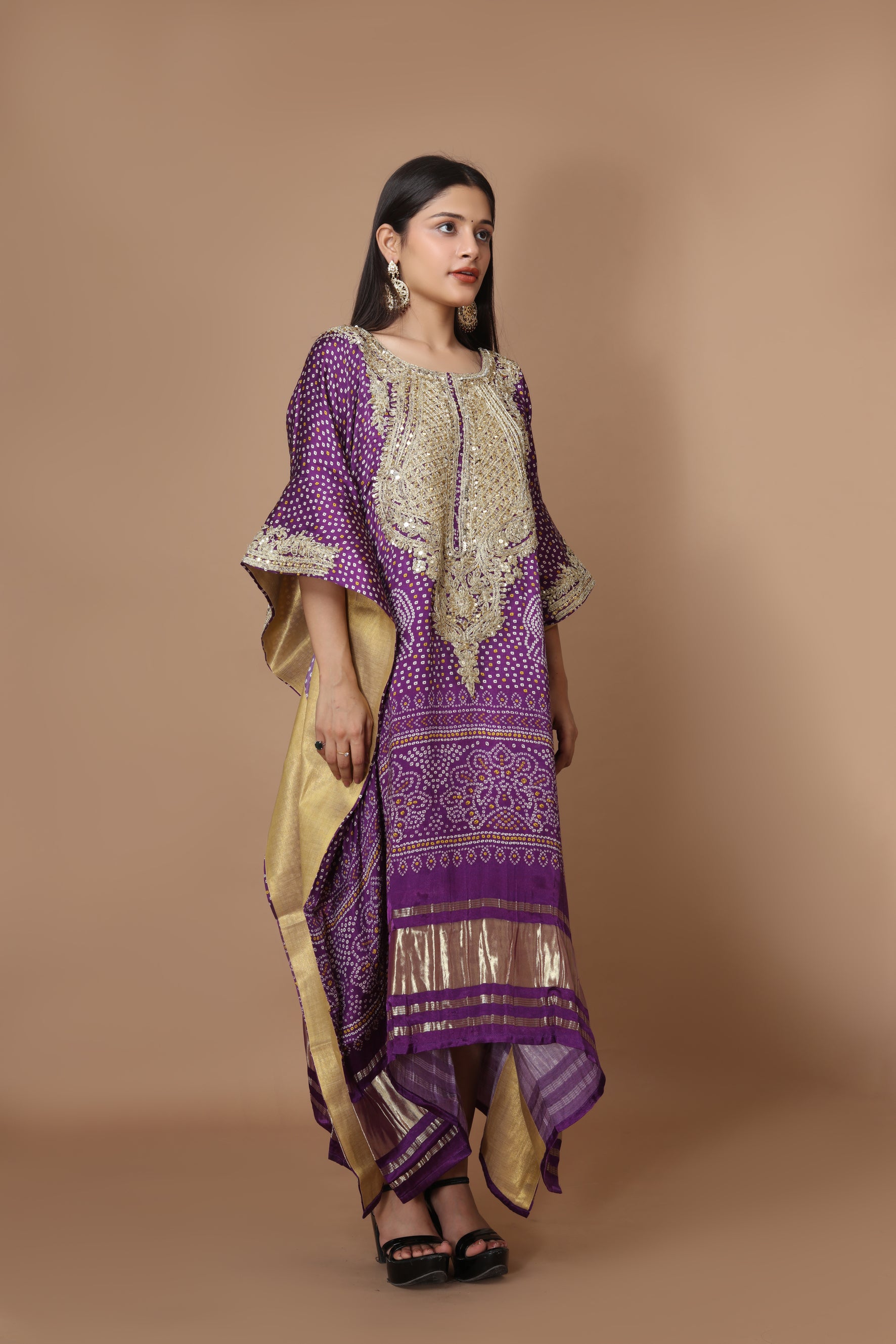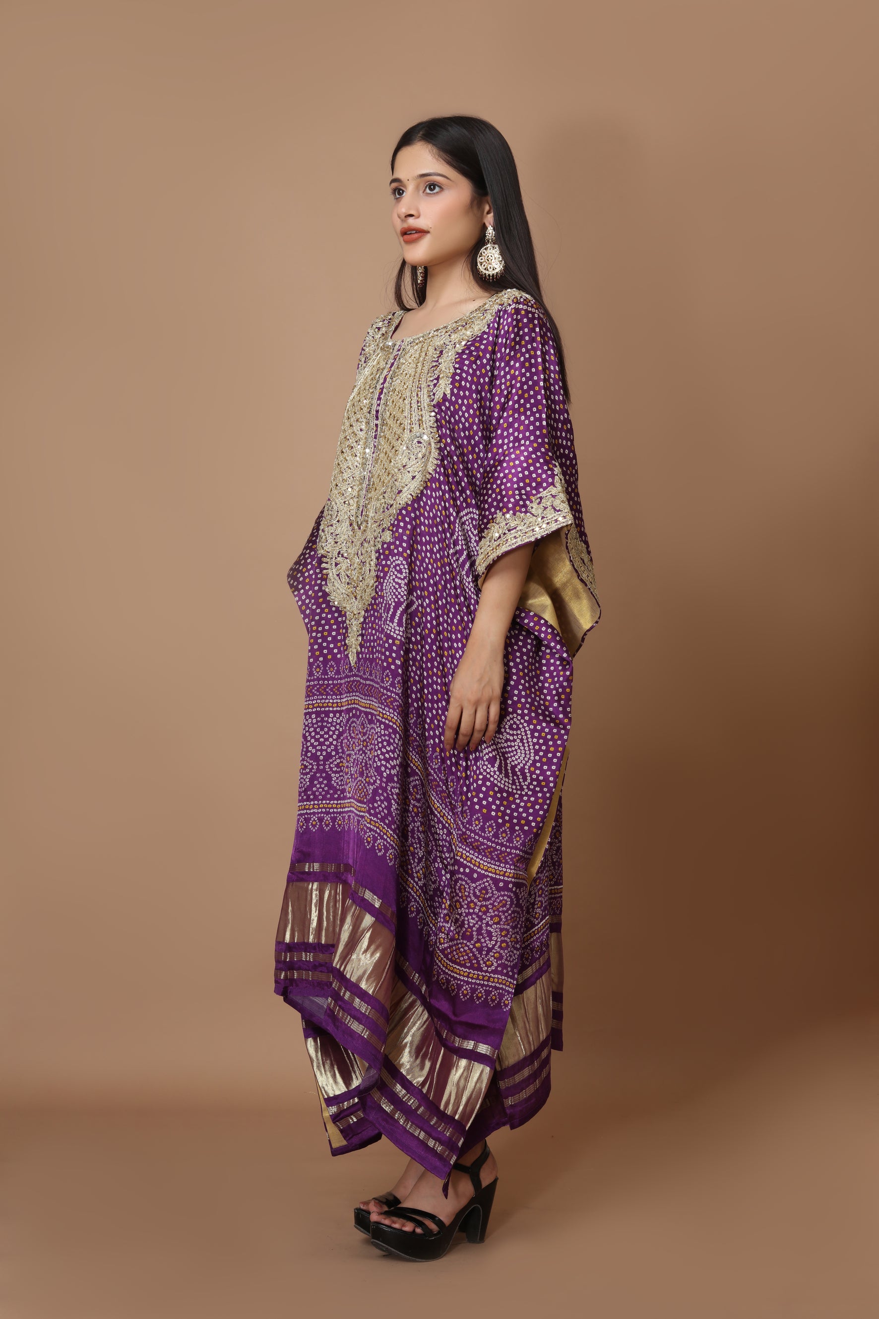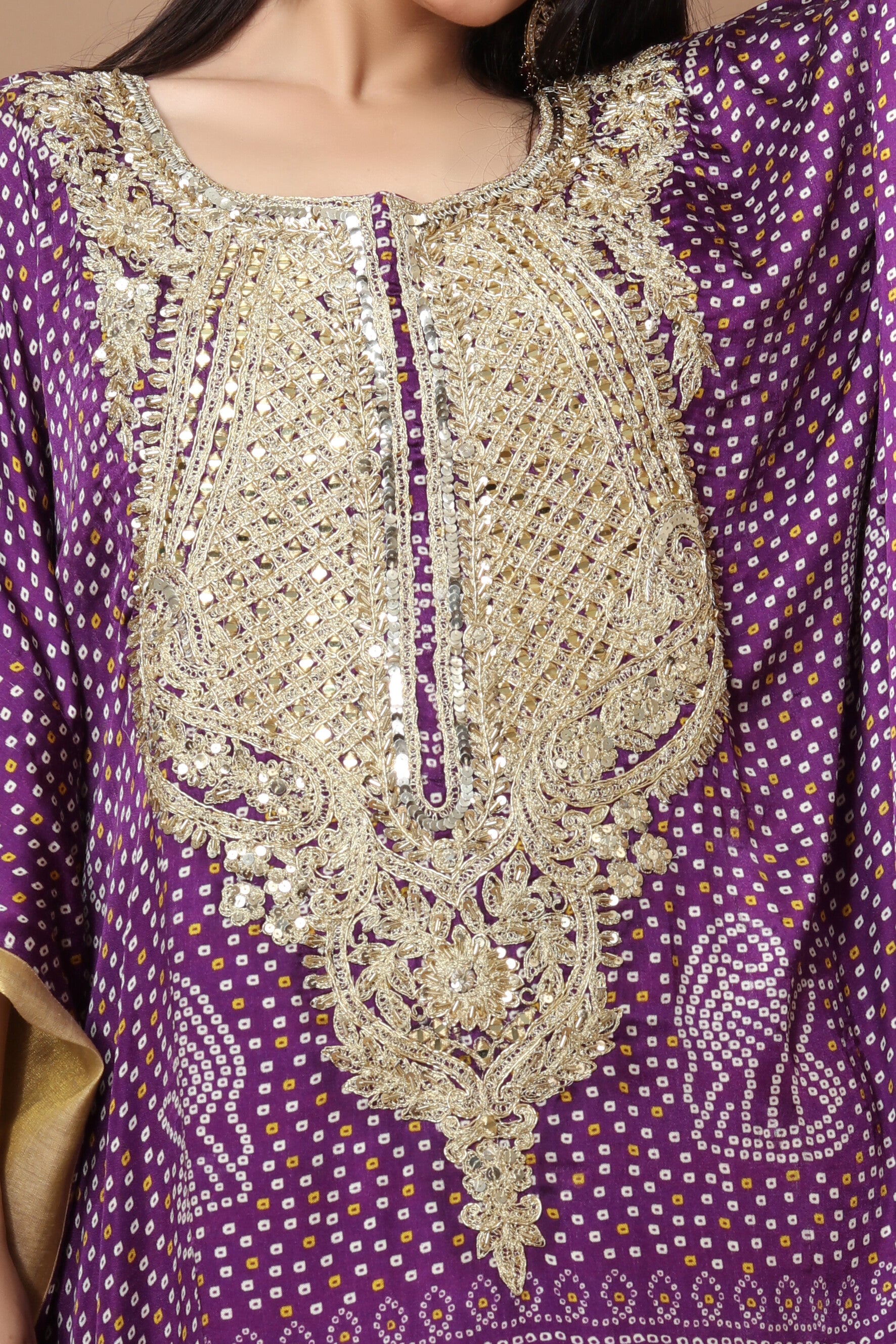 Purple Modal Silk Bandhni Printed Kaftan with Zari Dori & Hand Embroidery