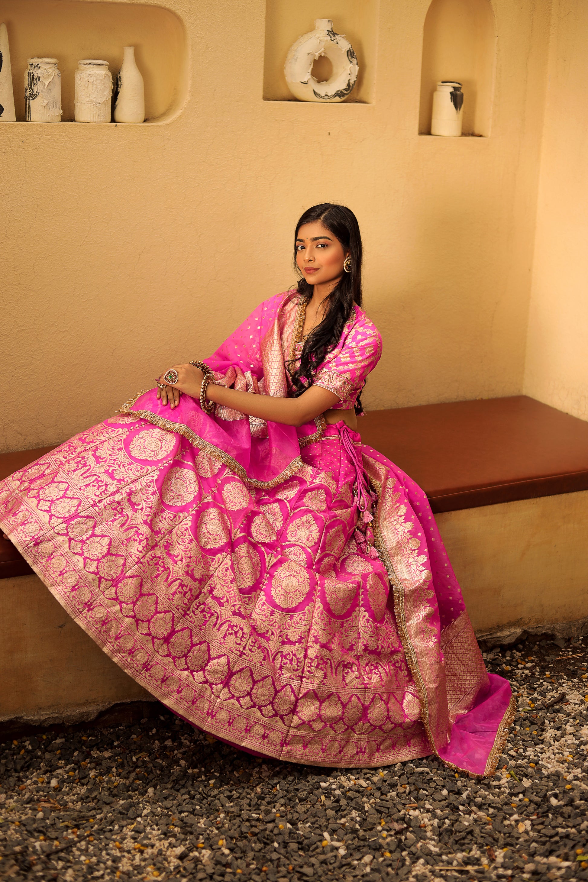 This exquisite lehenga is crafted from Organza Banarasi fabric and features intricate weaving and hand embroidery. The vibrant Gulal pink color adds a festive touch, while the santoon and cancan lining provide structure and comfort. This lehenga is perfect for traditional celebrations and special occasions.
