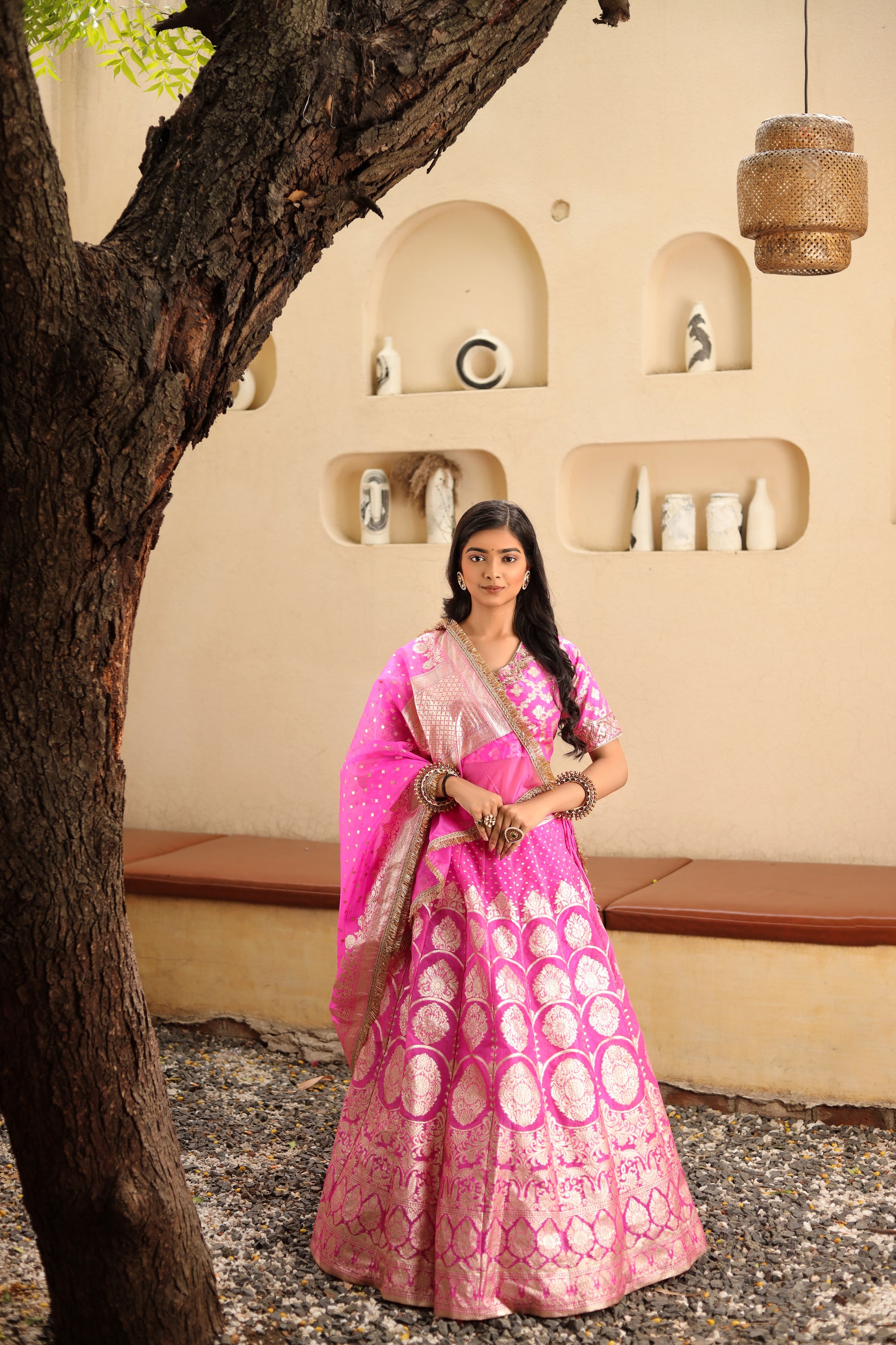Woven and Hand-Embroidered Banarasi Organza Lehenga in Gulal Pink