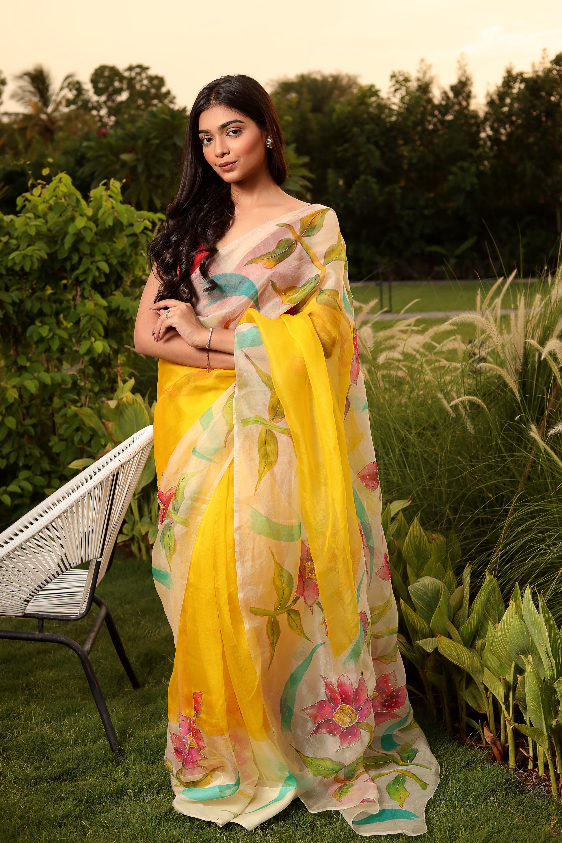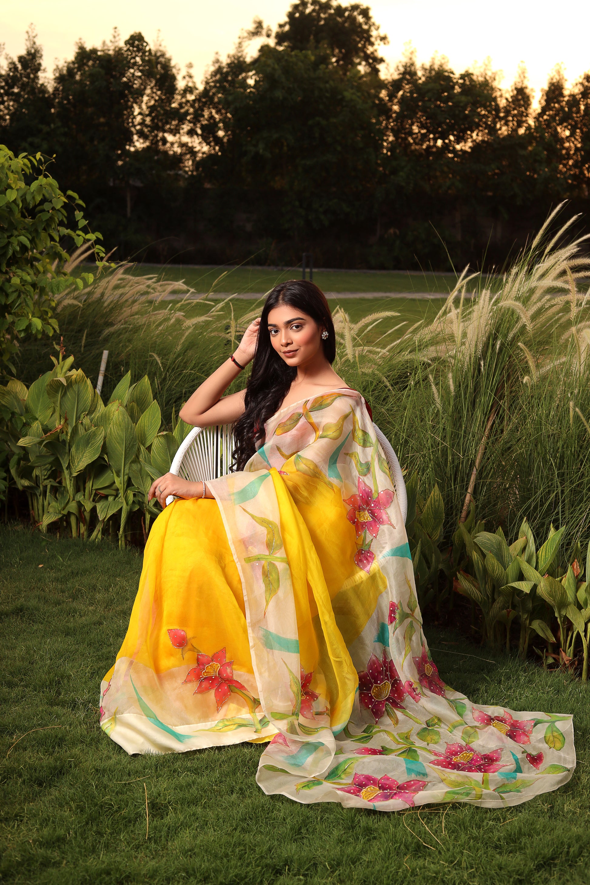 Brighten up any occasion with our radiant yellow hand-painted silk saree, adorned with exquisite floral motifs. The vibrant yellow hue and delicate hand-painted design make this saree a perfect choice for festive celebrations and special events. Crafted from premium silk, it offers a luxurious drape and an elegant feel. Each saree is a unique work of art, reflecting the skill and creativity of our artisans. Enhance your ethnic wardrobe with this stunning piece from Label Priyanka Jha.