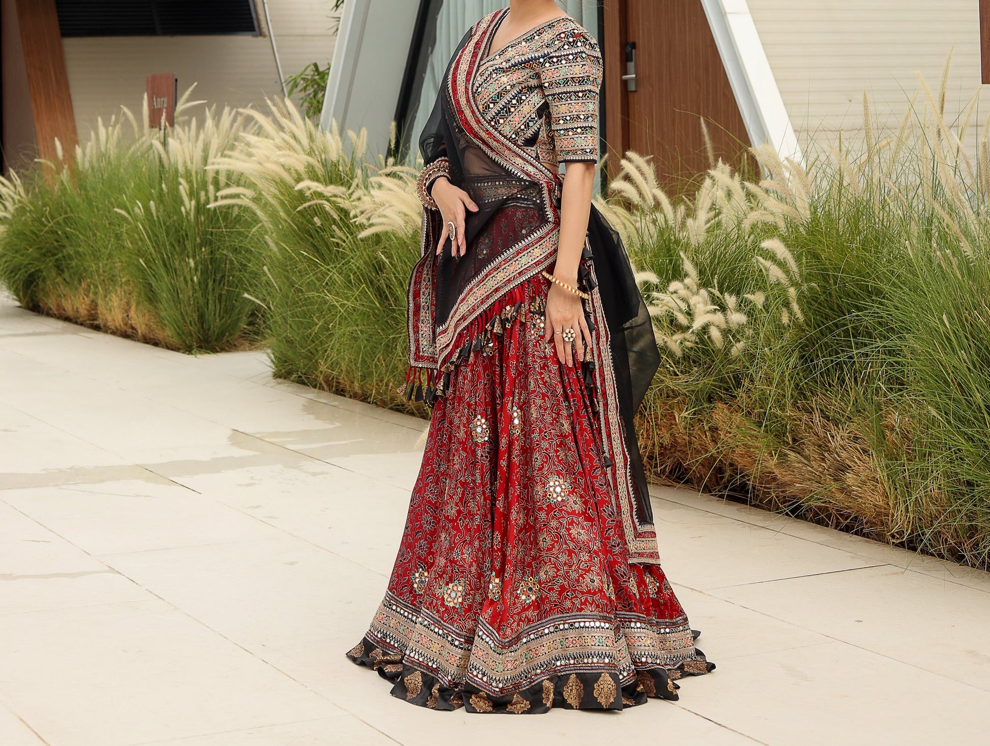 Hand Block Printed Ajrakh Lehenga with Aari Embroidery