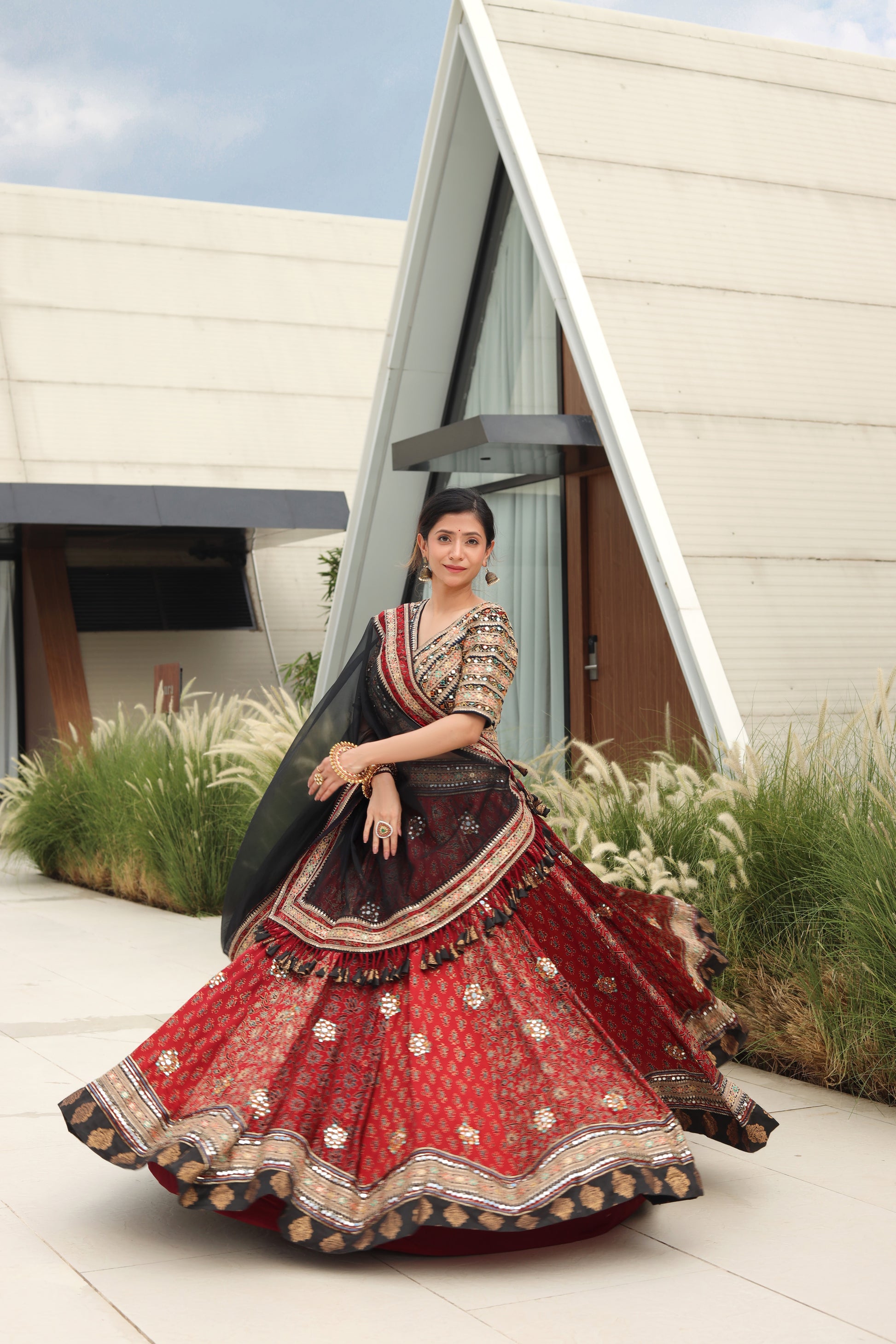 Made from modal silk, organza, and Banarasi silk, this earthy red lehenga features intricate hand block printed Ajrakh, combined with detailed hand and Aari embroidery. The ensemble includes a santoon and cancan lining, offering a blend of traditional craftsmanship and rich textures. Perfect for grand occasions, this lehenga stands out with its vibrant colors and fine detailing.