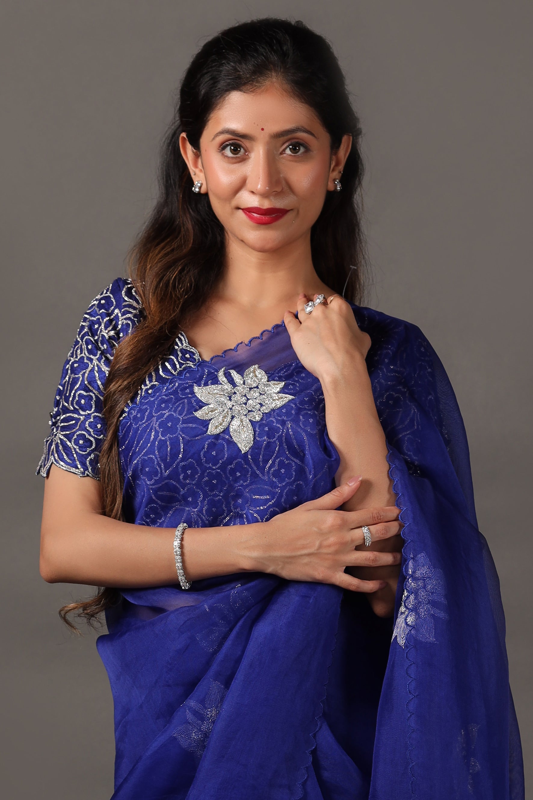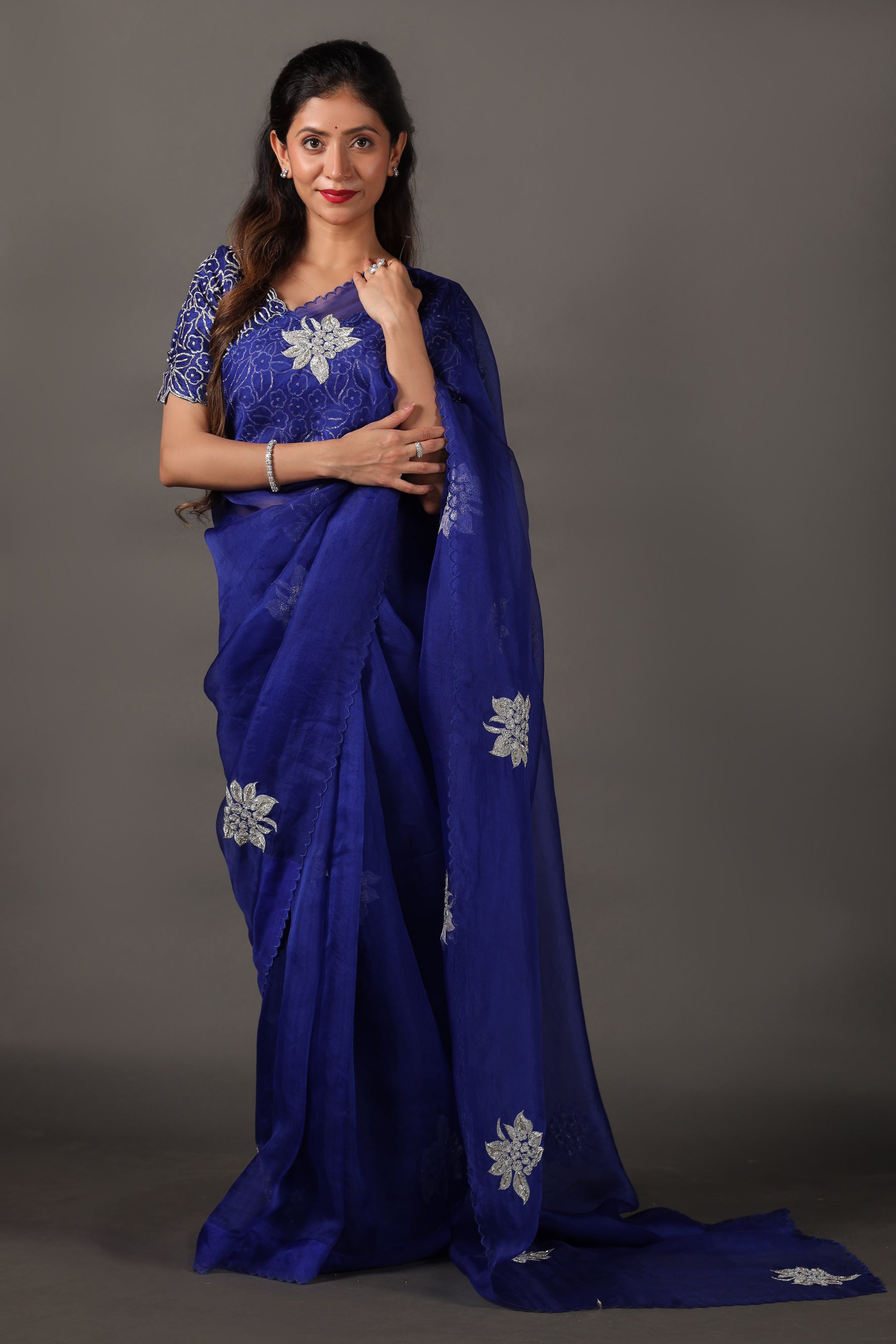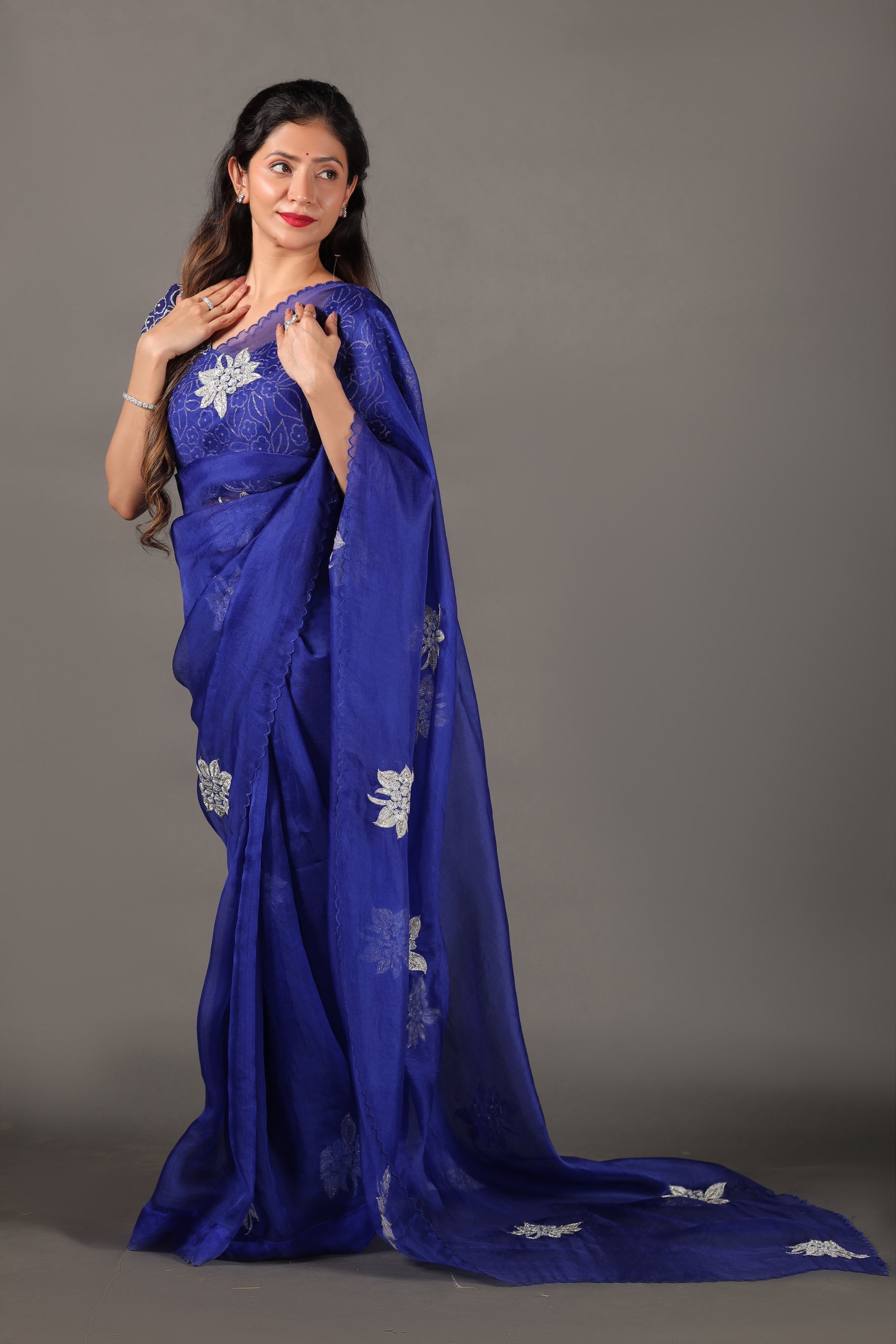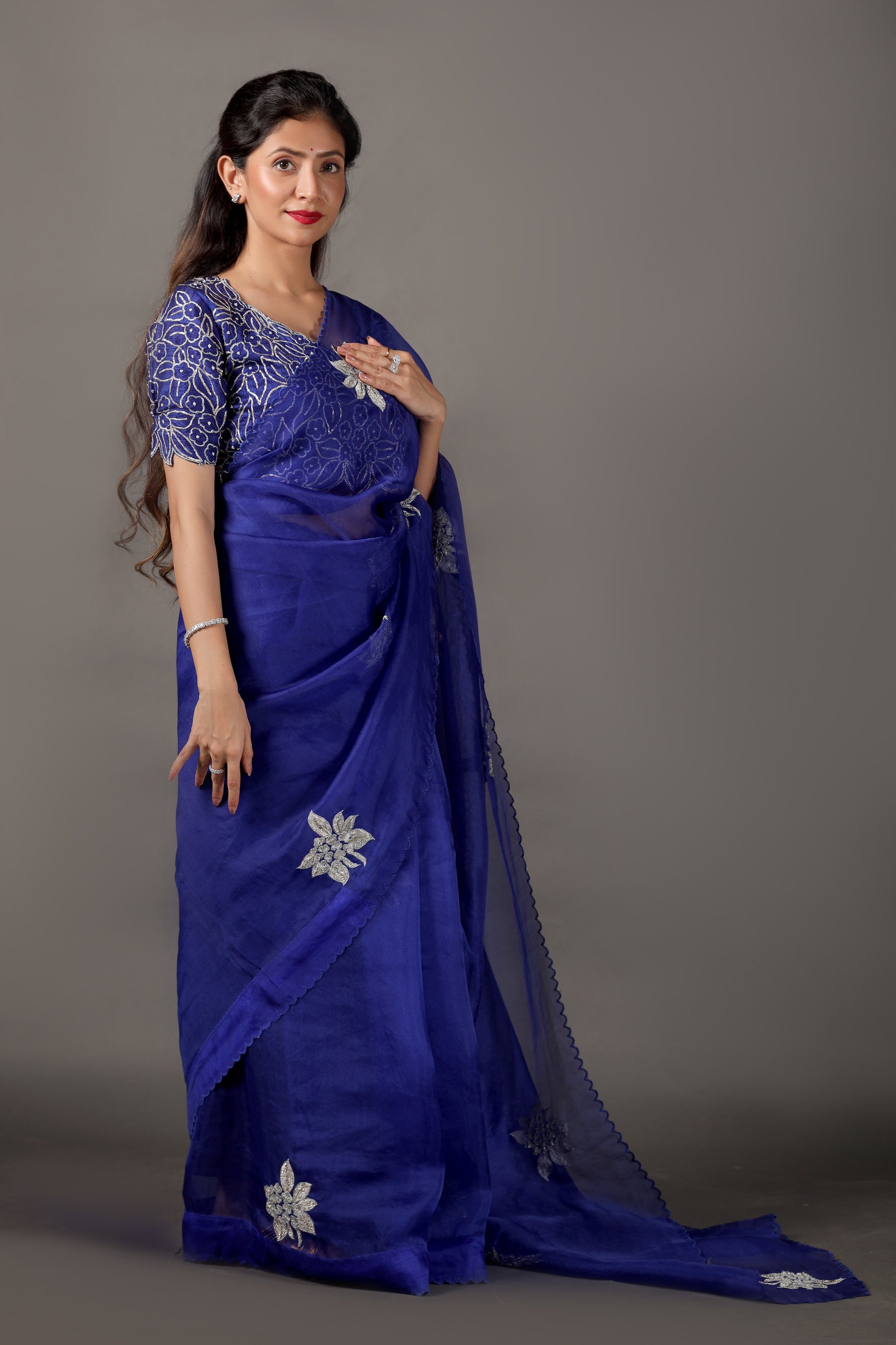 Royal Blue Pure Silk Saree with Hand Embroidered Pittan Work & Raw Silk Blouse