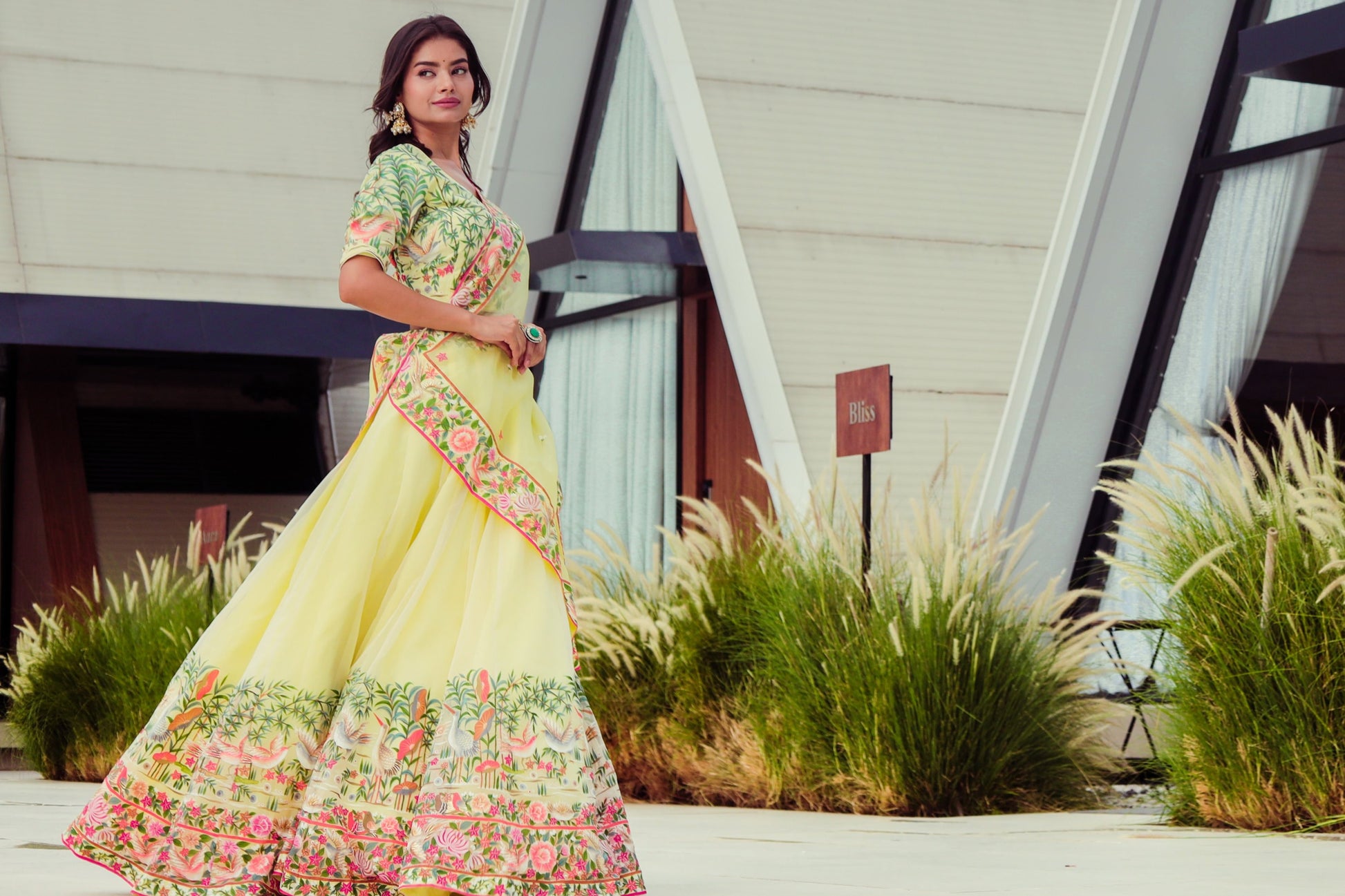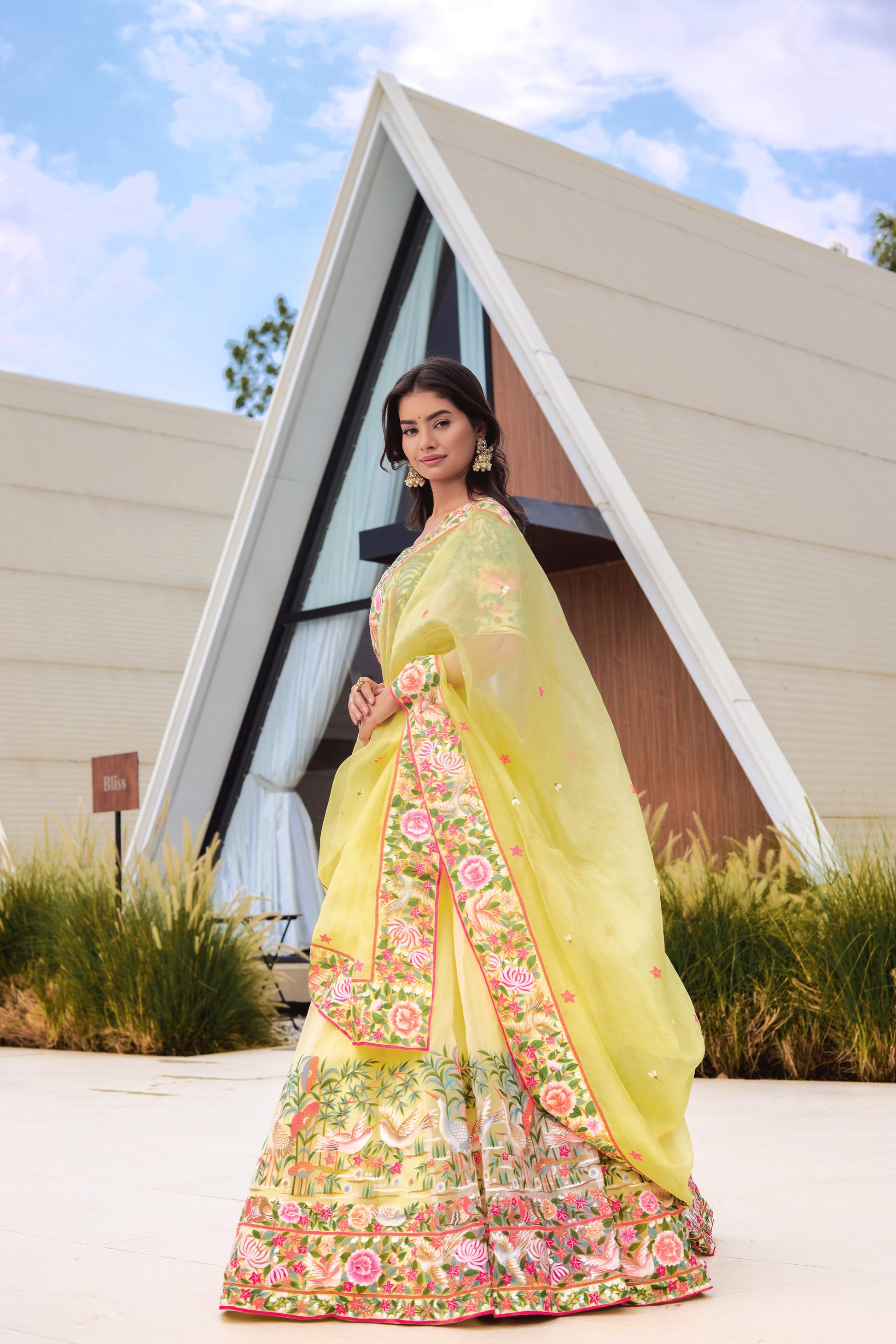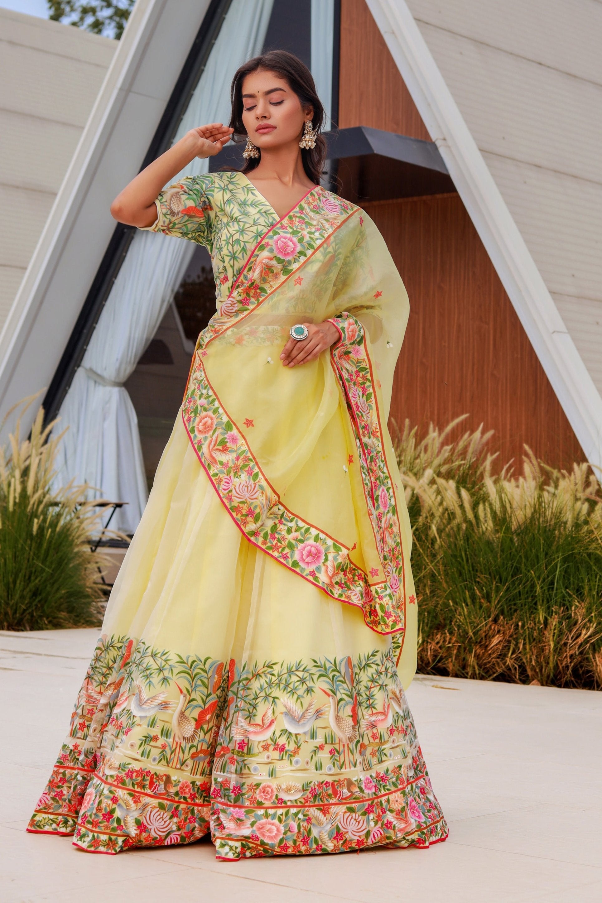 This delicate yellow lehenga is made from pure silk organza and features intricate hand-painted designs along the border.
