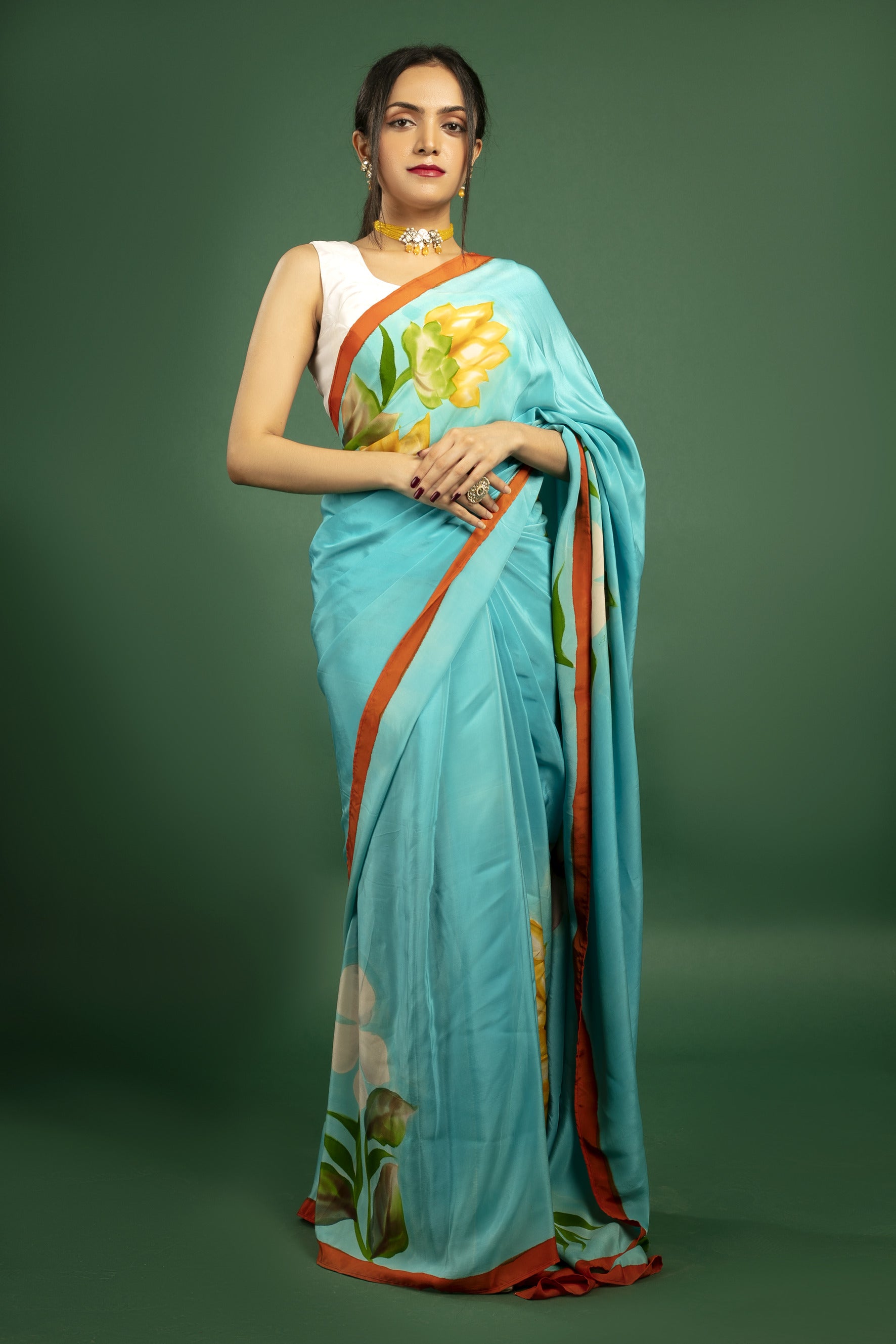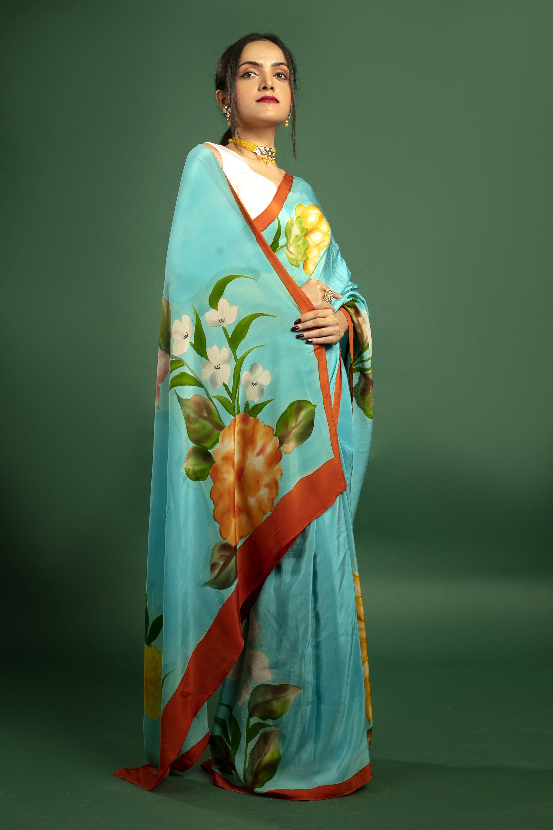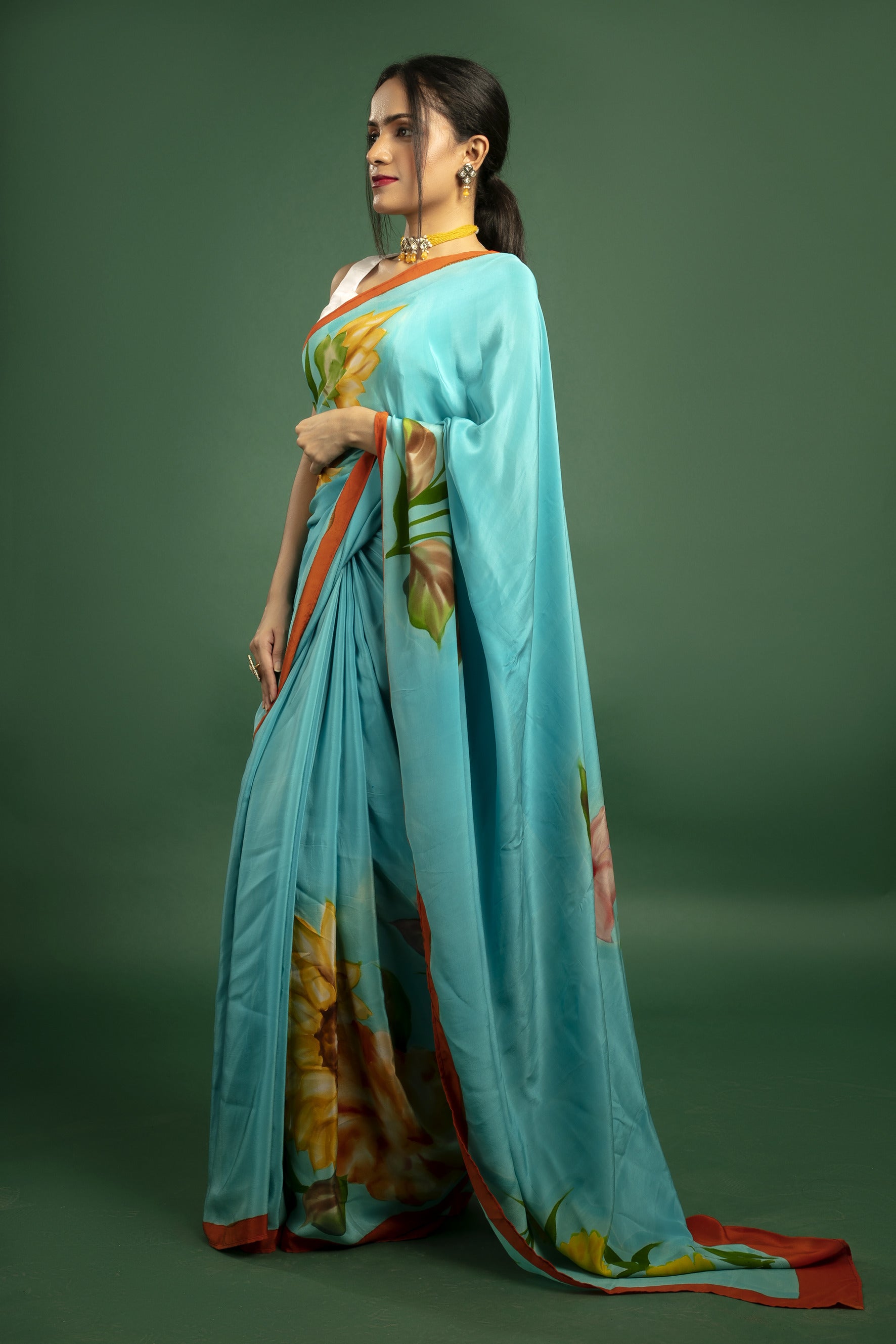Achieve an exotic and elegant look with our Turquoise Blue Malbari Silk Crepe Saree. Its unique hand-painted French dye adds a touch of luxury while the multi-color blouse adds a pop of personality. Made from high-quality silk, this saree is perfect for any occasion with its smooth and lightweight feel.